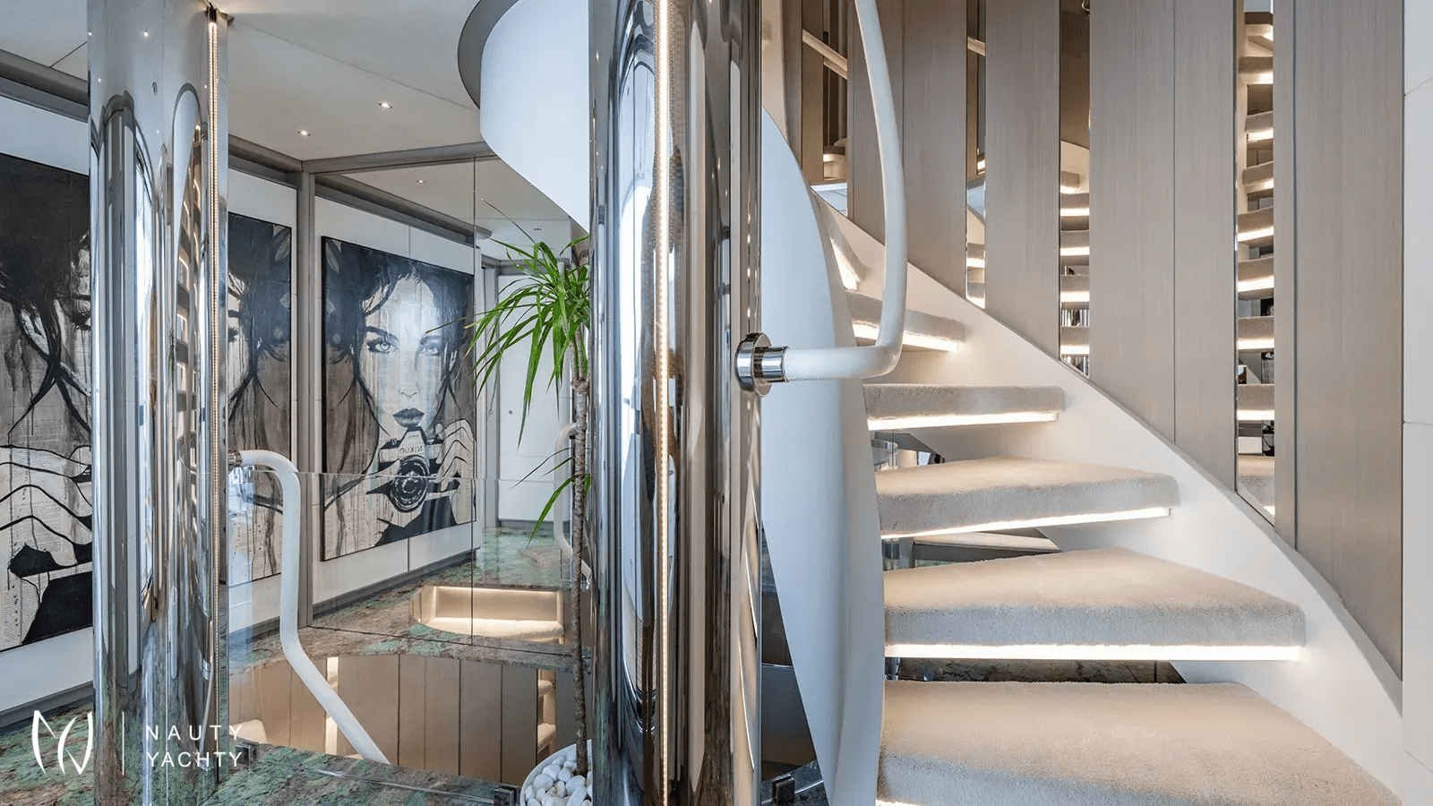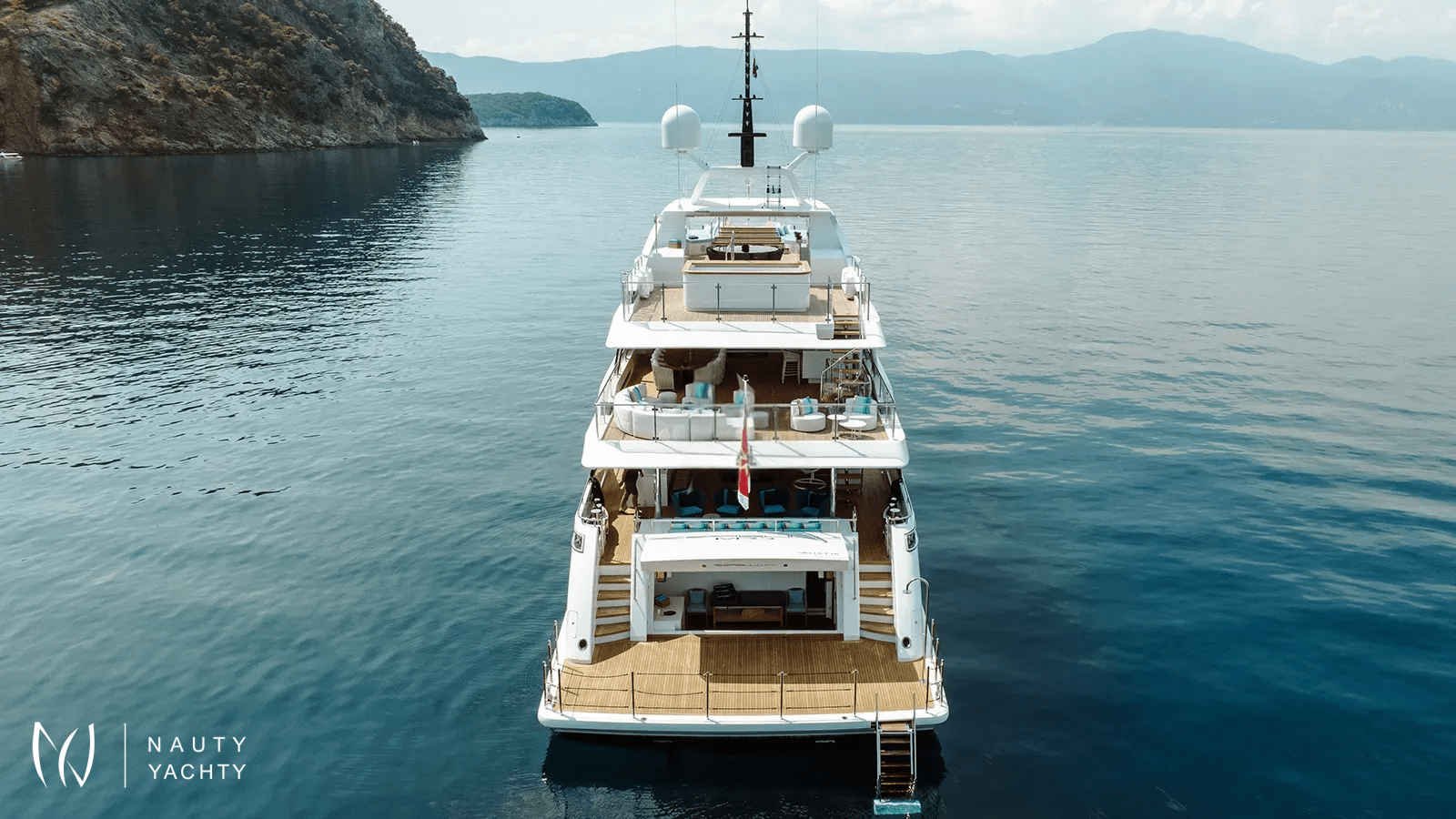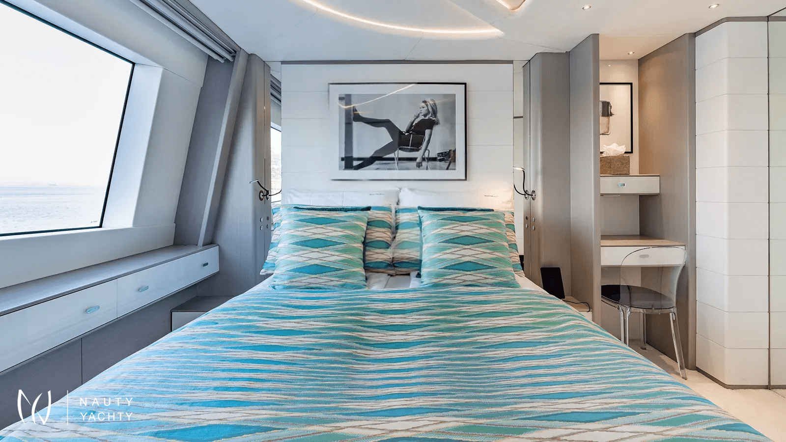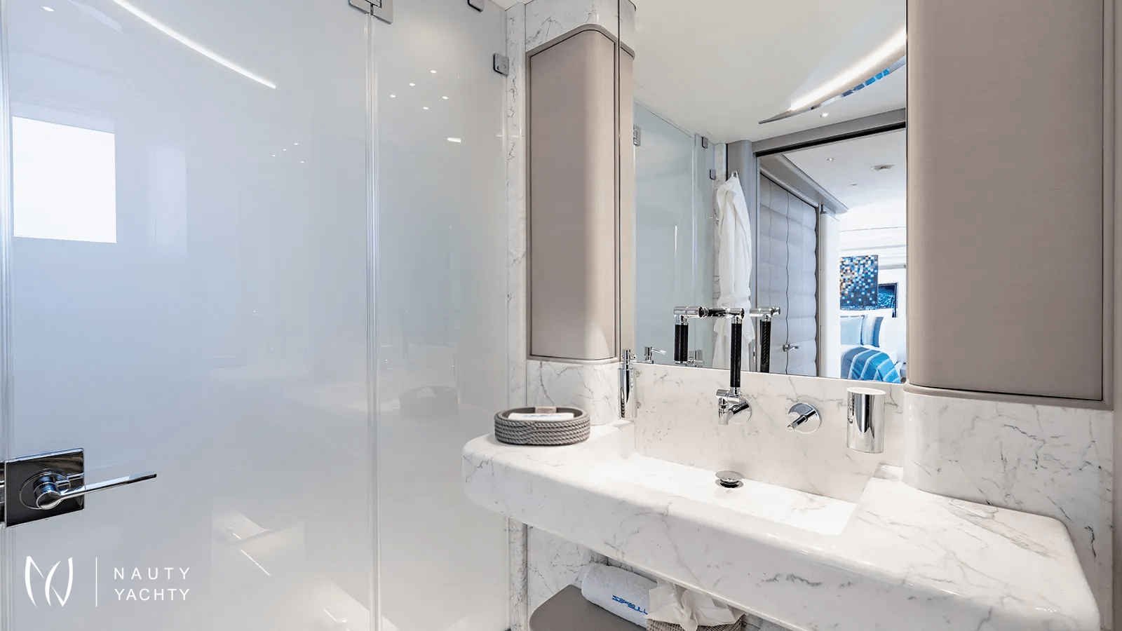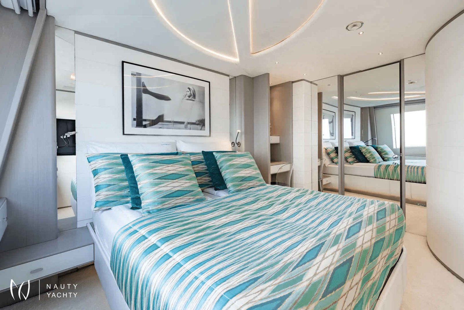 SEAGULL MRD features a sleek interior with minimalist design and contemporary sophistication. Bathed in natural light streaming through expansive windows, the spacious living areas offer a seamless connection to the surrounding ocean views. With her large volumes, guests can relish in the comfort of ample space for relaxation and entertainment indoors. Setting the onboard experience apart is not just elegance, but the silent experience she provides and a smooth and serene journey thanks to zero-speed stabilizers.Vast outdoor deck spaces make SEAGULL MRD an ideal platform for both relaxing and entertaining. She features expansive lounging areas forward and aft on the sun deck, adorned with plush sun pads, inviting sofas, and not one but two pools, including a Jacuzzi. Additional seating is found on the main deck forward, shaded for total comfort. Outdoor dining is a delight on the main deck aft, accompanied by a chic cocktail bar and vibrant turquoise-colored furnishings. With easy access to the water from the stern, guests are invited to explore the boundless beauty of the ocean.