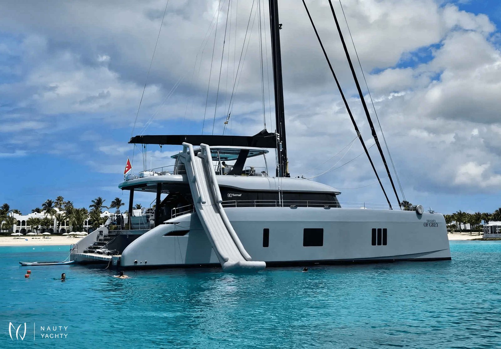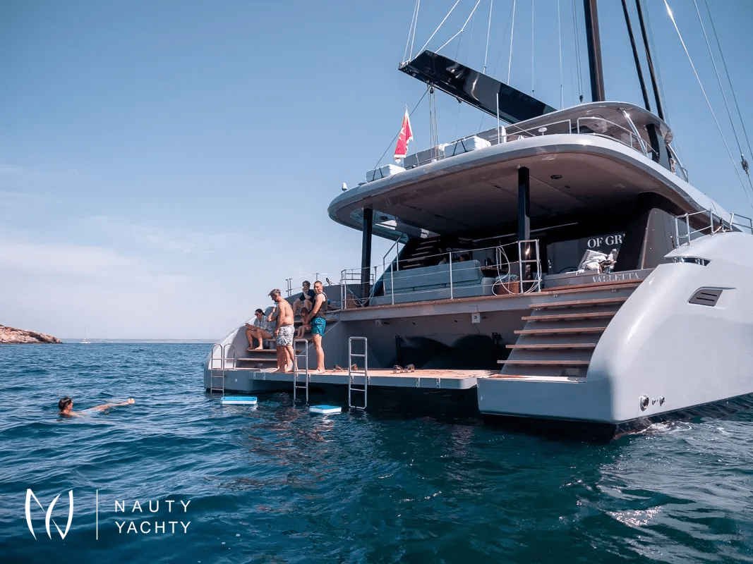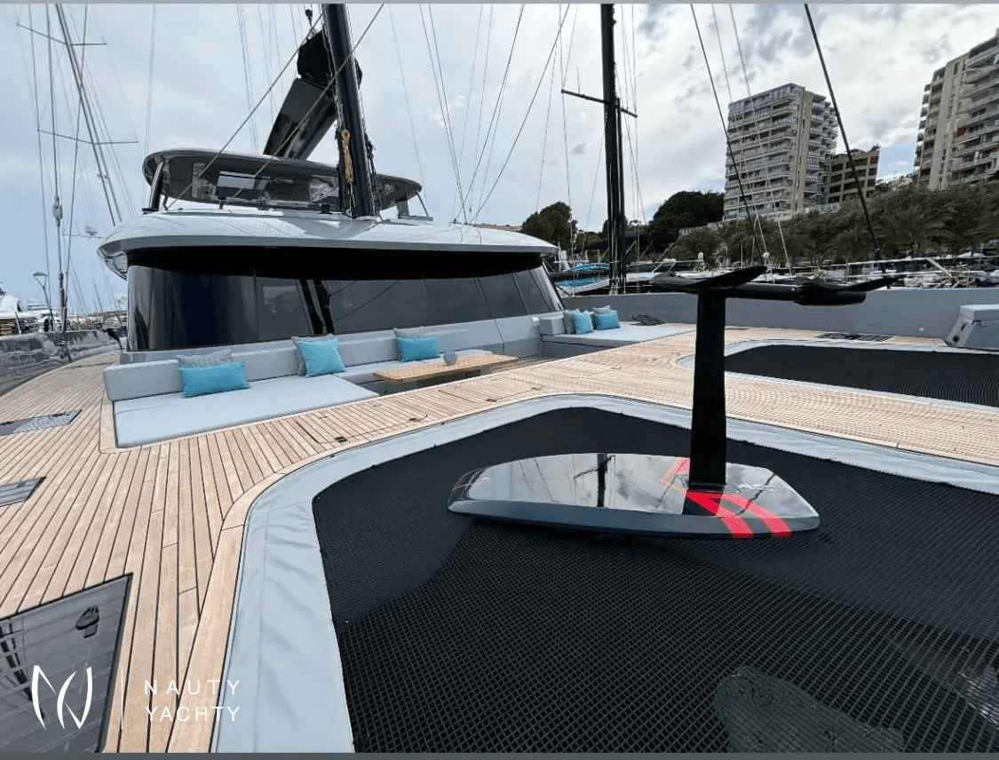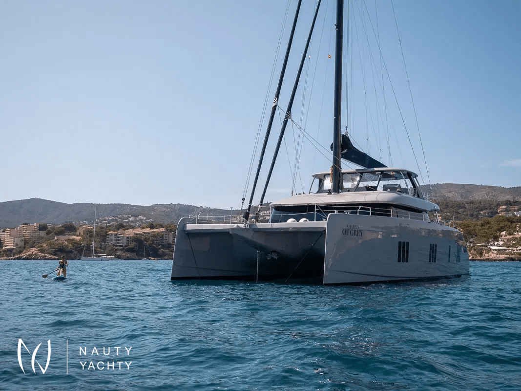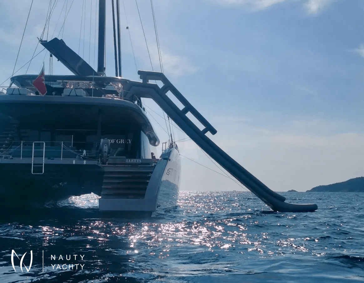 If you had to describe the Sunreef 80 SHADES OF GREY in one sentence, you would say that this Sunreef 80 impresses with its clean, elegant design and is truly no 'grey mouse'. Warm shades of grey, combined with a modern green, give the interior a fresh and very elegant look. You will immediately feel at home on board as there are no 'loud' design elements to obstruct the view and everything is simply harmonious.The master cabin is located in the middle of the starboard side and has a king-size bed, a small sofa for relaxing, a dressing table and a walk-in wardrobe. The bathroom with shower is very spacious. Also to starboard is the double cabin (queen size bed) with a comfortable en suite bathroom.On the port side, amidships, is the VIP cabin (queen-size bed), which is slightly larger than the double cabin and has a walk-in wardrobe. The bathroom is also slightly larger. Forward on the port side is the guest cabin with three comfortable single beds and an en-suite shower room. The beds are 80 x 200 cm and the bunk beds are staggered so that the upper bed is easy to reach.The saloon is all about relaxing together, with two really big lounge sofas. In the centre is a black glass table that can be converted into a dining table for up to 10 people in bad weather.The aft deck has a large dining table that can seat up to 10 people and a lounge sofa. There is also a lounge with a coffee table on the foredeck.On the flybridge, the SHADES OF GREY has another large dining table, perfect for up to 10 guests, with a U-shaped seating area. Behind this is a full width sunbathing area. Forward of the helm position is an attractive bar, where you can enjoy a drink or have a snack from the chef.The flybridge is transformed into a spa area when the stewardess sets up her massage table and pampers guests with a feel-good massage.There is also a wide range of water sports on board, including an E-Foil, two Seabobs and numerous other water toys, as well as a water slide. And it's not just the kids who have fun!