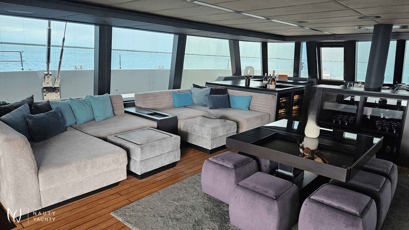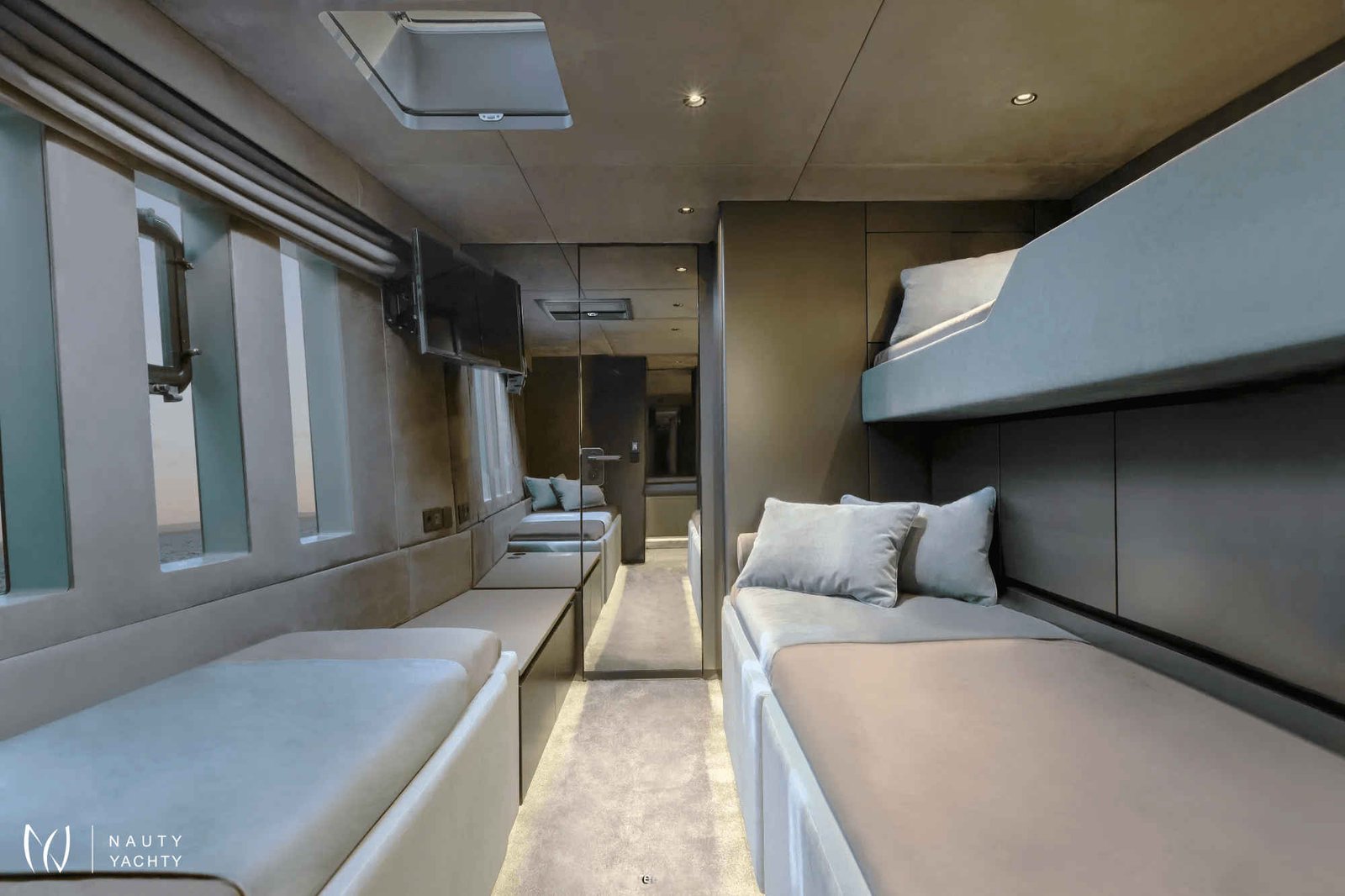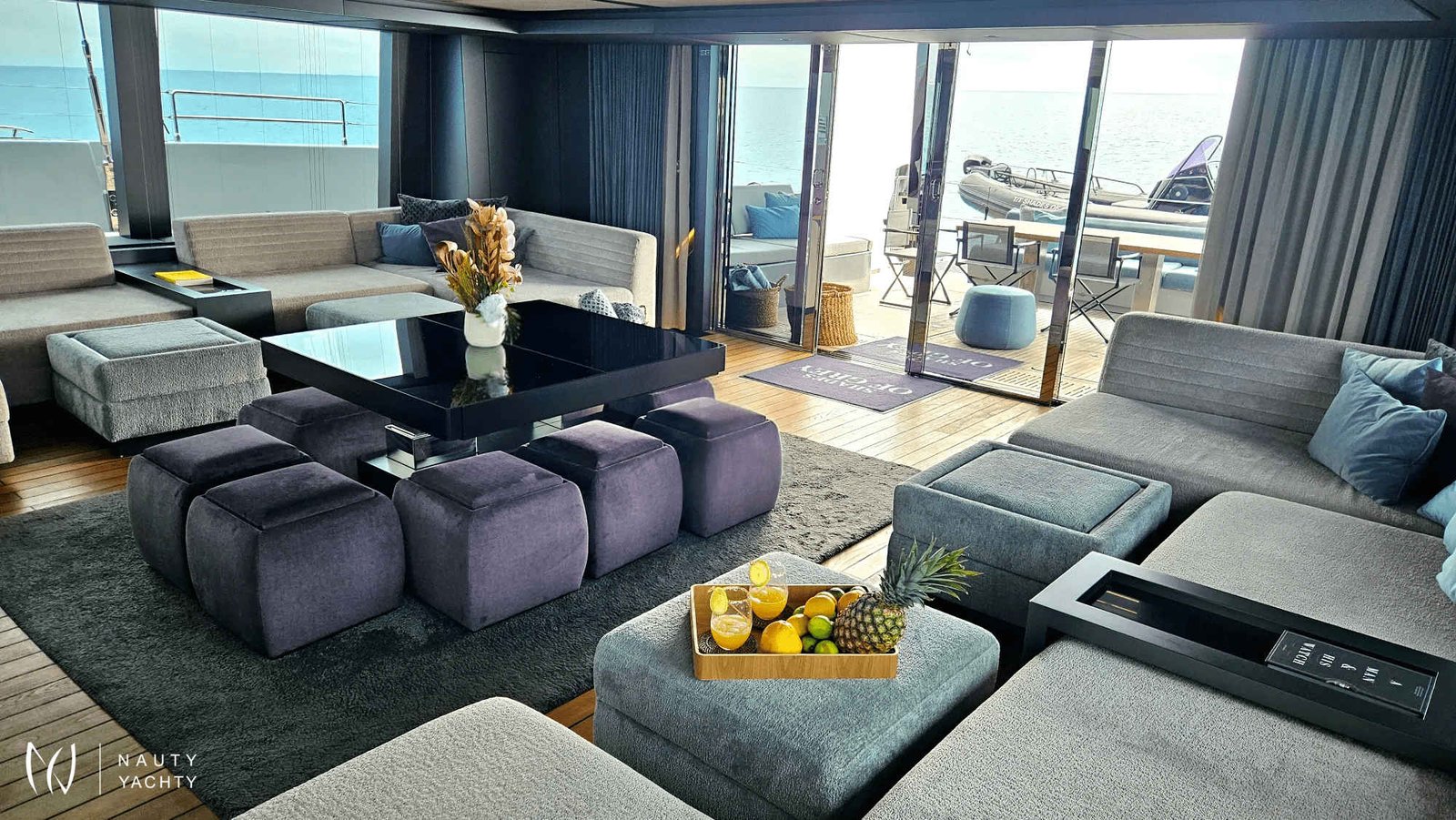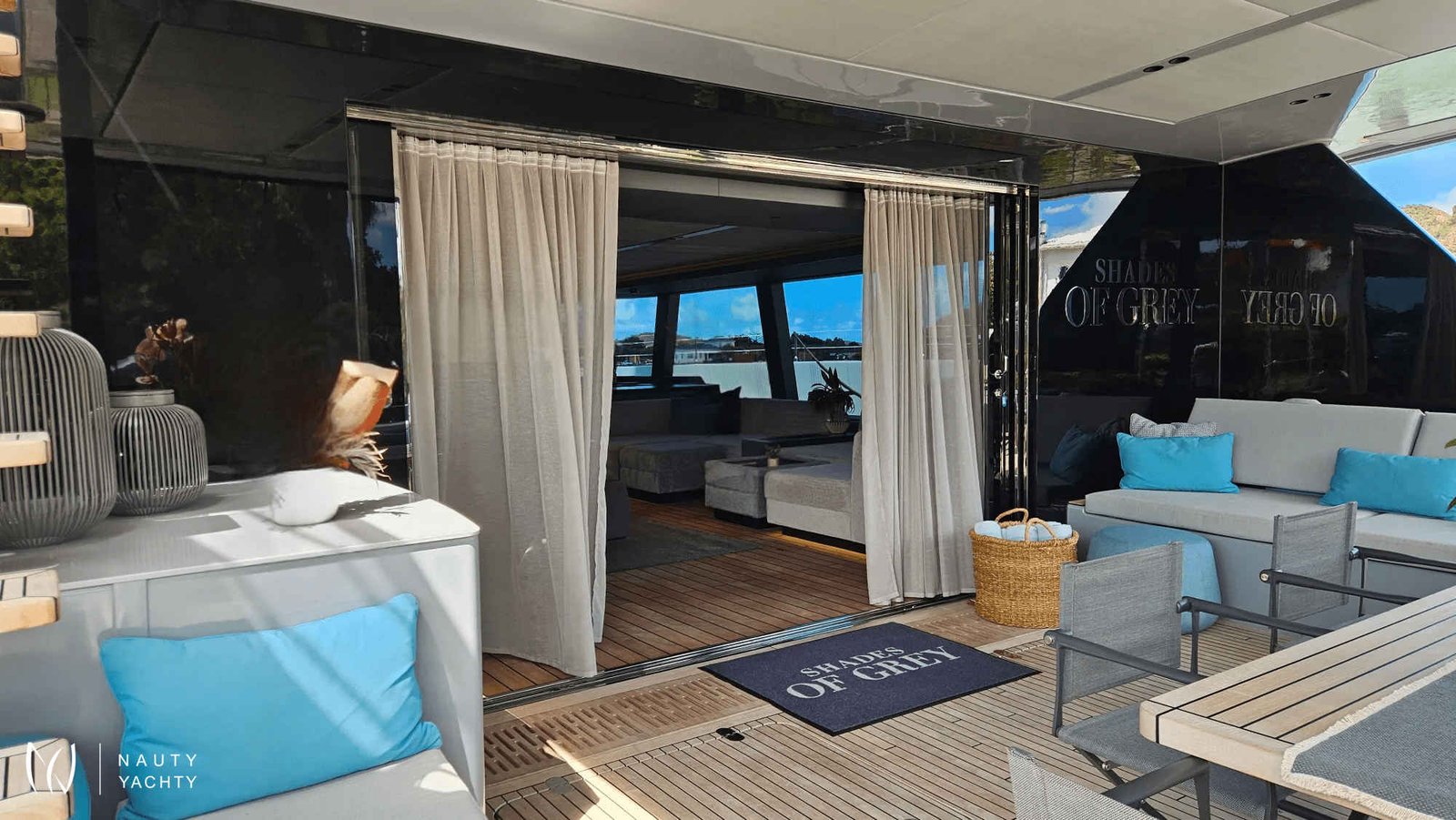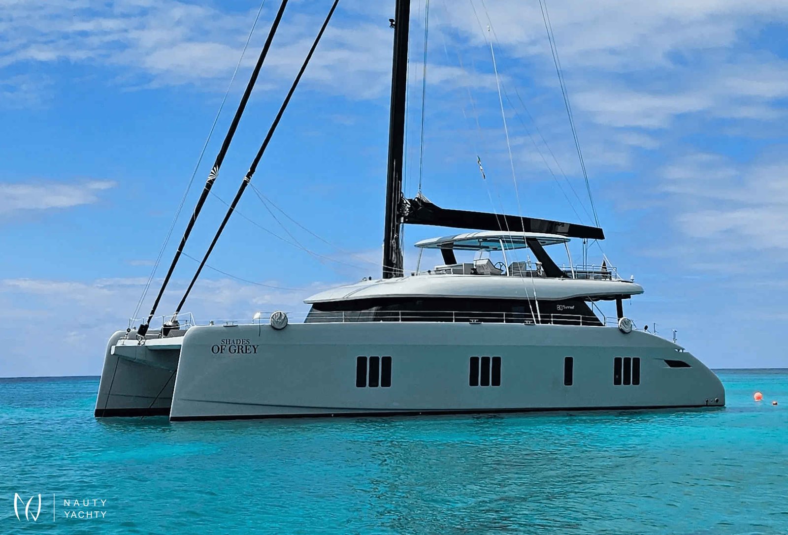 If you had to describe the Sunreef 80 SHADES OF GREY in one sentence, you would say that this Sunreef 80 impresses with its clean, elegant design and is truly no 'grey mouse'. Warm shades of grey, combined with a modern green, give the interior a fresh and very elegant look. You will immediately feel at home on board as there are no 'loud' design elements to obstruct the view and everything is simply harmonious.The master cabin is located in the middle of the starboard side and has a king-size bed, a small sofa for relaxing, a dressing table and a walk-in wardrobe. The bathroom with shower is very spacious. Also to starboard is the double cabin (queen size bed) with a comfortable en suite bathroom.On the port side, amidships, is the VIP cabin (queen-size bed), which is slightly larger than the double cabin and has a walk-in wardrobe. The bathroom is also slightly larger. Forward on the port side is the guest cabin with three comfortable single beds and an en-suite shower room. The beds are 80 x 200 cm and the bunk beds are staggered so that the upper bed is easy to reach.The saloon is all about relaxing together, with two really big lounge sofas. In the centre is a black glass table that can be converted into a dining table for up to 10 people in bad weather.The aft deck has a large dining table that can seat up to 10 people and a lounge sofa. There is also a lounge with a coffee table on the foredeck.On the flybridge, the SHADES OF GREY has another large dining table, perfect for up to 10 guests, with a U-shaped seating area. Behind this is a full width sunbathing area. Forward of the helm position is an attractive bar, where you can enjoy a drink or have a snack from the chef.The flybridge is transformed into a spa area when the stewardess sets up her massage table and pampers guests with a feel-good massage.There is also a wide range of water sports on board, including an E-Foil, two Seabobs and numerous other water toys, as well as a water slide. And it's not just the kids who have fun!