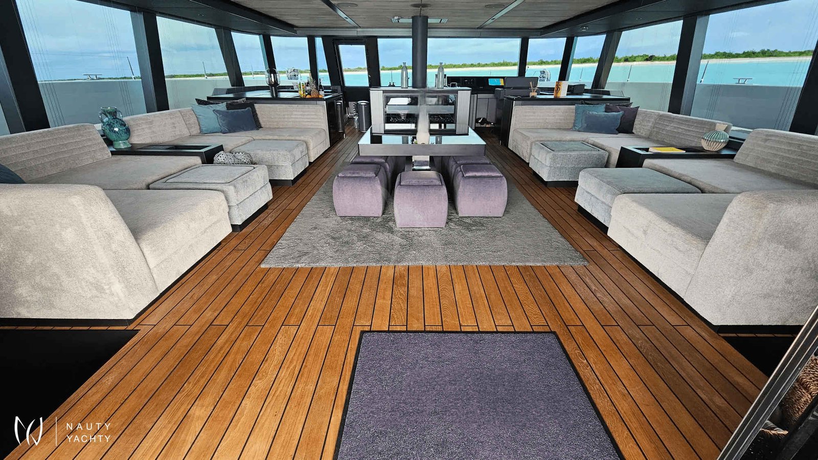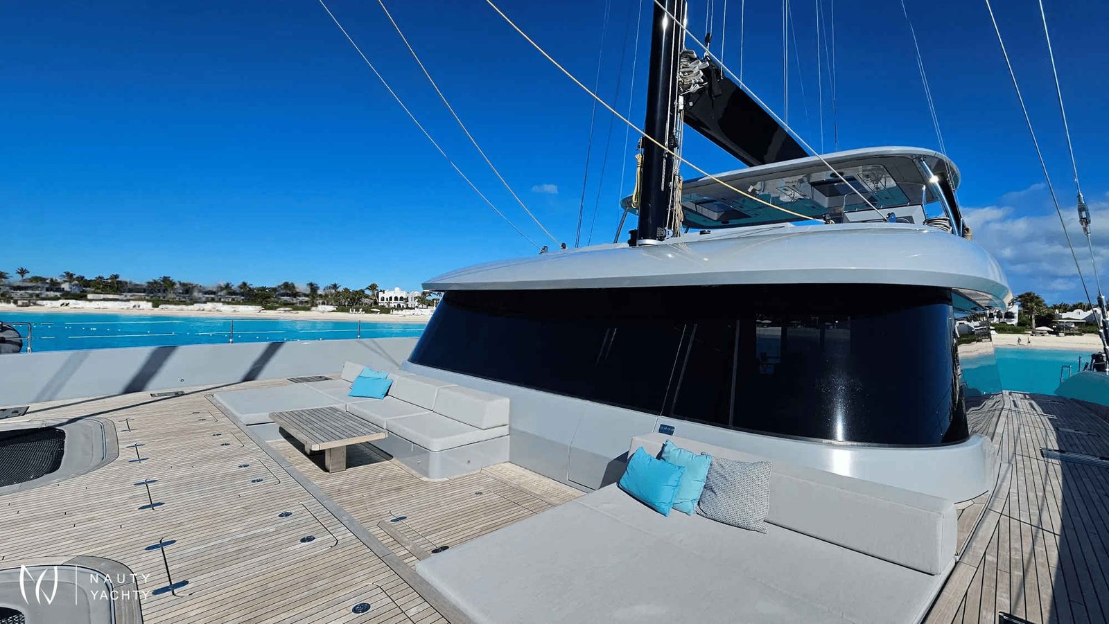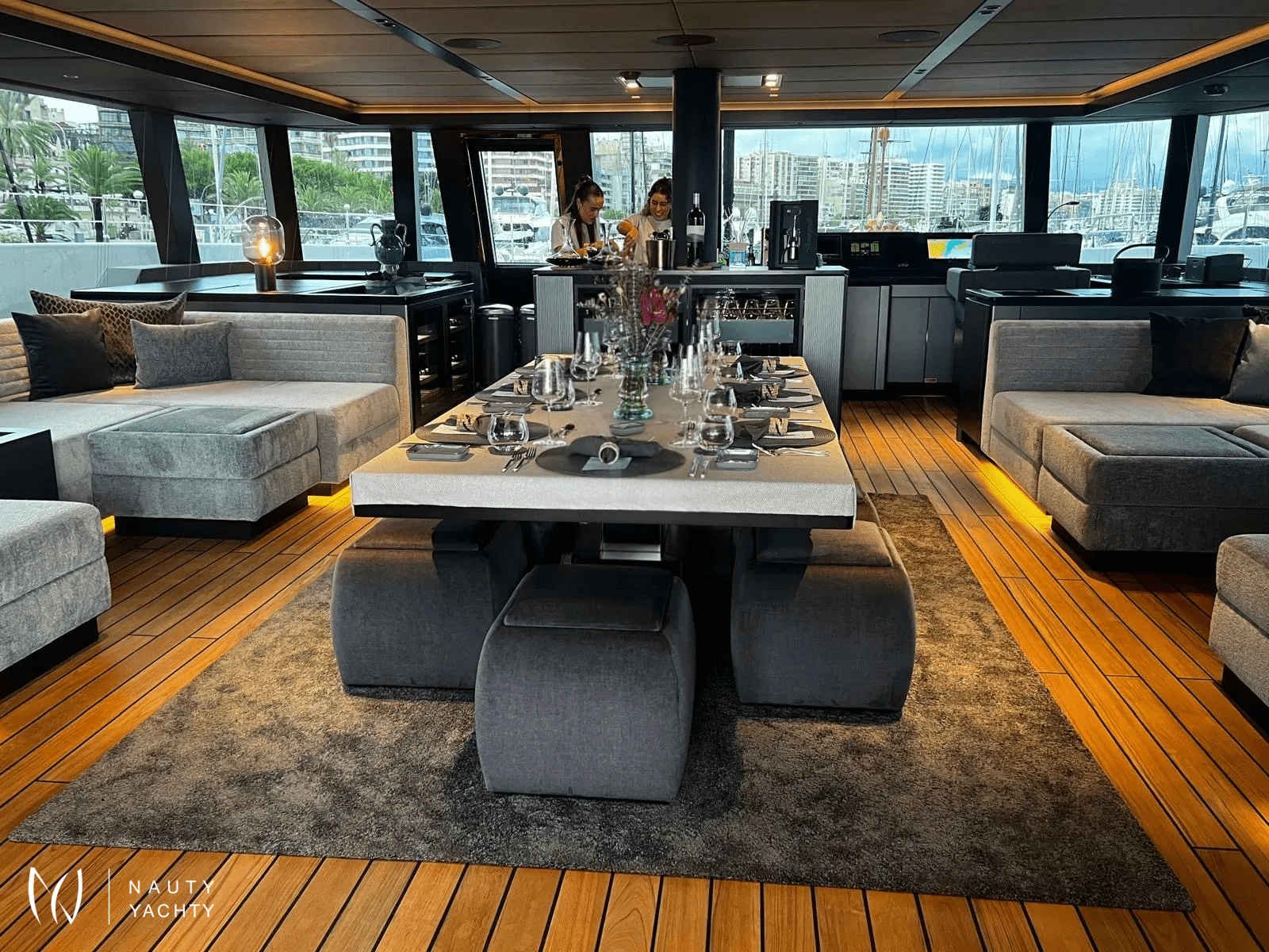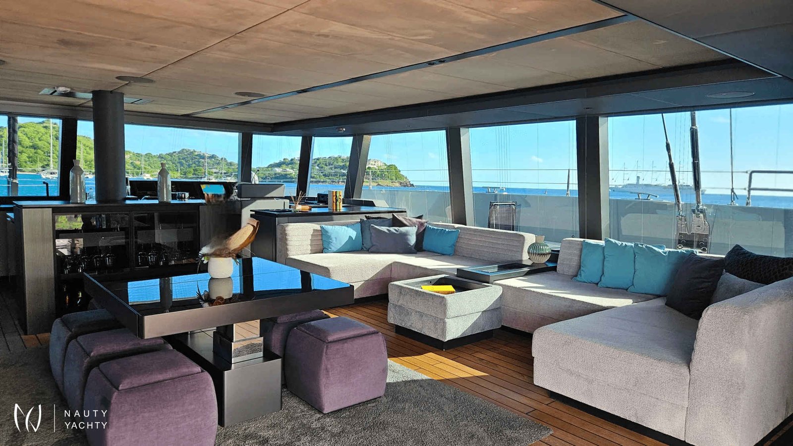 If you had to describe the Sunreef 80 SHADES OF GREY in one sentence, you would say that this Sunreef 80 impresses with its clean, elegant design and is truly no 'grey mouse'. Warm shades of grey, combined with a modern green, give the interior a fresh and very elegant look. You will immediately feel at home on board as there are no 'loud' design elements to obstruct the view and everything is simply harmonious.The master cabin is located in the middle of the starboard side and has a king-size bed, a small sofa for relaxing, a dressing table and a walk-in wardrobe. The bathroom with shower is very spacious. Also to starboard is the double cabin (queen size bed) with a comfortable en suite bathroom.On the port side, amidships, is the VIP cabin (queen-size bed), which is slightly larger than the double cabin and has a walk-in wardrobe. The bathroom is also slightly larger. Forward on the port side is the guest cabin with three comfortable single beds and an en-suite shower room. The beds are 80 x 200 cm and the bunk beds are staggered so that the upper bed is easy to reach.The saloon is all about relaxing together, with two really big lounge sofas. In the centre is a black glass table that can be converted into a dining table for up to 10 people in bad weather.The aft deck has a large dining table that can seat up to 10 people and a lounge sofa. There is also a lounge with a coffee table on the foredeck.On the flybridge, the SHADES OF GREY has another large dining table, perfect for up to 10 guests, with a U-shaped seating area. Behind this is a full width sunbathing area. Forward of the helm position is an attractive bar, where you can enjoy a drink or have a snack from the chef.The flybridge is transformed into a spa area when the stewardess sets up her massage table and pampers guests with a feel-good massage.There is also a wide range of water sports on board, including an E-Foil, two Seabobs and numerous other water toys, as well as a water slide. And it's not just the kids who have fun!