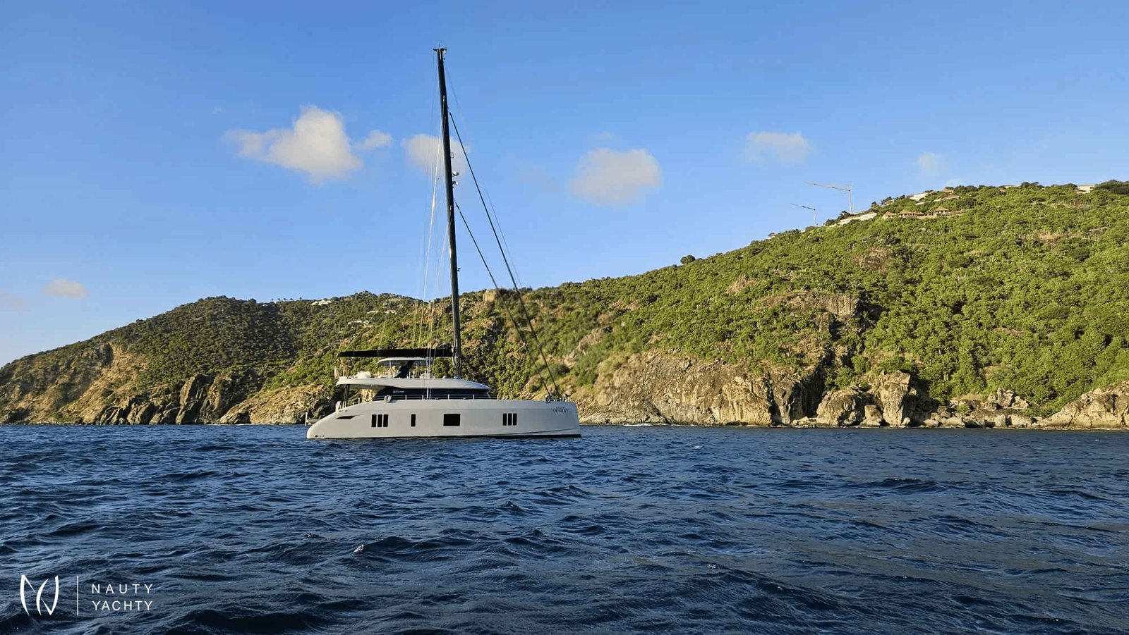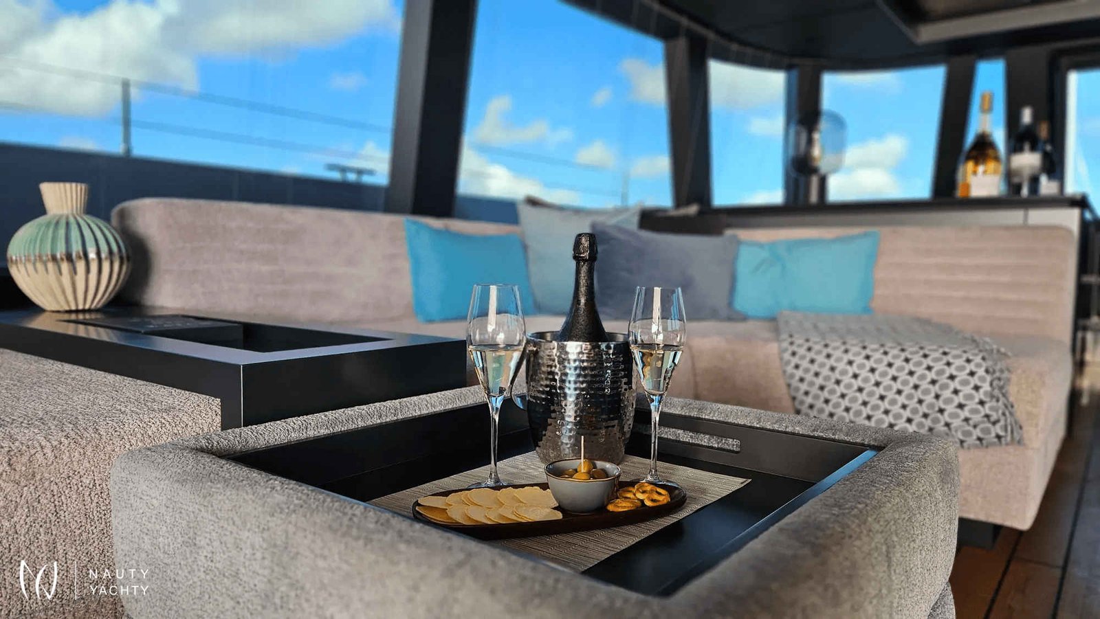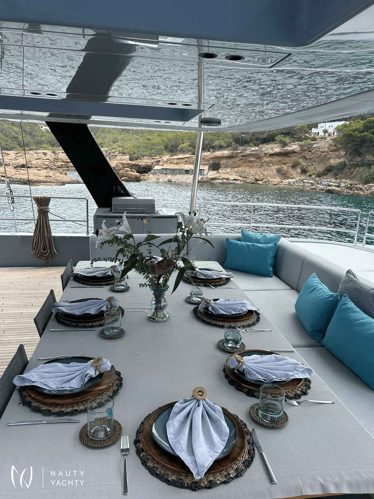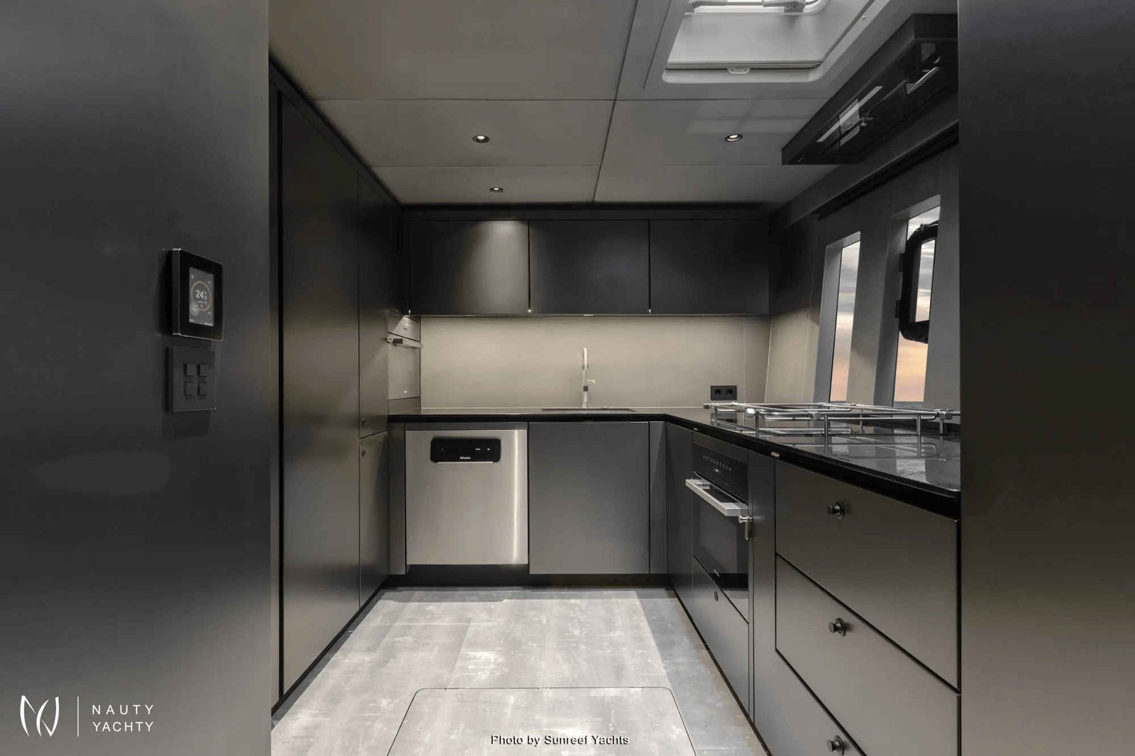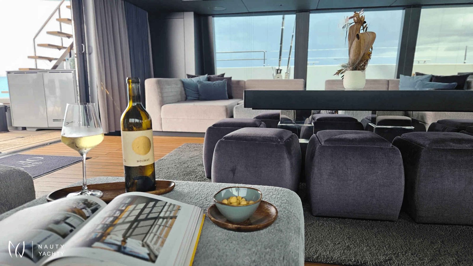 If you had to describe the Sunreef 80 SHADES OF GREY in one sentence, you would say that this Sunreef 80 impresses with its clean, elegant design and is truly no 'grey mouse'. Warm shades of grey, combined with a modern green, give the interior a fresh and very elegant look. You will immediately feel at home on board as there are no 'loud' design elements to obstruct the view and everything is simply harmonious.The master cabin is located in the middle of the starboard side and has a king-size bed, a small sofa for relaxing, a dressing table and a walk-in wardrobe. The bathroom with shower is very spacious. Also to starboard is the double cabin (queen size bed) with a comfortable en suite bathroom.On the port side, amidships, is the VIP cabin (queen-size bed), which is slightly larger than the double cabin and has a walk-in wardrobe. The bathroom is also slightly larger. Forward on the port side is the guest cabin with three comfortable single beds and an en-suite shower room. The beds are 80 x 200 cm and the bunk beds are staggered so that the upper bed is easy to reach.The saloon is all about relaxing together, with two really big lounge sofas. In the centre is a black glass table that can be converted into a dining table for up to 10 people in bad weather.The aft deck has a large dining table that can seat up to 10 people and a lounge sofa. There is also a lounge with a coffee table on the foredeck.On the flybridge, the SHADES OF GREY has another large dining table, perfect for up to 10 guests, with a U-shaped seating area. Behind this is a full width sunbathing area. Forward of the helm position is an attractive bar, where you can enjoy a drink or have a snack from the chef.The flybridge is transformed into a spa area when the stewardess sets up her massage table and pampers guests with a feel-good massage.There is also a wide range of water sports on board, including an E-Foil, two Seabobs and numerous other water toys, as well as a water slide. And it's not just the kids who have fun!