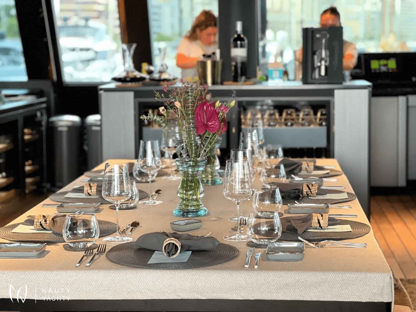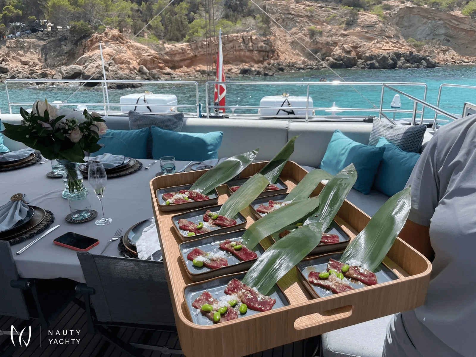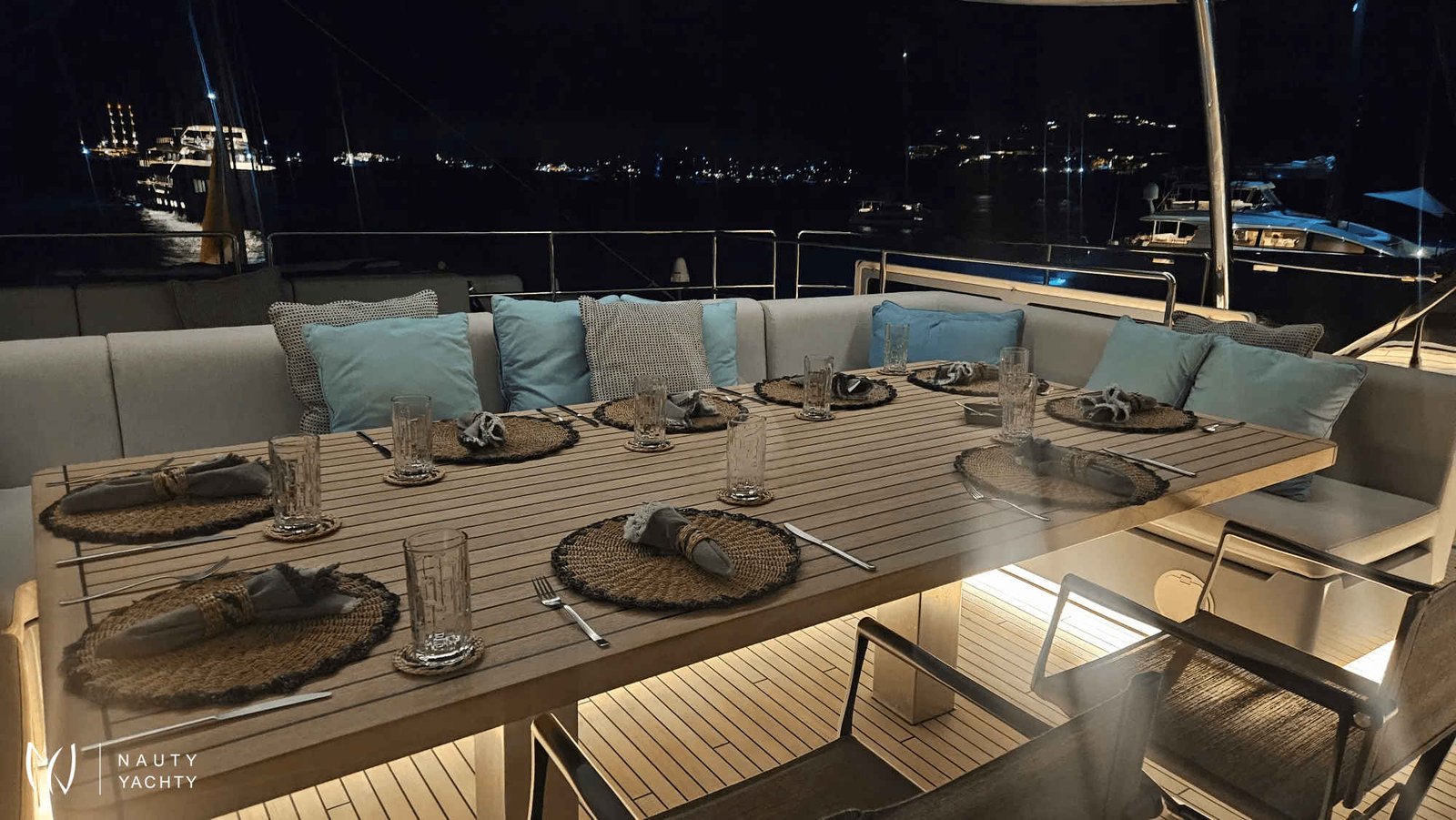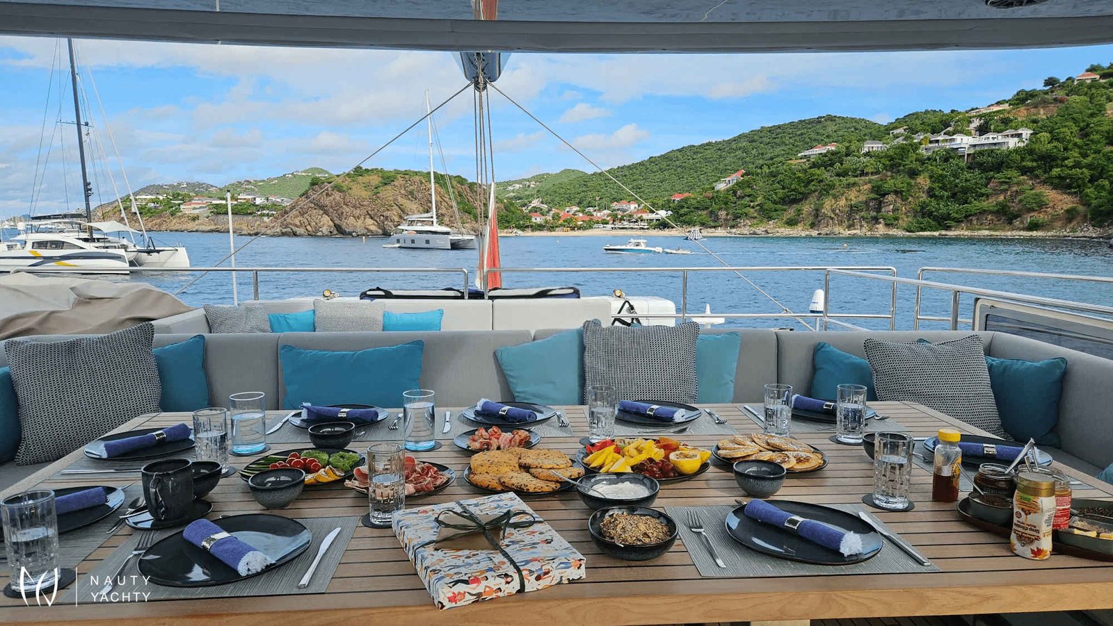 If you had to describe the Sunreef 80 SHADES OF GREY in one sentence, you would say that this Sunreef 80 impresses with its clean, elegant design and is truly no 'grey mouse'. Warm shades of grey, combined with a modern green, give the interior a fresh and very elegant look. You will immediately feel at home on board as there are no 'loud' design elements to obstruct the view and everything is simply harmonious.The master cabin is located in the middle of the starboard side and has a king-size bed, a small sofa for relaxing, a dressing table and a walk-in wardrobe. The bathroom with shower is very spacious. Also to starboard is the double cabin (queen size bed) with a comfortable en suite bathroom.On the port side, amidships, is the VIP cabin (queen-size bed), which is slightly larger than the double cabin and has a walk-in wardrobe. The bathroom is also slightly larger. Forward on the port side is the guest cabin with three comfortable single beds and an en-suite shower room. The beds are 80 x 200 cm and the bunk beds are staggered so that the upper bed is easy to reach.The saloon is all about relaxing together, with two really big lounge sofas. In the centre is a black glass table that can be converted into a dining table for up to 10 people in bad weather.The aft deck has a large dining table that can seat up to 10 people and a lounge sofa. There is also a lounge with a coffee table on the foredeck.On the flybridge, the SHADES OF GREY has another large dining table, perfect for up to 10 guests, with a U-shaped seating area. Behind this is a full width sunbathing area. Forward of the helm position is an attractive bar, where you can enjoy a drink or have a snack from the chef.The flybridge is transformed into a spa area when the stewardess sets up her massage table and pampers guests with a feel-good massage.There is also a wide range of water sports on board, including an E-Foil, two Seabobs and numerous other water toys, as well as a water slide. And it's not just the kids who have fun!