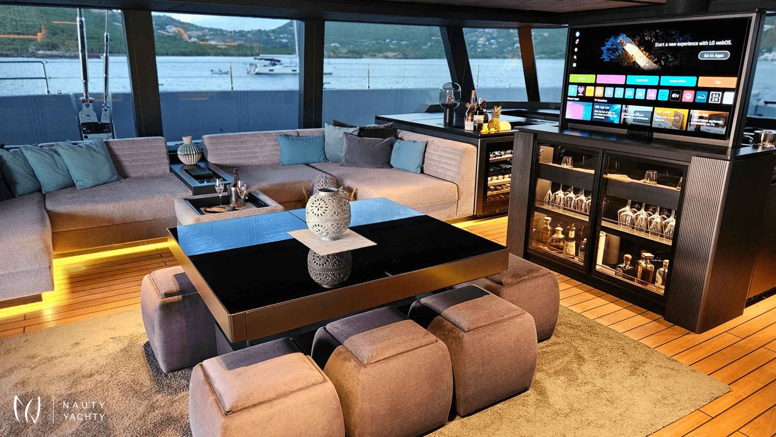 Spacious open salon design with huge lounge sofas, convertible coffee table in the middle and pop-up TV.