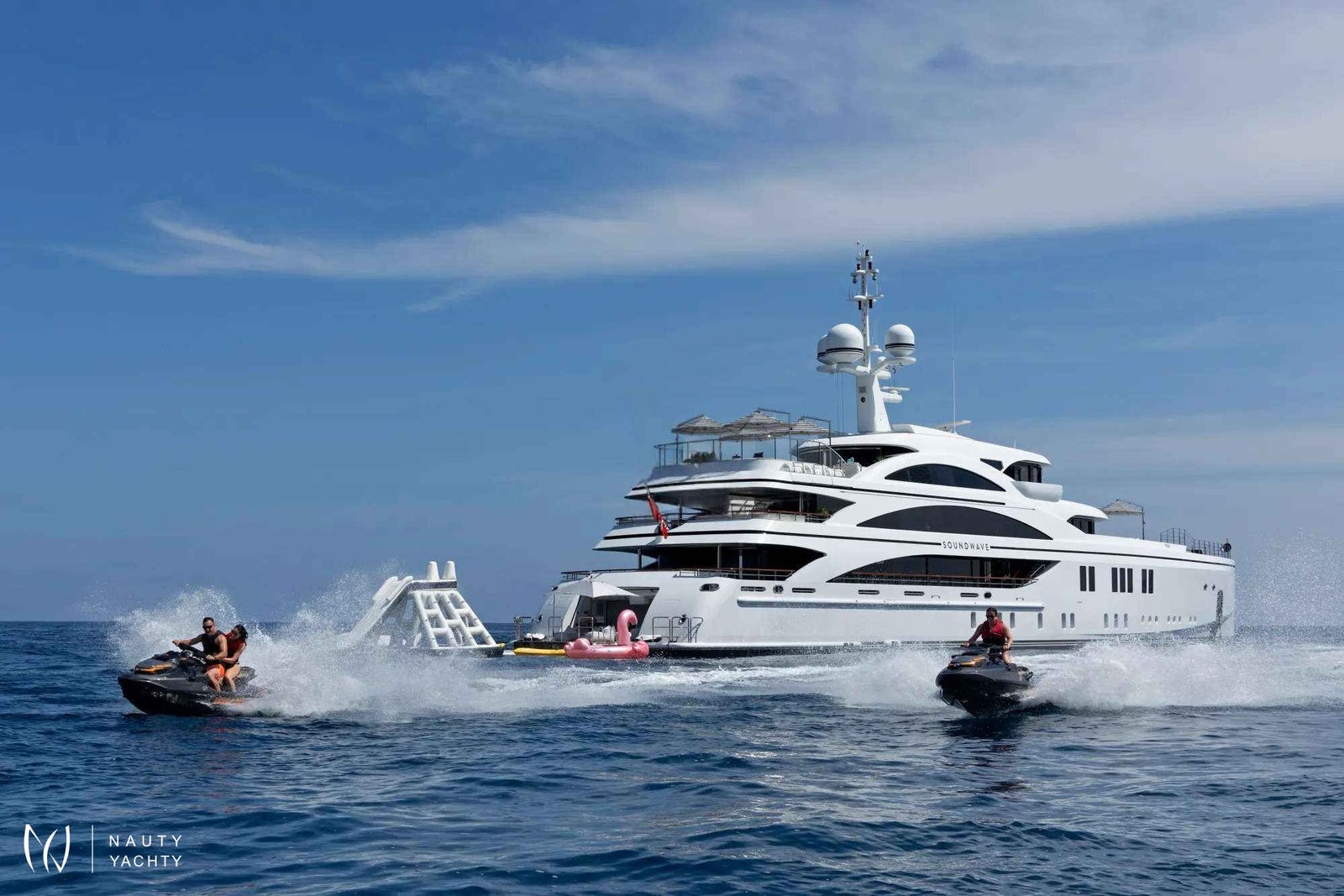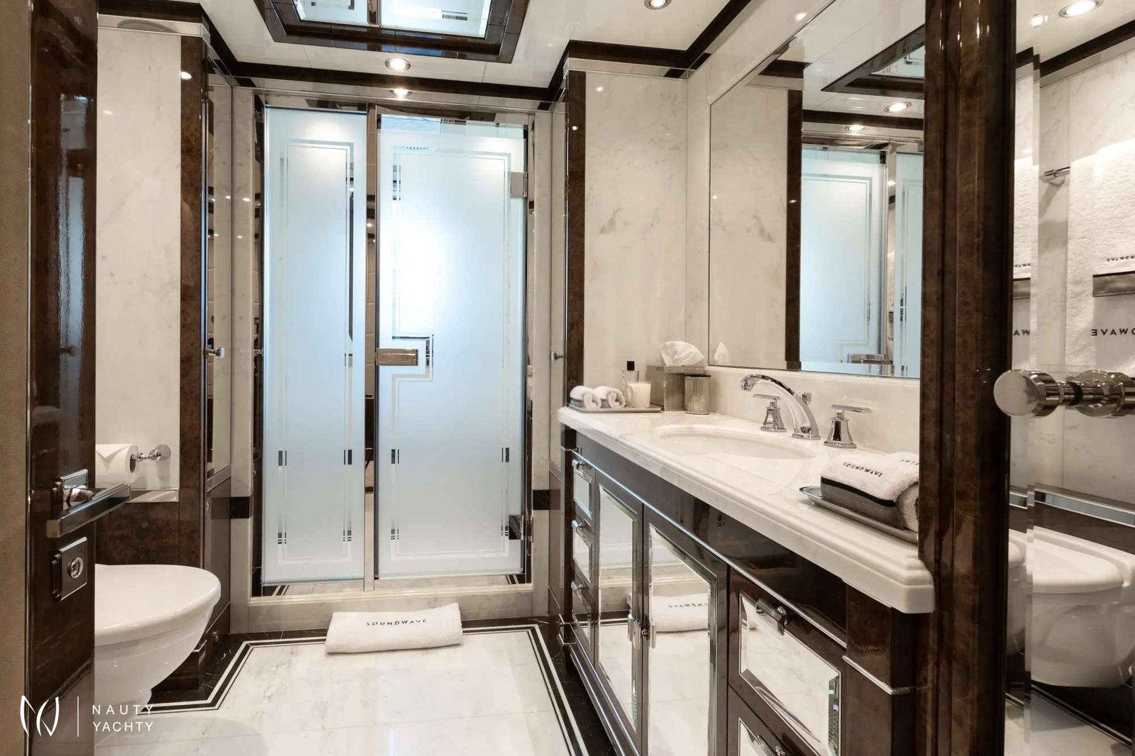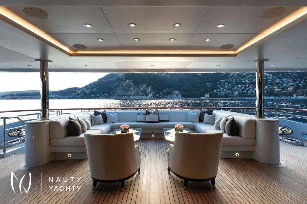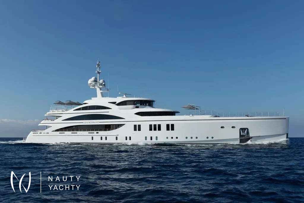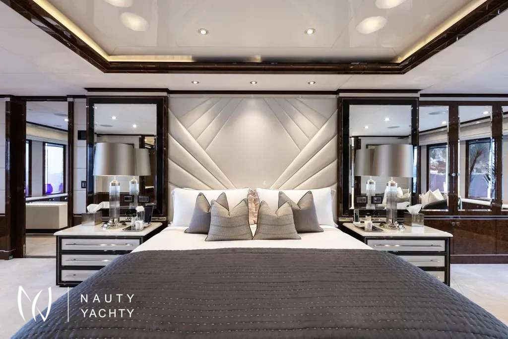 Soundwave is an entertainer’s dream with endless options for spending time outdoors across her impressive deck spaces. Her sun deck aft offers a resort style experience with an English spa-inspired pool, generous sunbathing areas sheltered by umbrellas and a fluted bar complete with seating and low-level tables. On her upper deck aft, there is an exceptional dining space for an al fresco experience, with a 14-seat table, accompanied by an outdoor bar, and on her main deck there is a beautiful teak deck and custom-fitted seating area sheltered by her awning.Soundwave features an Art Deco-inspired interior, brought to life by Candy & Candy. Throughout she features geometric shapes, stepped forms and intricate line art which is accented by polished stainless-steel finishes, bespoke chandeliers, and flawless Italian marble. The Main Salon provides an impressive living and entertaining space, complete with a custom-made U-shape sofa with 10 generous seat cushions along with a 12-seater formal dining table. The sky lounge on the upper deck provides a relaxed area, with an informal sofa setting and custom-made cocktail bar.Soundwave has accommodation for up to 12 guests across six cabins with a luxurious Master suite that includes an expansive 180-degree panorama view over the bow of the boat, overlooking a private pool and sun deck area. The second Master, with spacious interiors and expanses of windows allowing natural light to flow into the space along with a study, powder room and walk-in dressing area. The remainder of guests are accommodated across two double cabins and two twin cabins, all with ensuite.