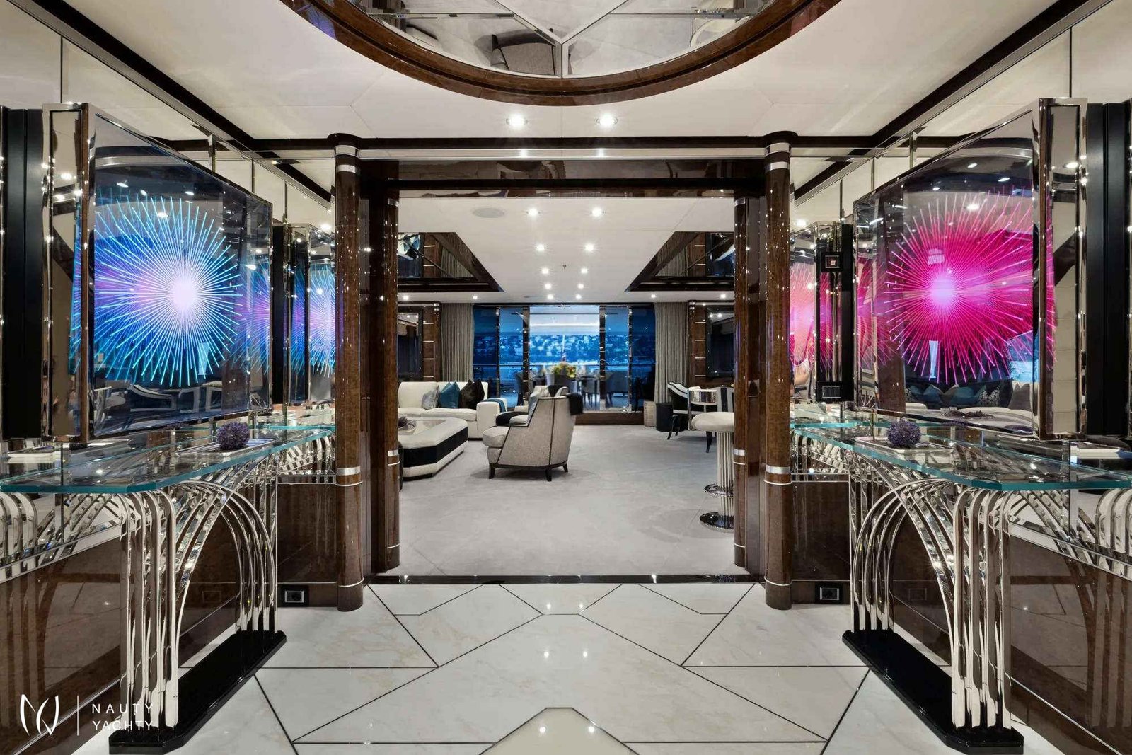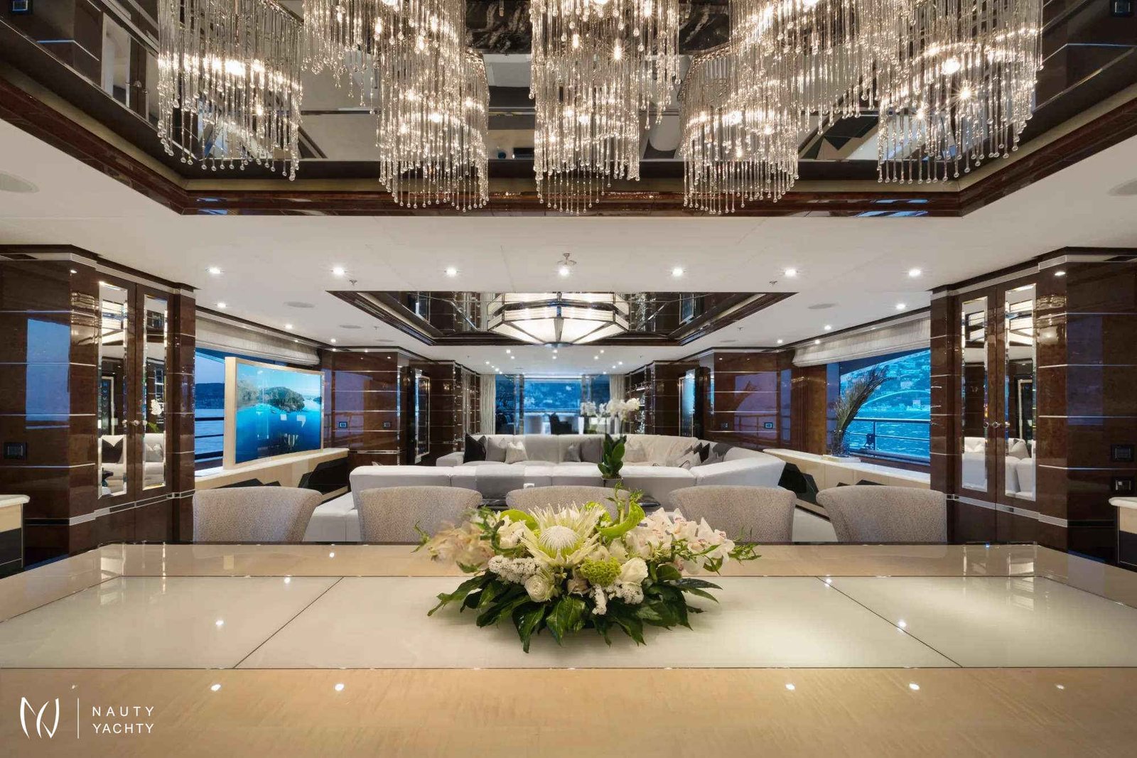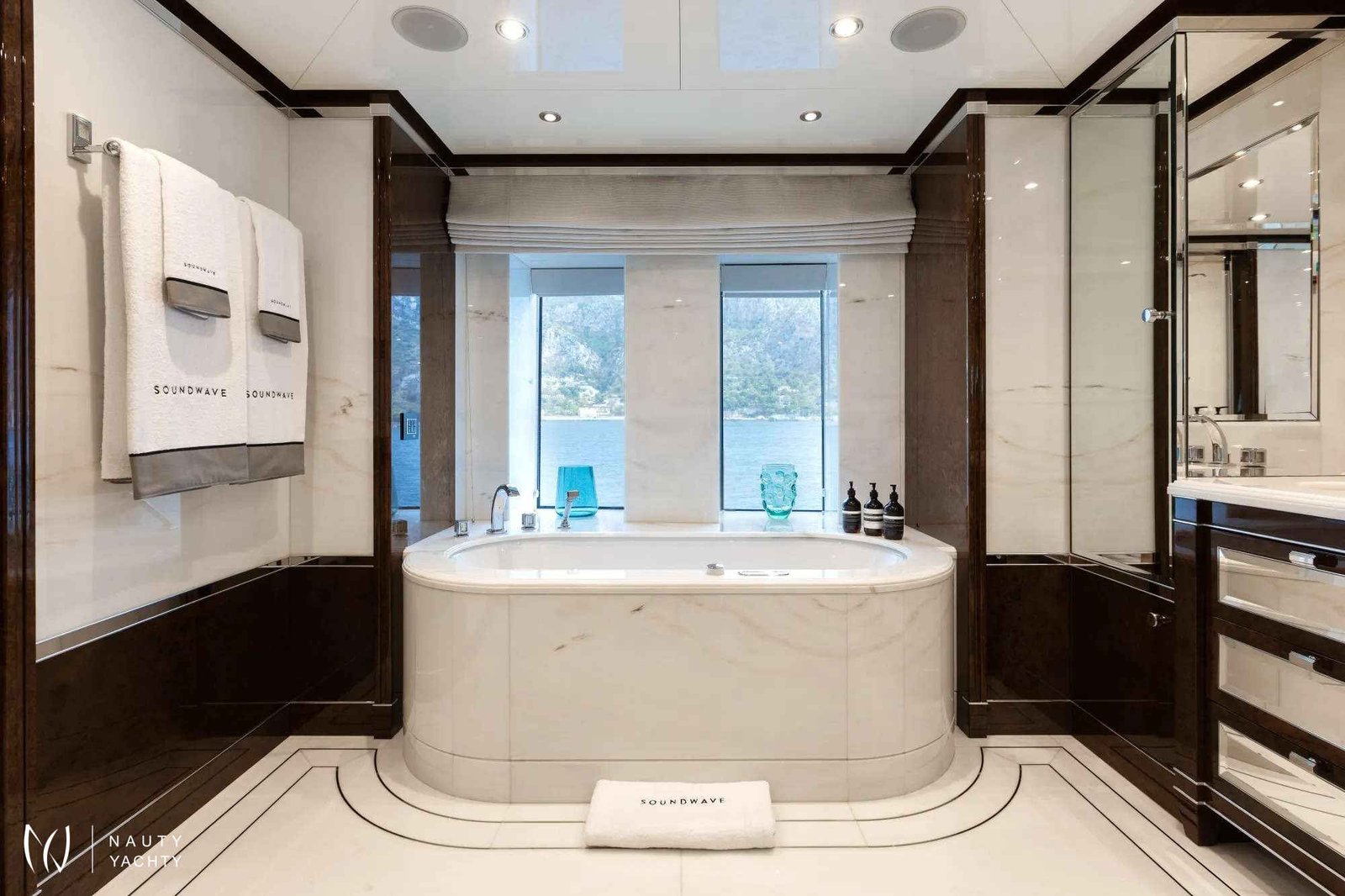 Soundwave is an entertainer’s dream with endless options for spending time outdoors across her impressive deck spaces. Her sun deck aft offers a resort style experience with an English spa-inspired pool, generous sunbathing areas sheltered by umbrellas and a fluted bar complete with seating and low-level tables. On her upper deck aft, there is an exceptional dining space for an al fresco experience, with a 14-seat table, accompanied by an outdoor bar, and on her main deck there is a beautiful teak deck and custom-fitted seating area sheltered by her awning.Soundwave features an Art Deco-inspired interior, brought to life by Candy & Candy. Throughout she features geometric shapes, stepped forms and intricate line art which is accented by polished stainless-steel finishes, bespoke chandeliers, and flawless Italian marble. The Main Salon provides an impressive living and entertaining space, complete with a custom-made U-shape sofa with 10 generous seat cushions along with a 12-seater formal dining table. The sky lounge on the upper deck provides a relaxed area, with an informal sofa setting and custom-made cocktail bar.Soundwave has accommodation for up to 12 guests across six cabins with a luxurious Master suite that includes an expansive 180-degree panorama view over the bow of the boat, overlooking a private pool and sun deck area. The second Master, with spacious interiors and expanses of windows allowing natural light to flow into the space along with a study, powder room and walk-in dressing area. The remainder of guests are accommodated across two double cabins and two twin cabins, all with ensuite.