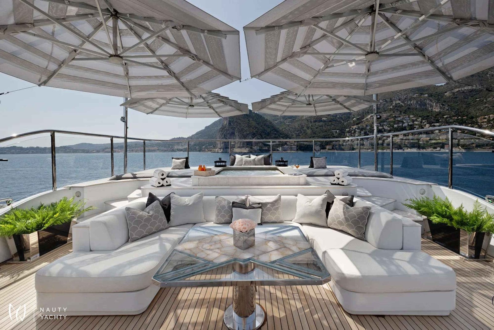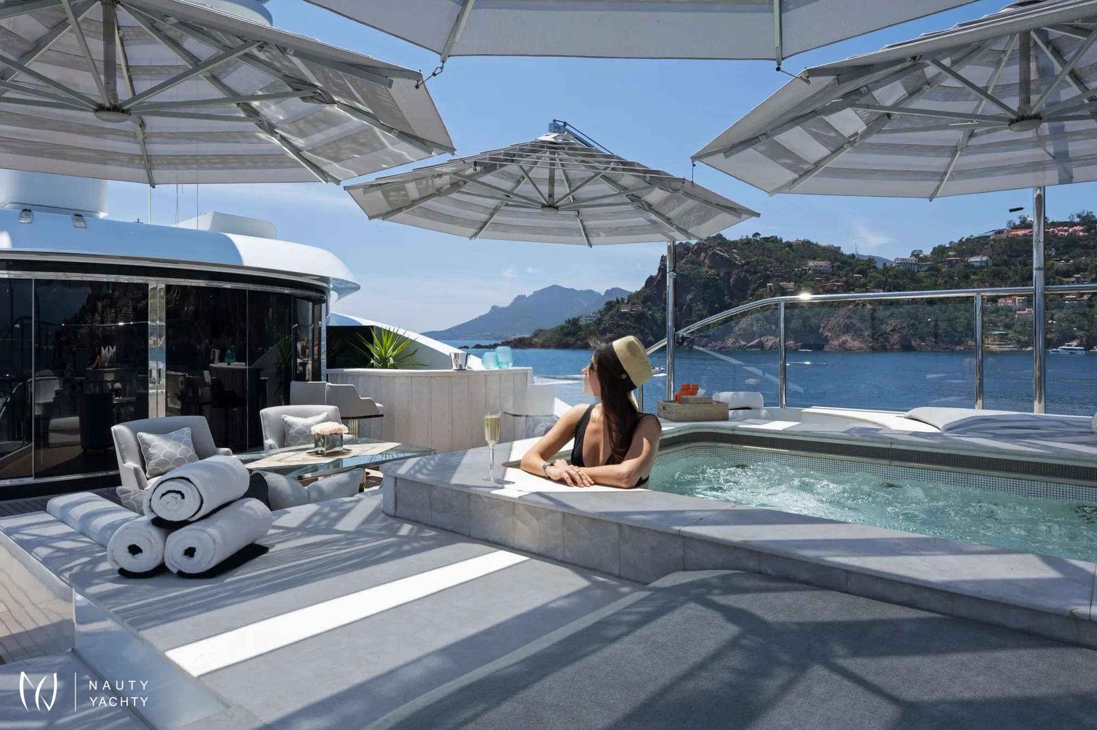 Master suite on upper deck with stunning 180-degree views, private sundeck with jet pool and sunbathing area