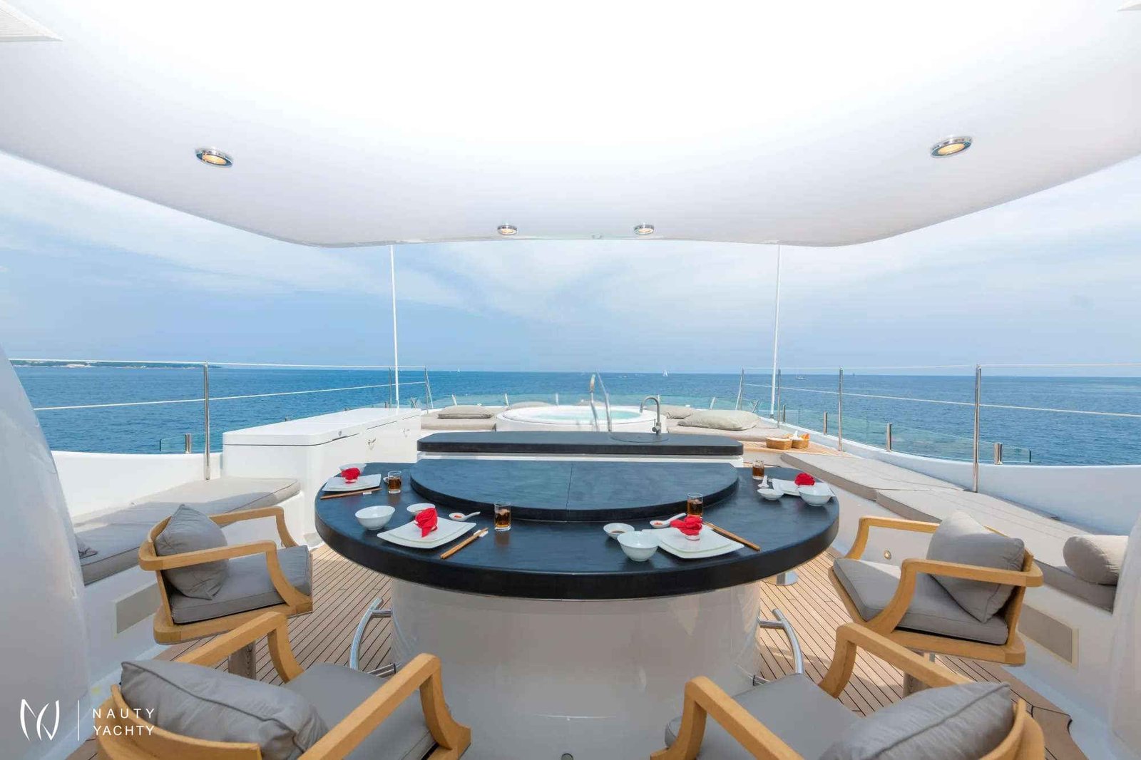 Large sun deck with full Teppanyaki grill, granite bar, Jacuzzi and gym equipment