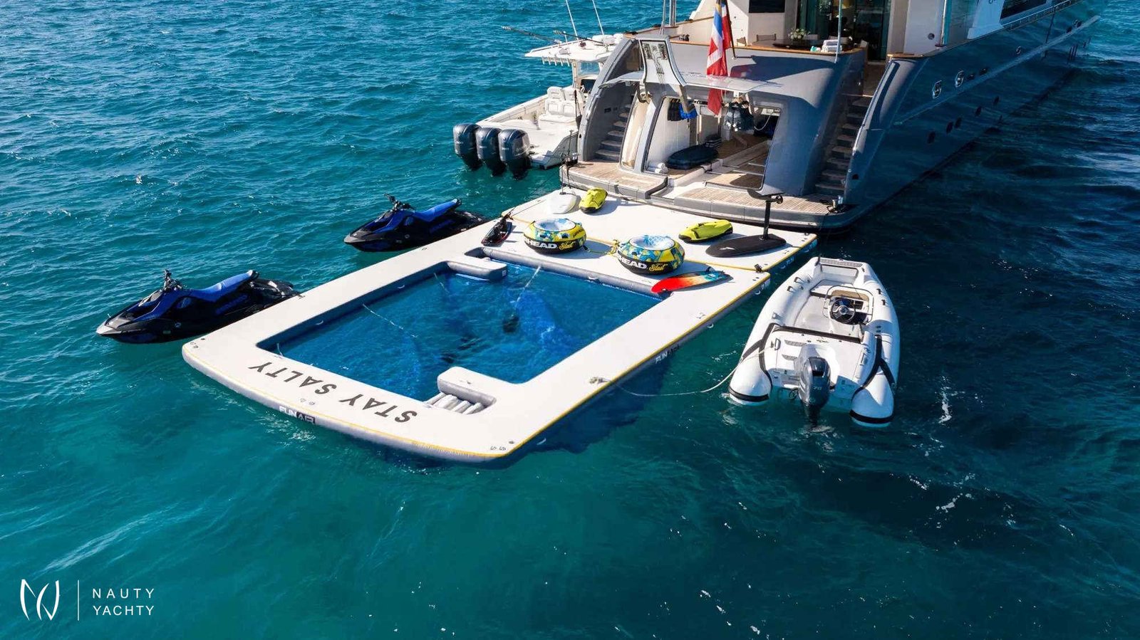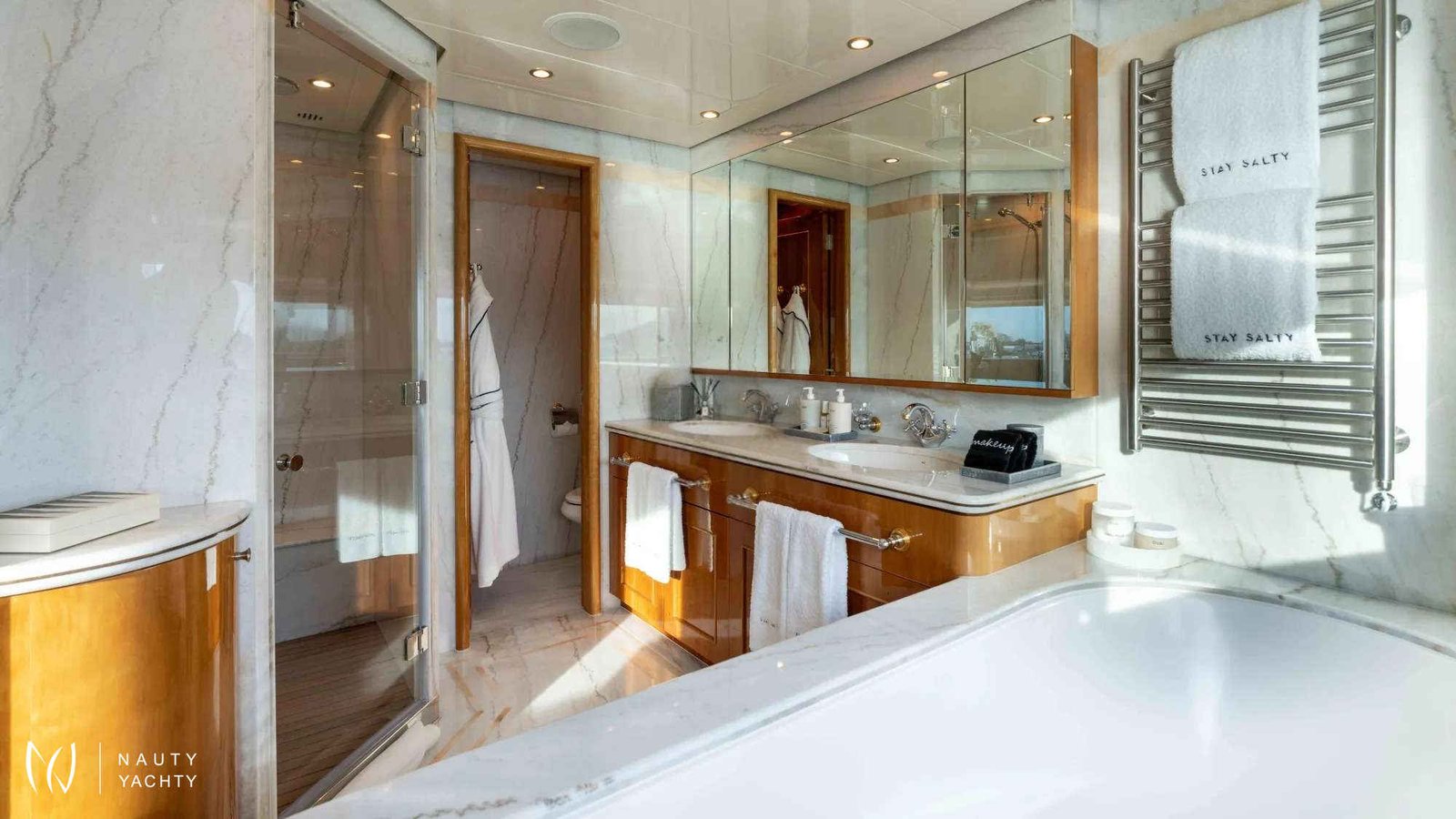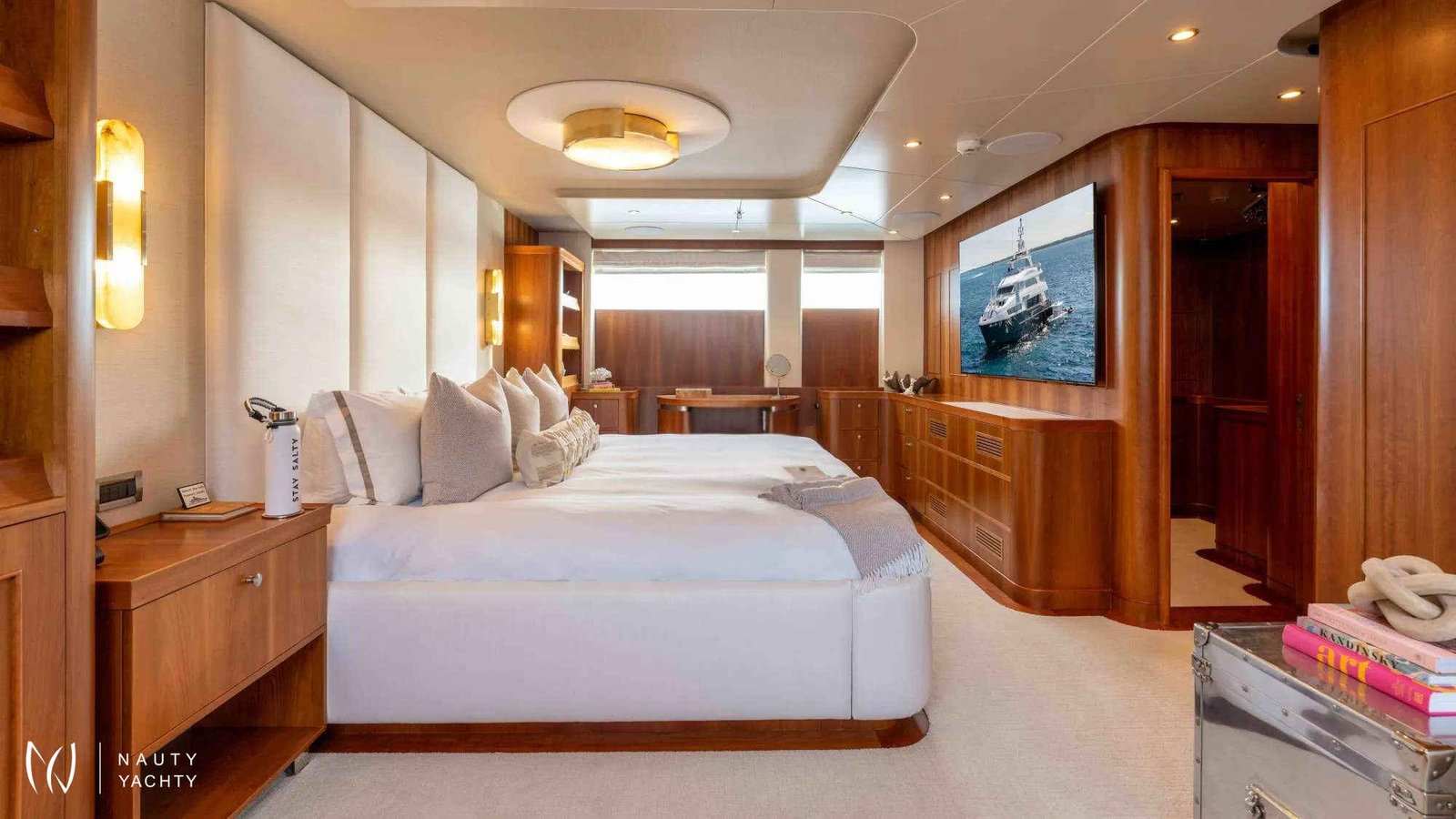 With an elegant dove grey hull and timeless lines, STAY SALTY stands as the epitome of luxury, making it the perfect choice for those seeking a refined and well-appointed charter vacation.This vessel has been lovingly maintained and upgraded by a passionate owner, undergoing a comprehensive refit in 2024 to ensure pristine charter-ready condition. Step into a world of sophistication, where bright and contemporary interiors feature elegant light wood paneling and joinery, complemented by neutrally toned furnishings in luxurious fabrics and soft leathers.Accommodating up to 12 guests in 6 stunning staterooms, STAY SALTY offers a master suite on the upper deck with a private lounge, a his-and-hers ensuite bathroom with a jacuzzi tub, and a walk-in dressing room. The VIP stateroom is located on the main deck, while the remaining four staterooms, including one king suite, two twin convertible cabins and one twin cabin, are on the lower deck. All staterooms boast spacious ensuite shower rooms and access to STAY SALTY’s impressive entertainment system.STAY SALTY’s expansive decks provide stylish spaces for sunbathing, entertaining, and relaxing. The main aft deck features a shaded dining table for 12, a barbecue, and a widescreen TV. The upper deck offers a sumptuous lounge area for lazy mornings or afternoon cocktails, while the sundeck boasts the best onboard views, sun loungers, a bar, lounge seating, and an alfresco dining area.Facilitating all the action and ensuring seamless service is STAY SALTY’s dedicated crew of 8 professionals, committed to delivering an exceptional charter cruising experience. Embark on a journey of luxury and adventure with STAY SALTY.