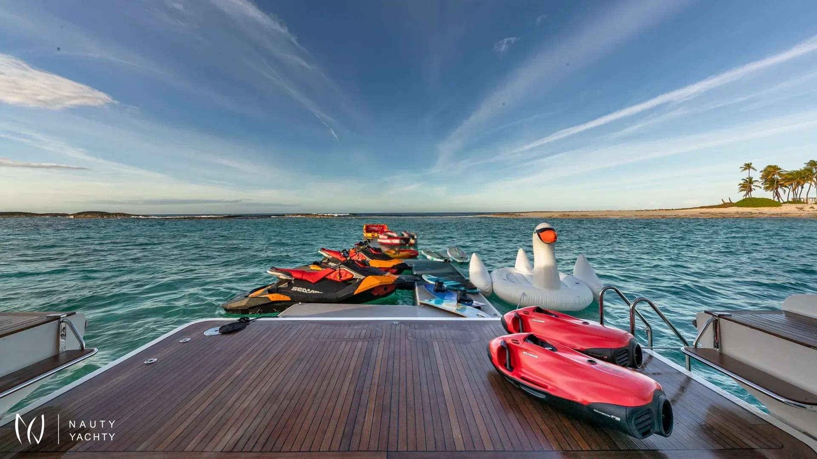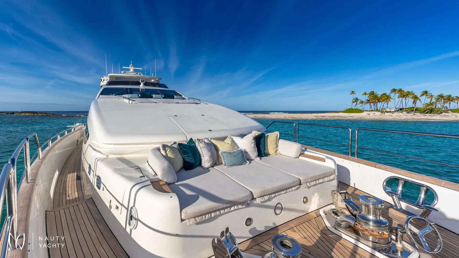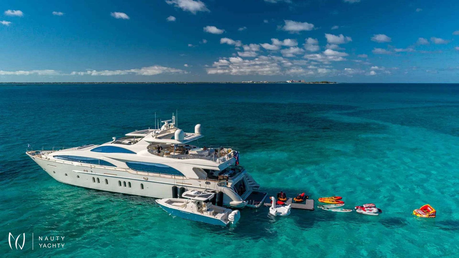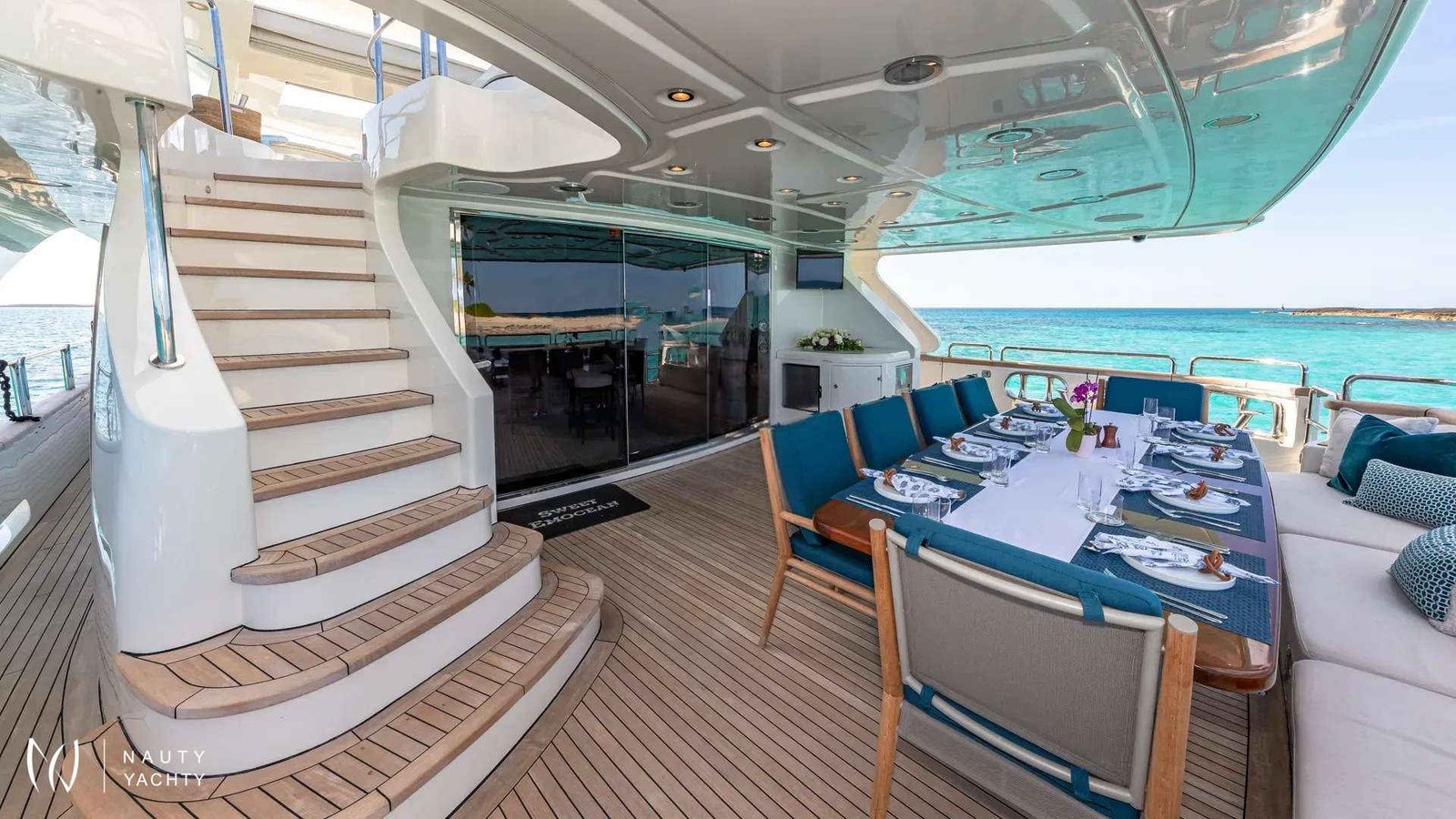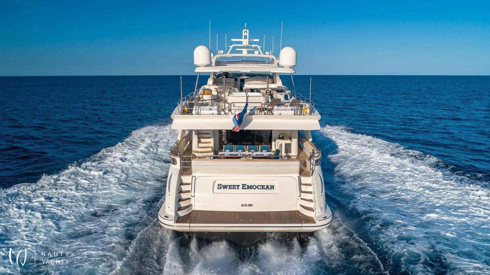 SWEET EMOCEAN completed an extensive $3.5 million refit in 2020, that’s guaranteed to upgrade her yachting experience. Her interior and exterior refit highlights include new mosaic tiles, new bar, ensuite bath renovations, full AV and IT systems upgrade, fine linens, and plush carpet. There’s also an added beach club with all new toys, 30’ tow tender, and sea bobs. SWEET EMOCEAN is bound to turn heads.She accommodates 10 guests in 5 luxurious ensuite staterooms — 2 of which are twins that can convert into queens, making her the perfect boat for 5 couples or a family. SWEET EMOCEAN’S large flybridge has a retractable roof so you can comfortably enjoy soaking up the sun or reading a book in the shade.Her crew is fun and professional and offer refined formal service. The chef makes a lobster ravioli that rivals a five-star restaurant. SWEET EMOCEAN is chartering in some of the most beautiful locations in the world, including The Bahamas and other tropical islands in the Caribbean. She’s ready to help you relax on your next ocean getaway.