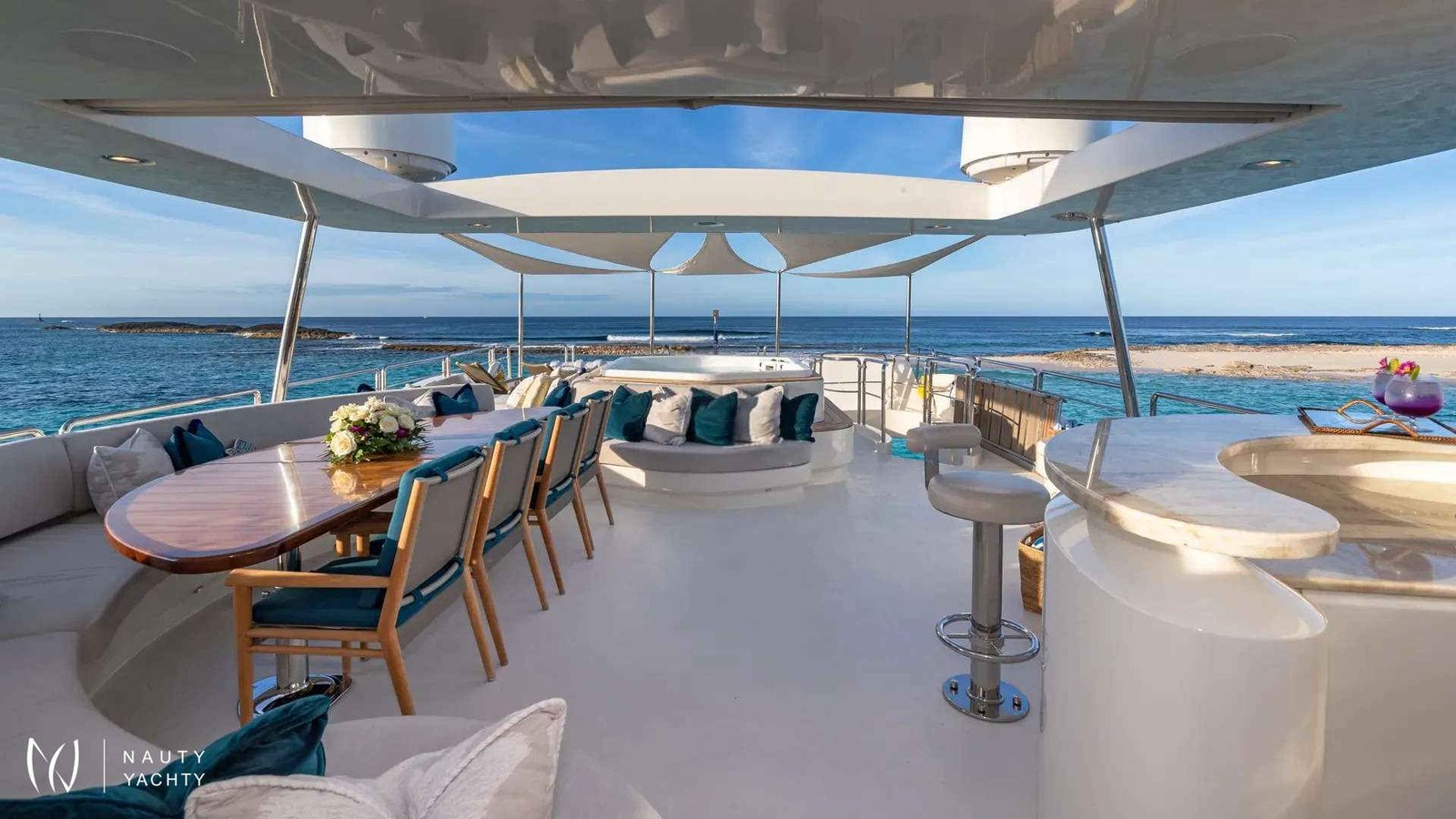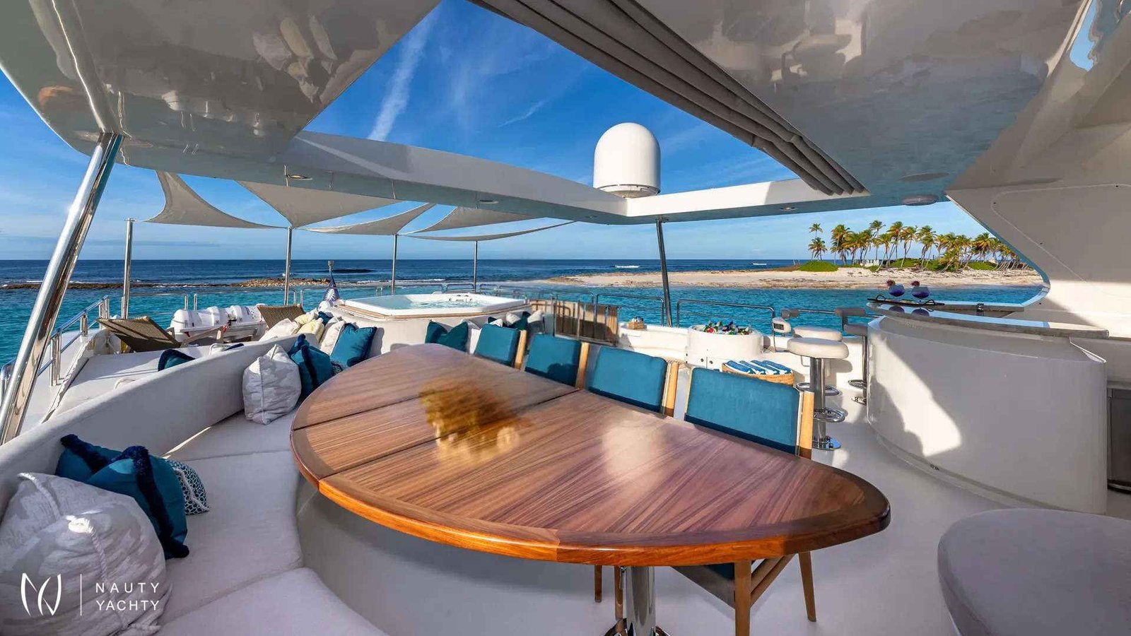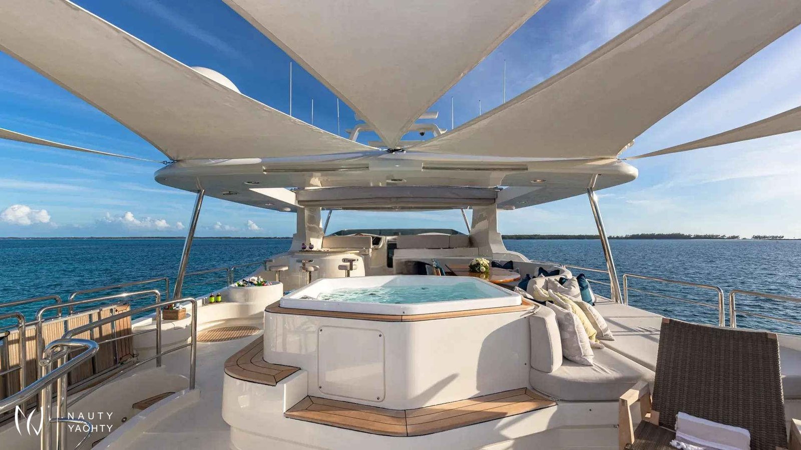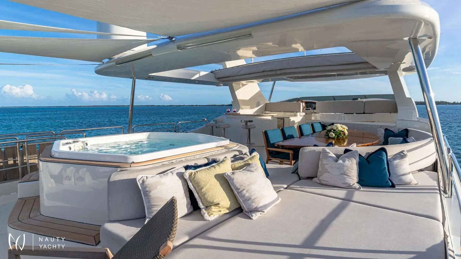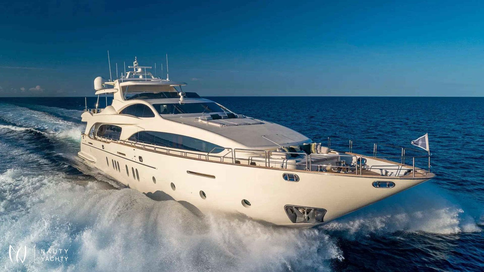 SWEET EMOCEAN completed an extensive $3.5 million refit in 2020, that’s guaranteed to upgrade her yachting experience. Her interior and exterior refit highlights include new mosaic tiles, new bar, ensuite bath renovations, full AV and IT systems upgrade, fine linens, and plush carpet. There’s also an added beach club with all new toys, 30’ tow tender, and sea bobs. SWEET EMOCEAN is bound to turn heads.She accommodates 10 guests in 5 luxurious ensuite staterooms — 2 of which are twins that can convert into queens, making her the perfect boat for 5 couples or a family. SWEET EMOCEAN’S large flybridge has a retractable roof so you can comfortably enjoy soaking up the sun or reading a book in the shade.Her crew is fun and professional and offer refined formal service. The chef makes a lobster ravioli that rivals a five-star restaurant. SWEET EMOCEAN is chartering in some of the most beautiful locations in the world, including The Bahamas and other tropical islands in the Caribbean. She’s ready to help you relax on your next ocean getaway.