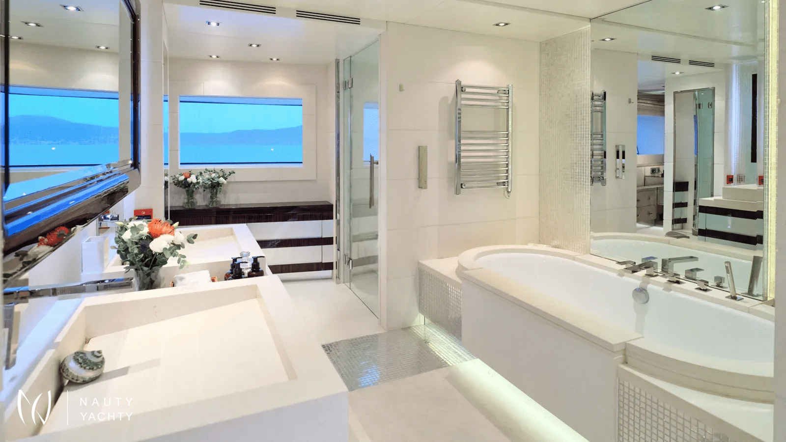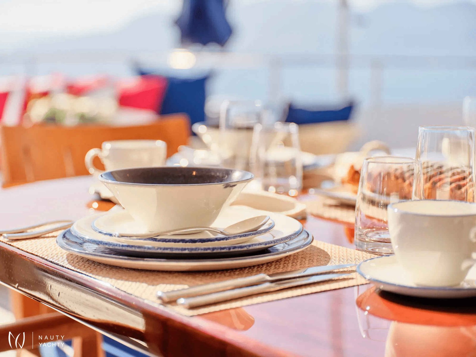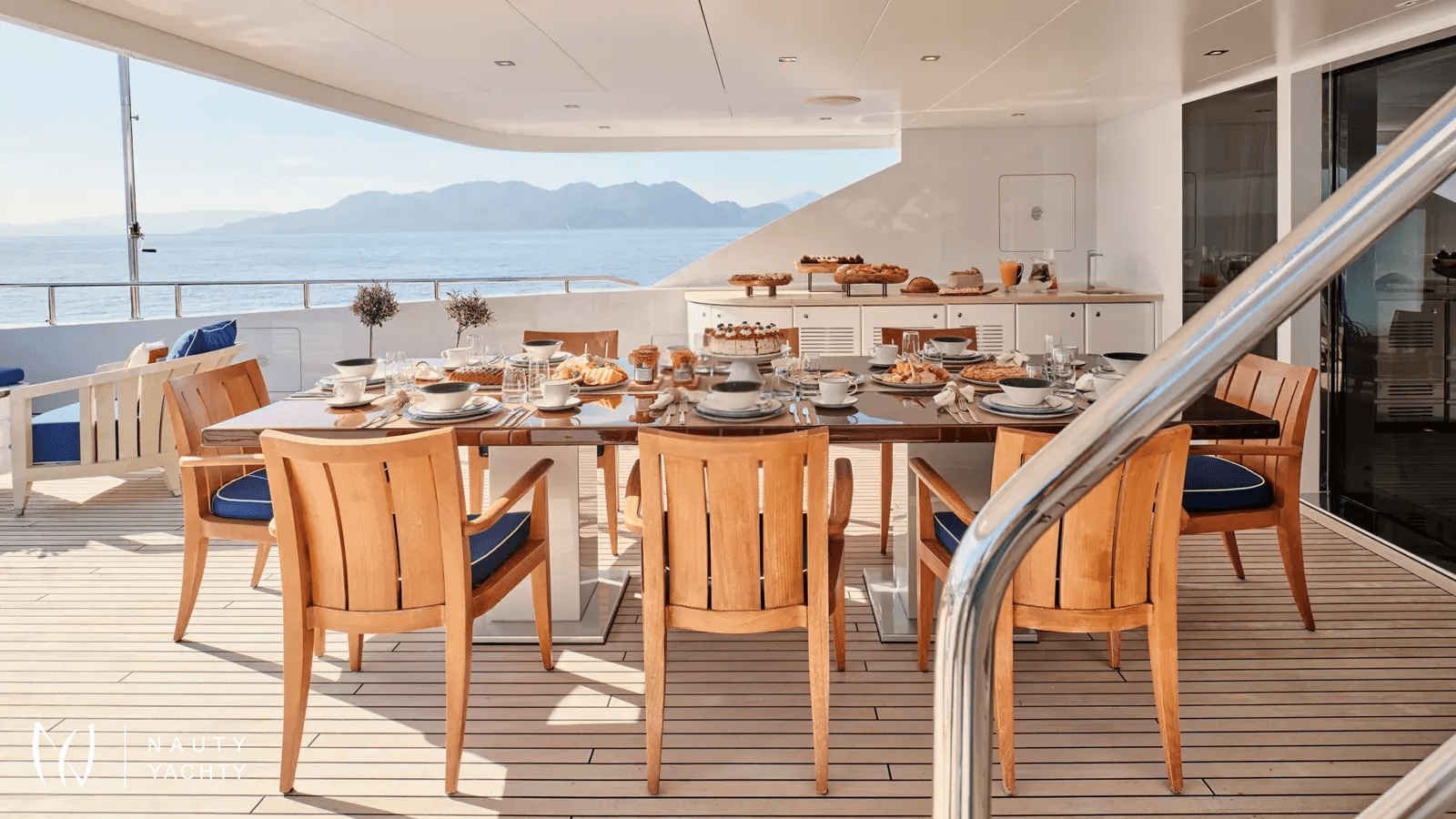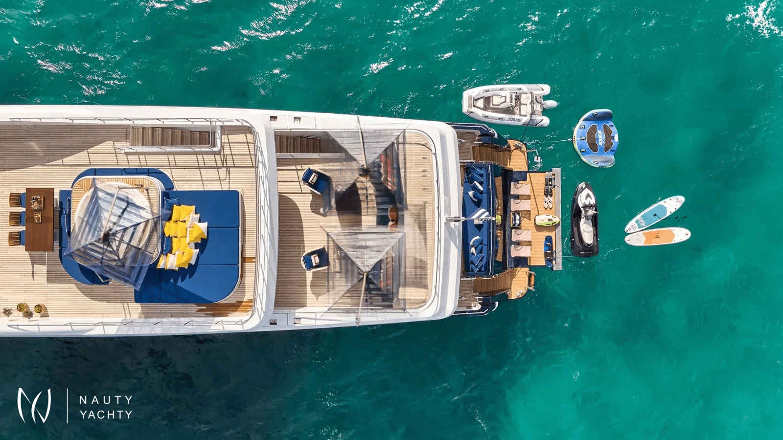 Guests will be tendered in full style enabling access to the most secluded coves whilst warranting absolute safety. The tender is towed behind the yacht under way. The cruising speed of 15.5 KN knots is the actual speed including the towed tender.