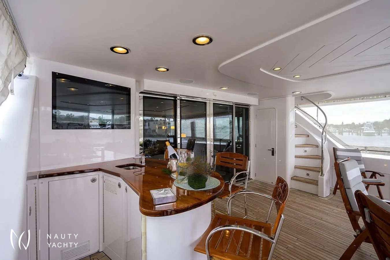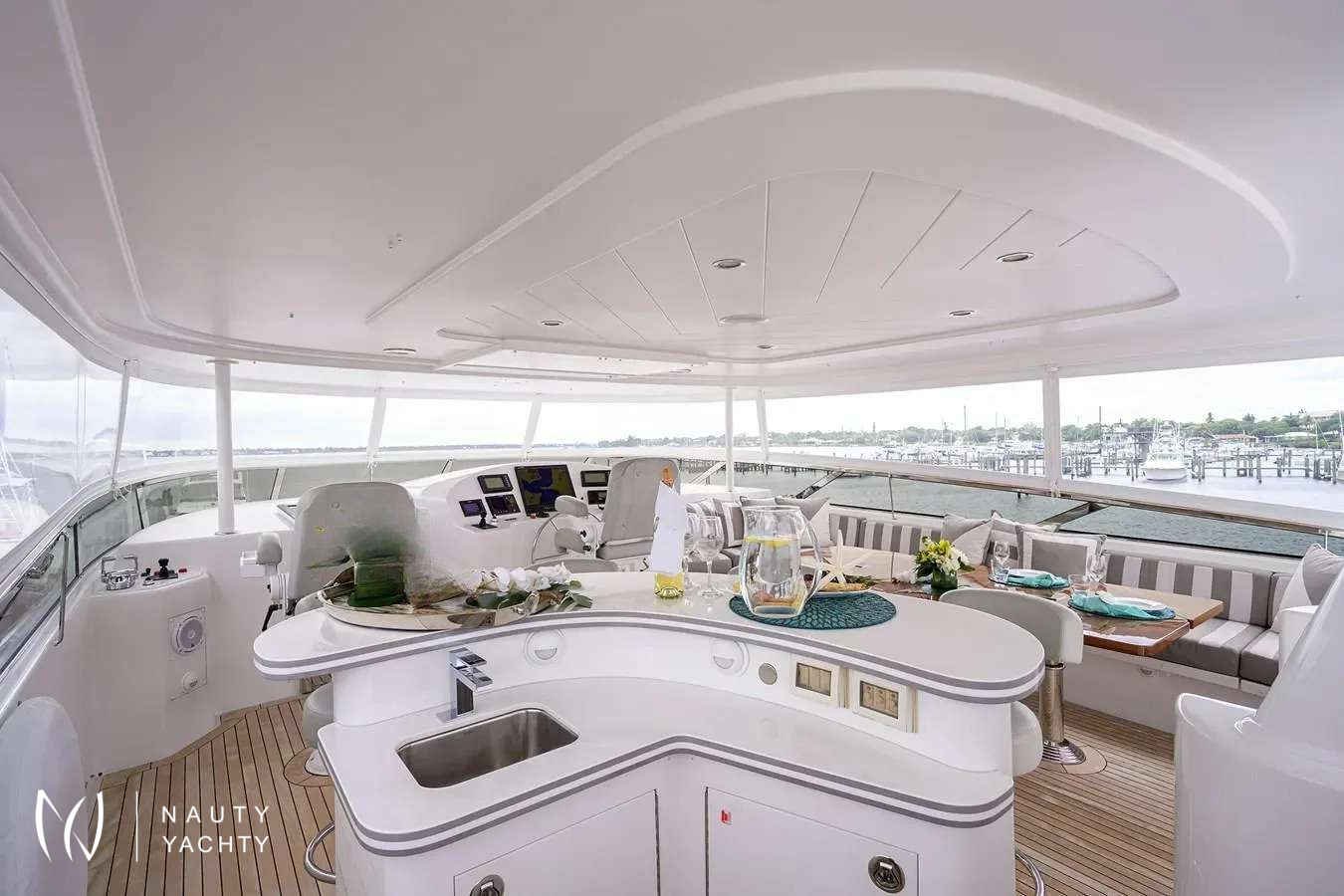 Al fresco dining on the main deck aft, flybridge under hard top, bar and al fresco dining