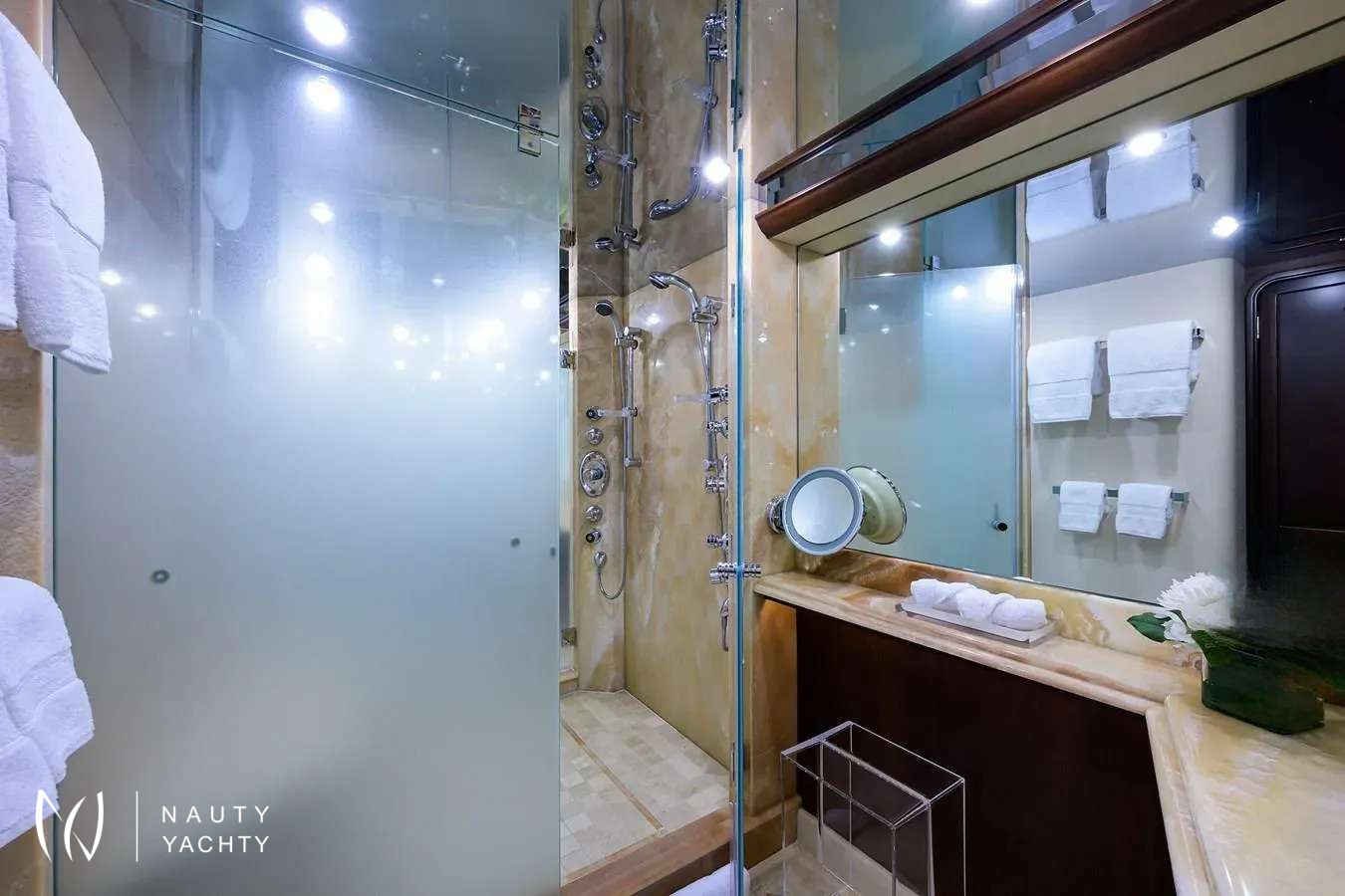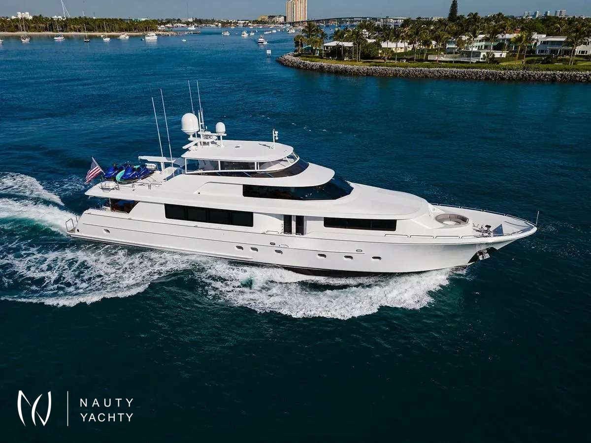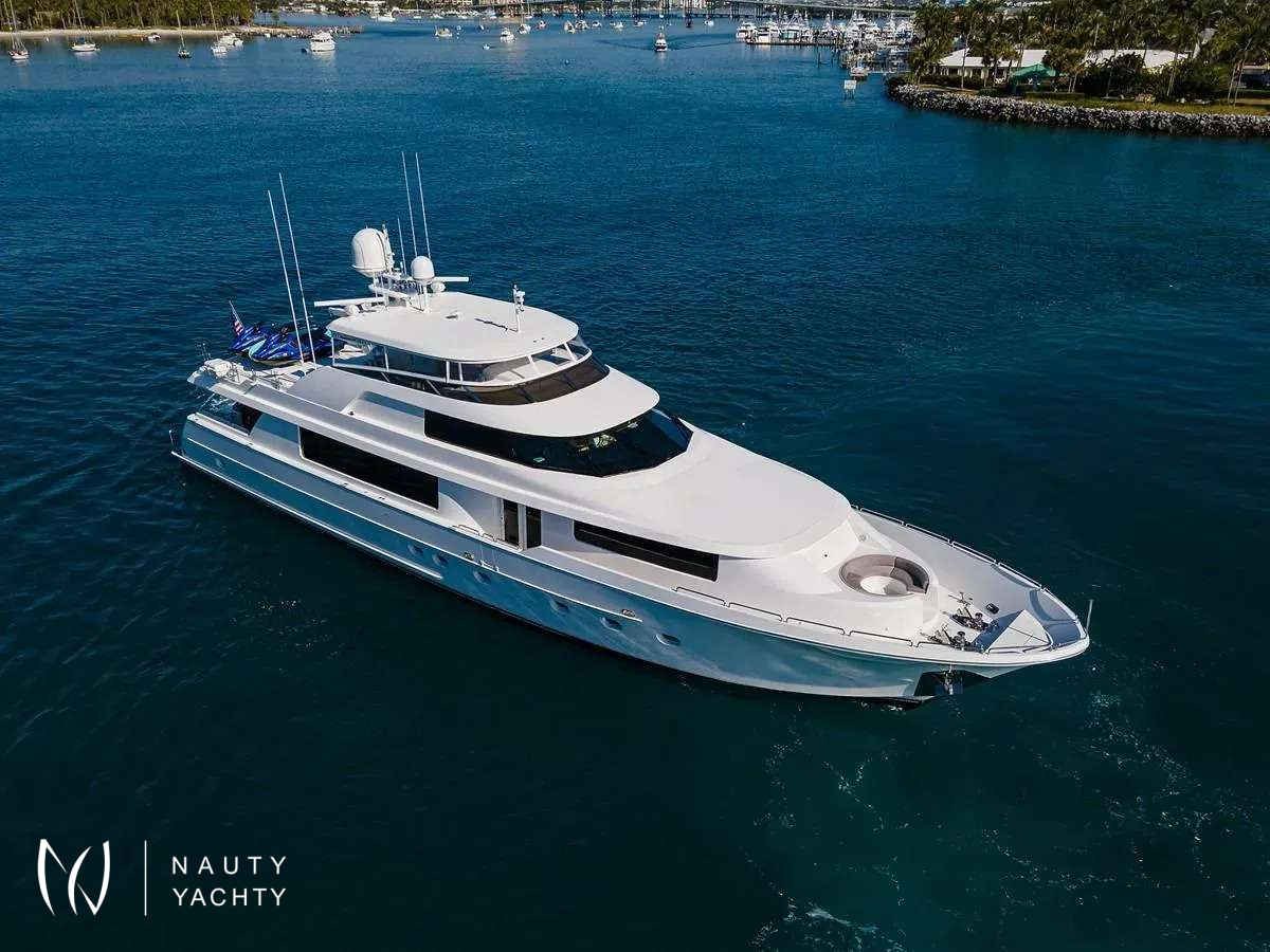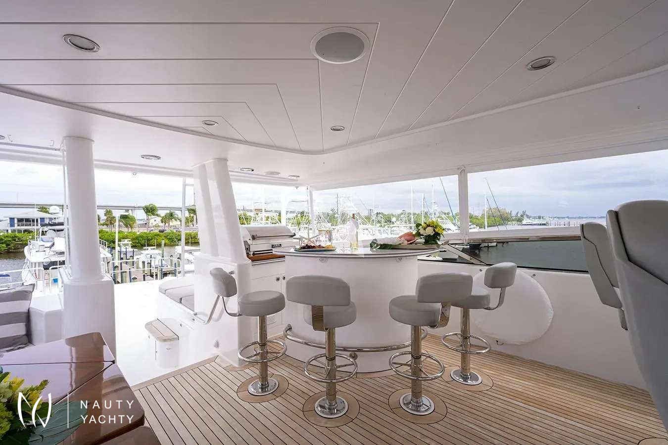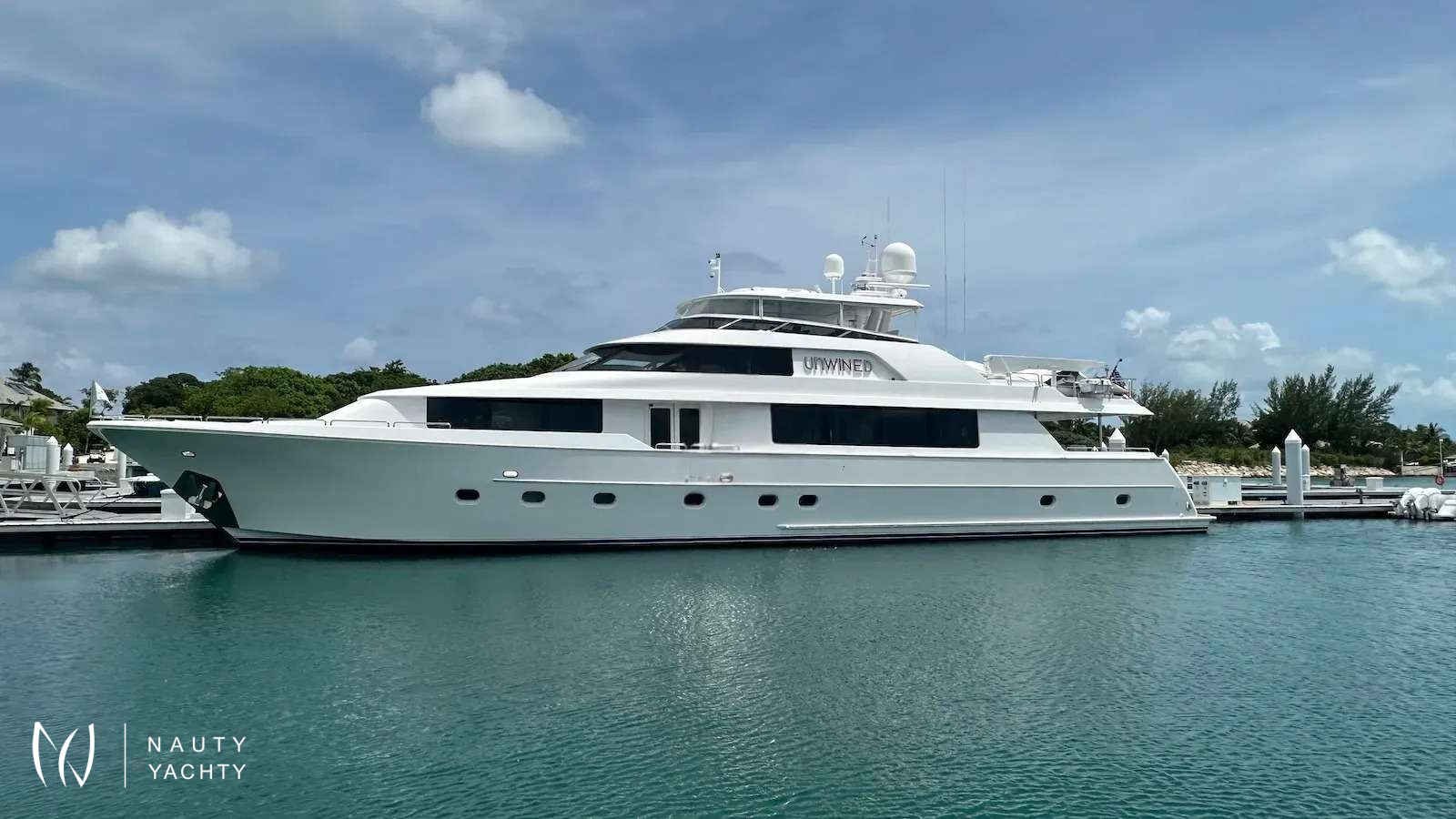 UNWINED is a classic example of Westport style and sure to please every guest. No expense has been spared in preparing her for the luxury charter market (major refit 2023). UNWINED accommodates 8 guests in 4 cabins, each en suite with cedar-lined closets and TV / with satellite receiver and surround sound. The yacht tows a 35 ft Boston Whaler Outrage outfitted for exciting offshore fishing (towed), a 17ft RIB and a selection of watersport toys. Make your great Bahamas vacation escape today and "unwined"!______CABINSVIP QUEEN CABIN: Forward of the galley / below. Walk-in closet. Settee to starboard, vanity to portBathroom with marble counter. Shower_____BELOWMASTER CABIN. Below amidship forward. Full-width with double entrance doorsCALIFORNIA KING (facing aft). Large walk-in closet to starboard at entranceFull-width his / her bathroom forward of the bed with oversize central shower / honey onyx marble throughoutDesk and sofa to port, large dresser to starboard. TV with satellite receiver (lift system concealed overhead)VIP QUEEN. Port. ShowerTWIN. Starboard (twin beds not convertible). ShowerWALK THROUGHDirecTV HD throughout the yacht / Latin America and USAPlex - central movie server available in the master cabin and main salonSurround sound in all guest cabins, main salon and flybridgeMusic via Spotify / iPads control audio and video throughout the interior and on the flybridgeMAIN DECK. Open planDouble sliding doors aft. Ample seating. Large window for expansive views and natural light.TV to portFormal dining forward for 8 guests (credenza separate the salon and the dining area)Powder room forward off foyer"COUNTRY KITCHEN" galley forwardRaised settee with casual black granite dining table, 2 stainless steel and black leather high chairs.TVWalk-around center island. Stainless steel appliances and black granite countertops.MAIN AFT DECKBuilt in settee aft with custom high-gloss high-low table (sliding base for al fresco dinning or cocktail service)6 chairs. Port forward service bar with stools. TVRoll up Eisenglass screens provide comfort in inclement weatherChild safety gates on port and starboard stair access to the swim platform with fresh water showerHydraulic passerelle; port & starboard side boardingFLYBRIDGE. Accessed via starboard main deck stairwell or through the raised pilot houseUnder hard top offers shaded al fresco dining and loungingWrap-around settee with 2 fold-out cocktail tables (convertible to a dining table seating 8)Full service bar with stools to port. BBQ grill. Concealed TV on a lift systemFront and sides of the flybridge can be enclosed with roll up Eisenglass screens to protect guests in inclement weatherSUNDECK: Jacuzzi to port (converts to large raised sunpad). L-shaped settee with table to starboardSliding hatch access to spiral staircase to main aft deckFOREDECKThe foredeck features a circular seating area--a private haven to "unwined" and take in the views of the charter destination.____________TV sizes:Main salon55" TV / DVR / DirecTV HD receiver (USA / Latin America)Main deck aft32" TV with tuner and satellite receiverFlybridge32" TV with tuner on lift system, concealed overheadMaster cabin40" TV /DVD/CD on lift system, concealed overheadTuner & satellite receiver, Apple TVVIP Queen and the Queen & Twin cabins below each with:29" TV with tuner & satellite receiver