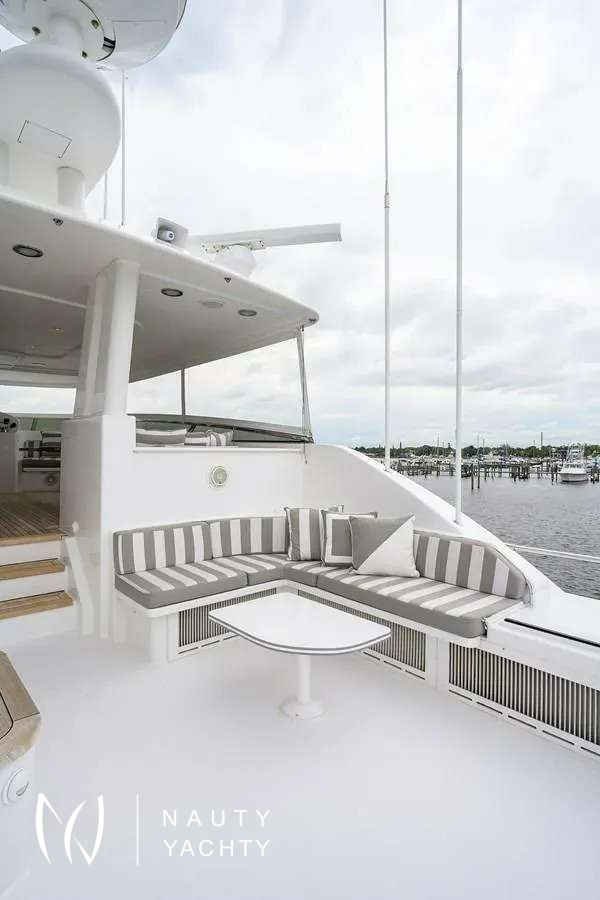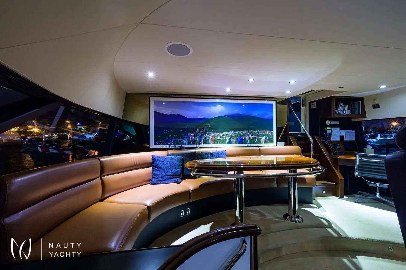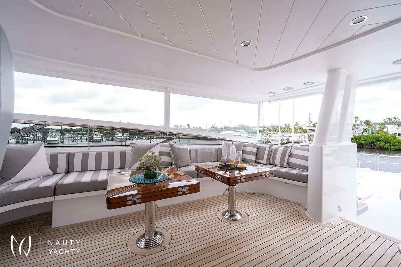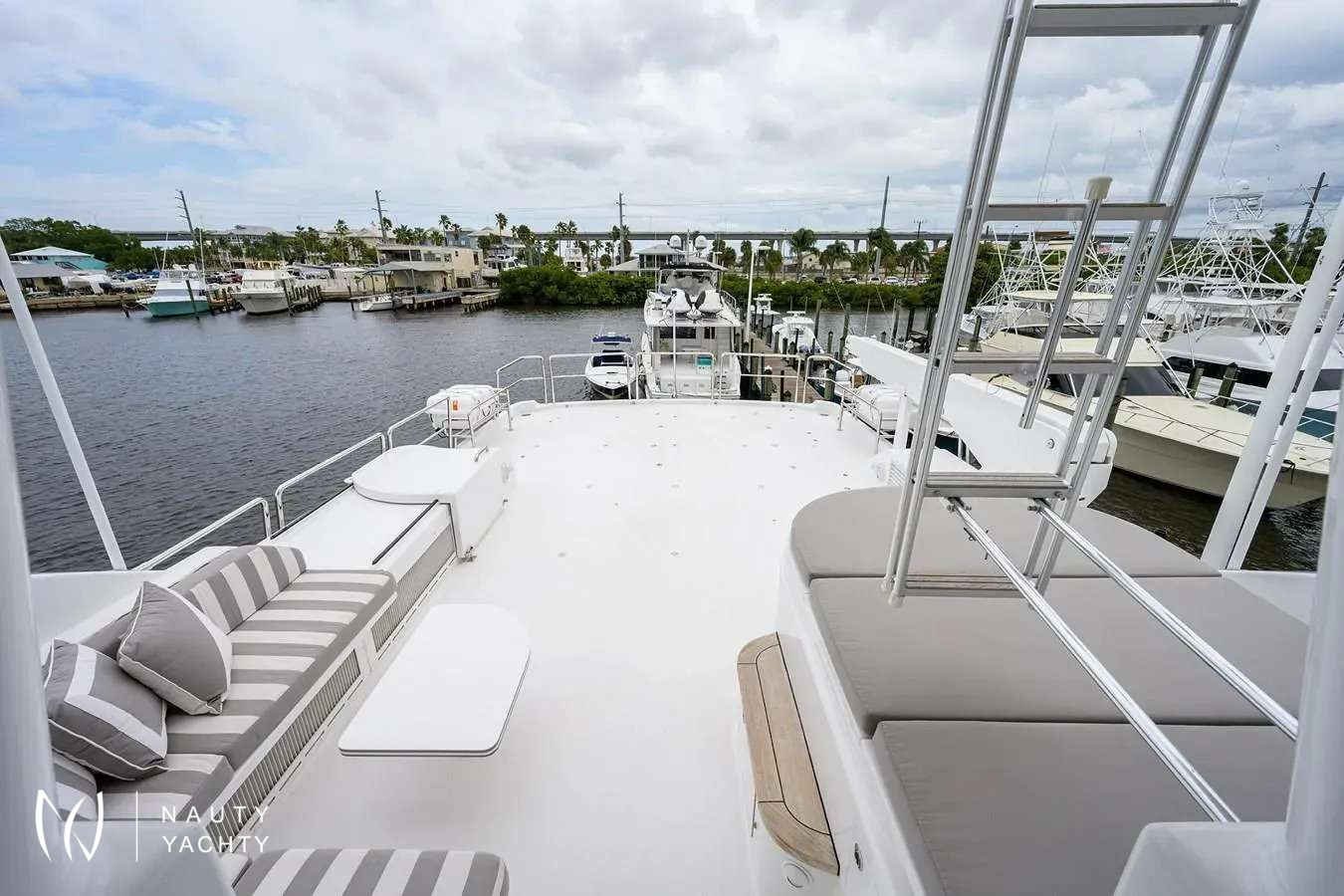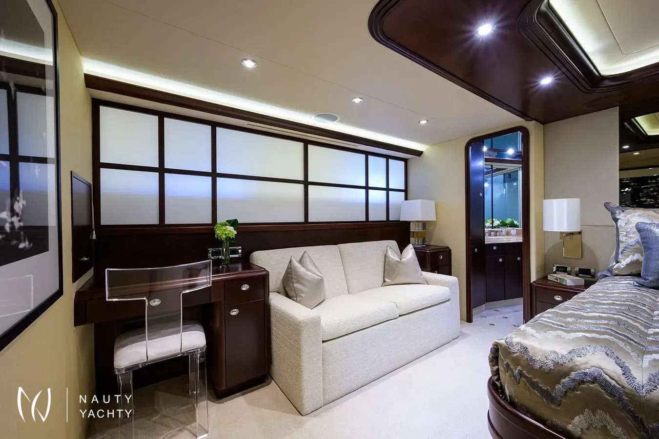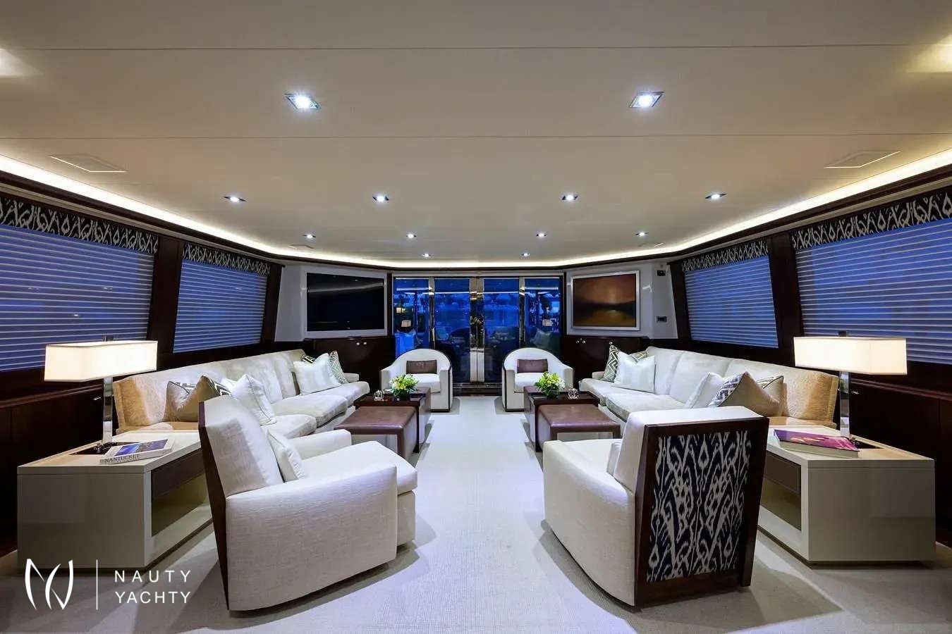 UNWINED is a classic example of Westport style and sure to please every guest. No expense has been spared in preparing her for the luxury charter market (major refit 2023). UNWINED accommodates 8 guests in 4 cabins, each en suite with cedar-lined closets and TV / with satellite receiver and surround sound. The yacht tows a 35 ft Boston Whaler Outrage outfitted for exciting offshore fishing (towed), a 17ft RIB and a selection of watersport toys. Make your great Bahamas vacation escape today and "unwined"!______CABINSVIP QUEEN CABIN: Forward of the galley / below. Walk-in closet. Settee to starboard, vanity to portBathroom with marble counter. Shower_____BELOWMASTER CABIN. Below amidship forward. Full-width with double entrance doorsCALIFORNIA KING (facing aft). Large walk-in closet to starboard at entranceFull-width his / her bathroom forward of the bed with oversize central shower / honey onyx marble throughoutDesk and sofa to port, large dresser to starboard. TV with satellite receiver (lift system concealed overhead)VIP QUEEN. Port. ShowerTWIN. Starboard (twin beds not convertible). ShowerWALK THROUGHDirecTV HD throughout the yacht / Latin America and USAPlex - central movie server available in the master cabin and main salonSurround sound in all guest cabins, main salon and flybridgeMusic via Spotify / iPads control audio and video throughout the interior and on the flybridgeMAIN DECK. Open planDouble sliding doors aft. Ample seating. Large window for expansive views and natural light.TV to portFormal dining forward for 8 guests (credenza separate the salon and the dining area)Powder room forward off foyer"COUNTRY KITCHEN" galley forwardRaised settee with casual black granite dining table, 2 stainless steel and black leather high chairs.TVWalk-around center island. Stainless steel appliances and black granite countertops.MAIN AFT DECKBuilt in settee aft with custom high-gloss high-low table (sliding base for al fresco dinning or cocktail service)6 chairs. Port forward service bar with stools. TVRoll up Eisenglass screens provide comfort in inclement weatherChild safety gates on port and starboard stair access to the swim platform with fresh water showerHydraulic passerelle; port & starboard side boardingFLYBRIDGE. Accessed via starboard main deck stairwell or through the raised pilot houseUnder hard top offers shaded al fresco dining and loungingWrap-around settee with 2 fold-out cocktail tables (convertible to a dining table seating 8)Full service bar with stools to port. BBQ grill. Concealed TV on a lift systemFront and sides of the flybridge can be enclosed with roll up Eisenglass screens to protect guests in inclement weatherSUNDECK: Jacuzzi to port (converts to large raised sunpad). L-shaped settee with table to starboardSliding hatch access to spiral staircase to main aft deckFOREDECKThe foredeck features a circular seating area--a private haven to "unwined" and take in the views of the charter destination.____________TV sizes:Main salon55" TV / DVR / DirecTV HD receiver (USA / Latin America)Main deck aft32" TV with tuner and satellite receiverFlybridge32" TV with tuner on lift system, concealed overheadMaster cabin40" TV /DVD/CD on lift system, concealed overheadTuner & satellite receiver, Apple TVVIP Queen and the Queen & Twin cabins below each with:29" TV with tuner & satellite receiver