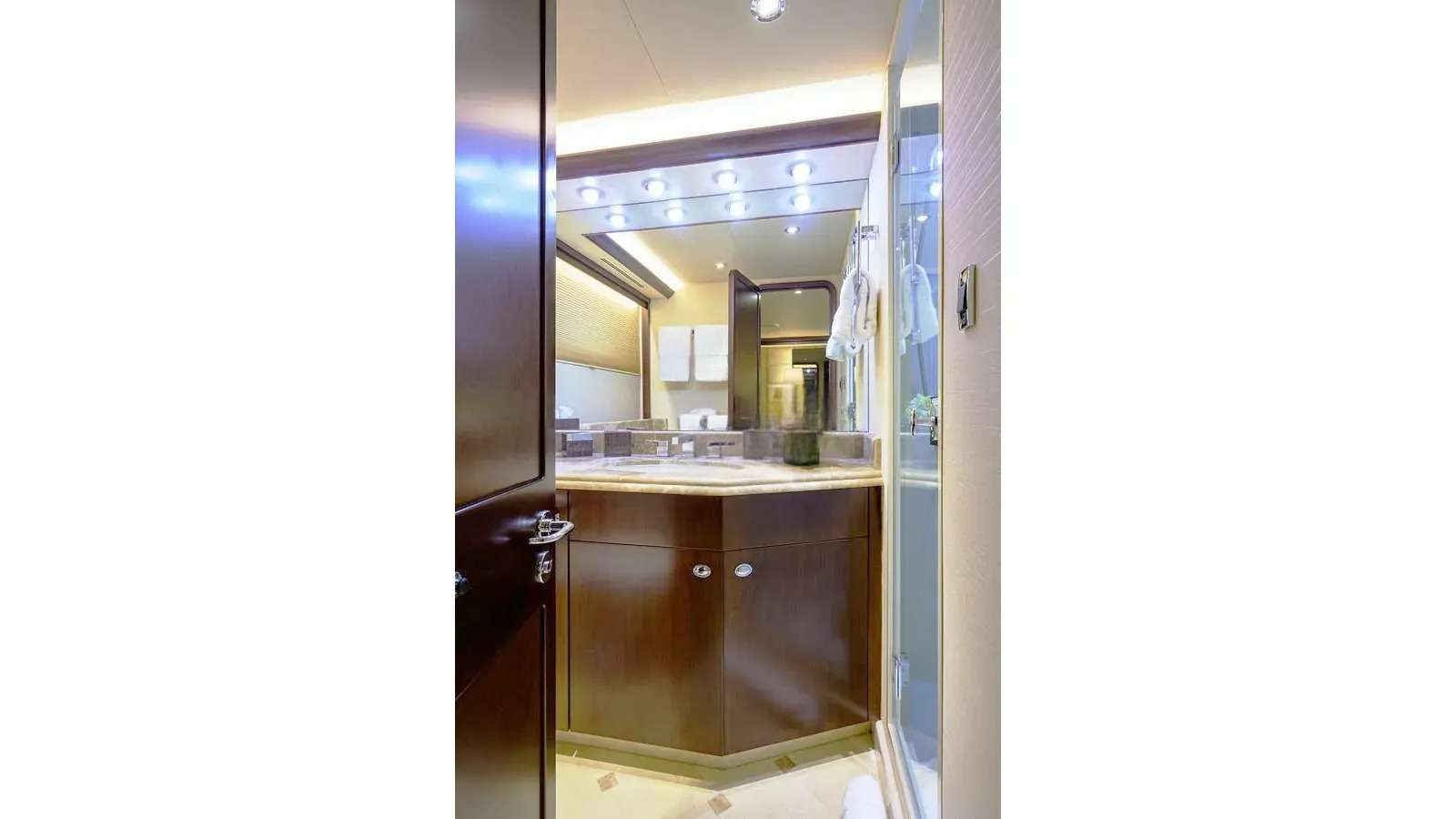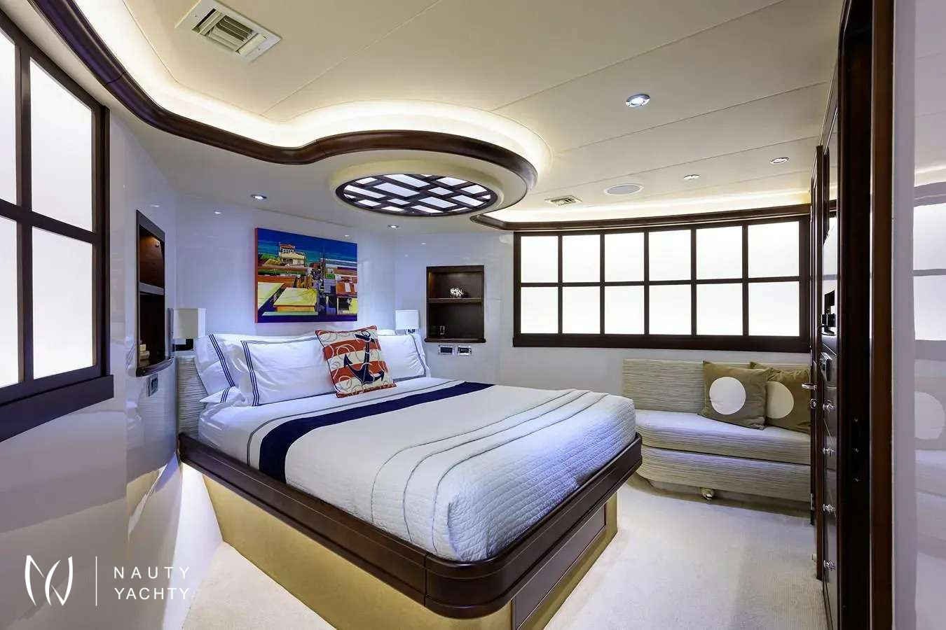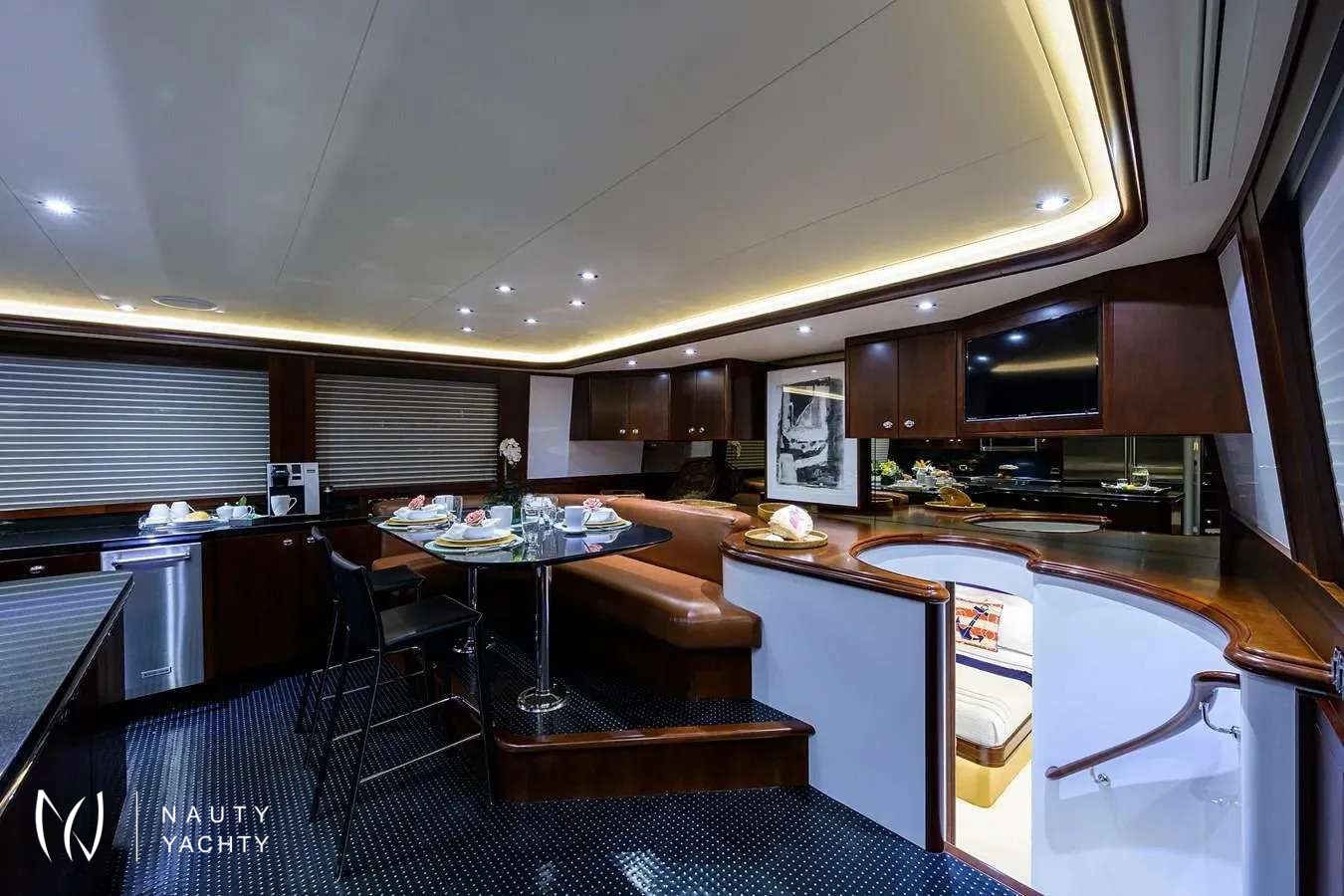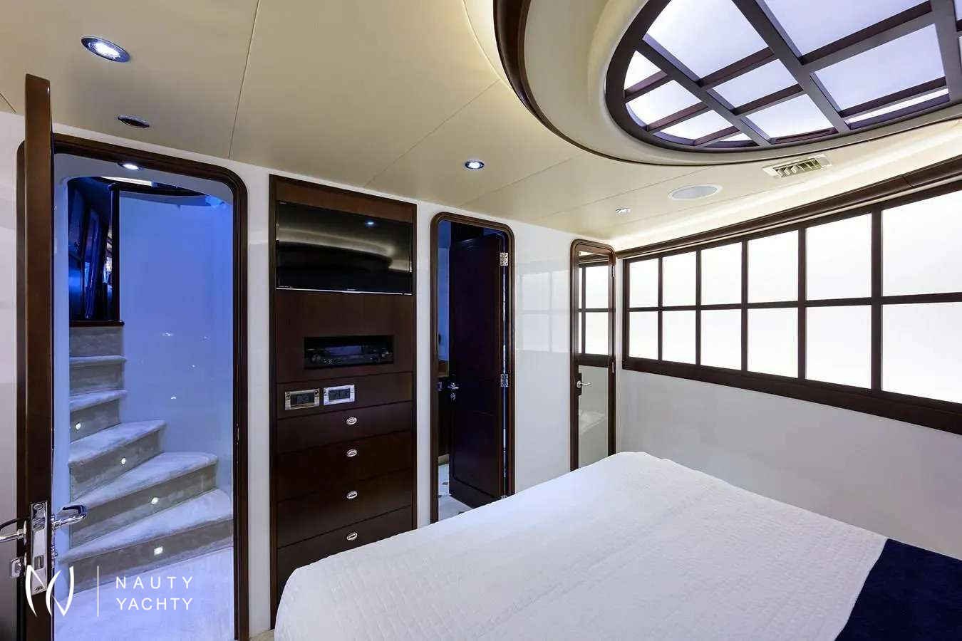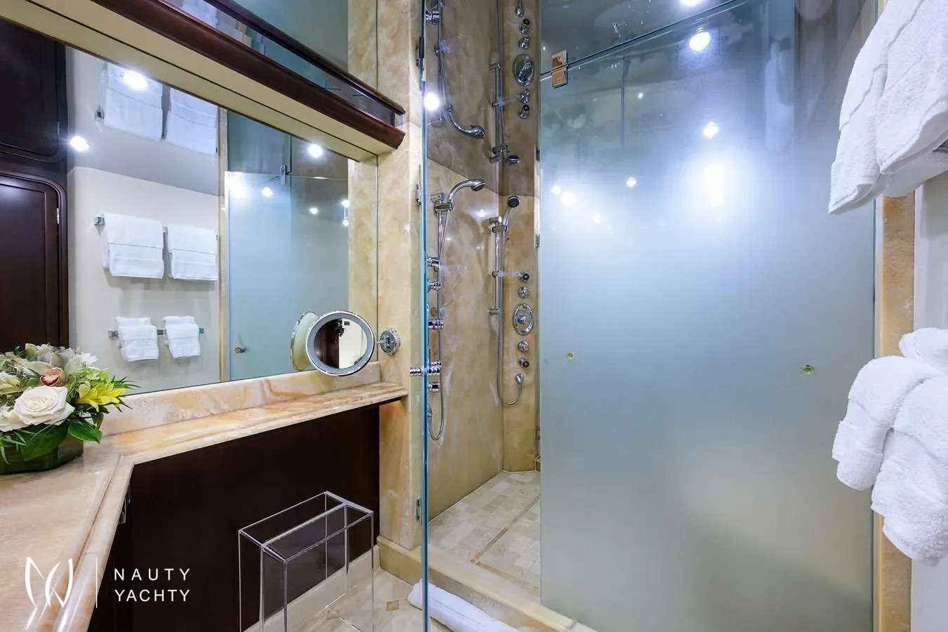 UNWINED is a classic example of Westport style and sure to please every guest. No expense has been spared in preparing her for the luxury charter market (major refit 2023). UNWINED accommodates 8 guests in 4 cabins, each en suite with cedar-lined closets and TV / with satellite receiver and surround sound. The yacht tows a 35 ft Boston Whaler Outrage outfitted for exciting offshore fishing (towed), a 17ft RIB and a selection of watersport toys. Make your great Bahamas vacation escape today and "unwined"!______CABINSVIP QUEEN CABIN: Forward of the galley / below. Walk-in closet. Settee to starboard, vanity to portBathroom with marble counter. Shower_____BELOWMASTER CABIN. Below amidship forward. Full-width with double entrance doorsCALIFORNIA KING (facing aft). Large walk-in closet to starboard at entranceFull-width his / her bathroom forward of the bed with oversize central shower / honey onyx marble throughoutDesk and sofa to port, large dresser to starboard. TV with satellite receiver (lift system concealed overhead)VIP QUEEN. Port. ShowerTWIN. Starboard (twin beds not convertible). ShowerWALK THROUGHDirecTV HD throughout the yacht / Latin America and USAPlex - central movie server available in the master cabin and main salonSurround sound in all guest cabins, main salon and flybridgeMusic via Spotify / iPads control audio and video throughout the interior and on the flybridgeMAIN DECK. Open planDouble sliding doors aft. Ample seating. Large window for expansive views and natural light.TV to portFormal dining forward for 8 guests (credenza separate the salon and the dining area)Powder room forward off foyer"COUNTRY KITCHEN" galley forwardRaised settee with casual black granite dining table, 2 stainless steel and black leather high chairs.TVWalk-around center island. Stainless steel appliances and black granite countertops.MAIN AFT DECKBuilt in settee aft with custom high-gloss high-low table (sliding base for al fresco dinning or cocktail service)6 chairs. Port forward service bar with stools. TVRoll up Eisenglass screens provide comfort in inclement weatherChild safety gates on port and starboard stair access to the swim platform with fresh water showerHydraulic passerelle; port & starboard side boardingFLYBRIDGE. Accessed via starboard main deck stairwell or through the raised pilot houseUnder hard top offers shaded al fresco dining and loungingWrap-around settee with 2 fold-out cocktail tables (convertible to a dining table seating 8)Full service bar with stools to port. BBQ grill. Concealed TV on a lift systemFront and sides of the flybridge can be enclosed with roll up Eisenglass screens to protect guests in inclement weatherSUNDECK: Jacuzzi to port (converts to large raised sunpad). L-shaped settee with table to starboardSliding hatch access to spiral staircase to main aft deckFOREDECKThe foredeck features a circular seating area--a private haven to "unwined" and take in the views of the charter destination.____________TV sizes:Main salon55" TV / DVR / DirecTV HD receiver (USA / Latin America)Main deck aft32" TV with tuner and satellite receiverFlybridge32" TV with tuner on lift system, concealed overheadMaster cabin40" TV /DVD/CD on lift system, concealed overheadTuner & satellite receiver, Apple TVVIP Queen and the Queen & Twin cabins below each with:29" TV with tuner & satellite receiver