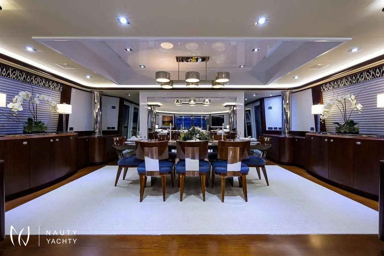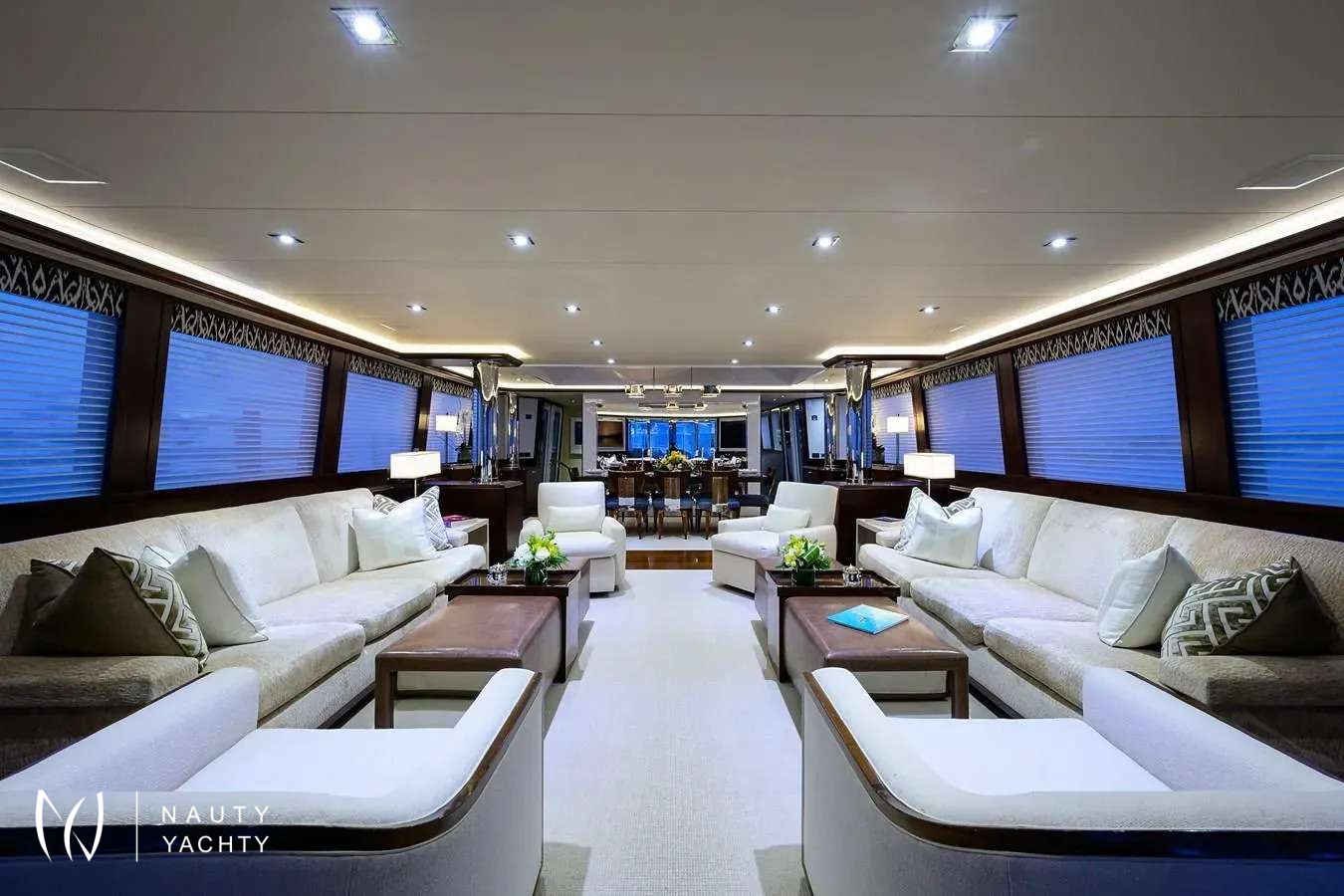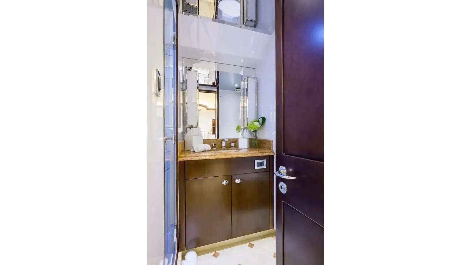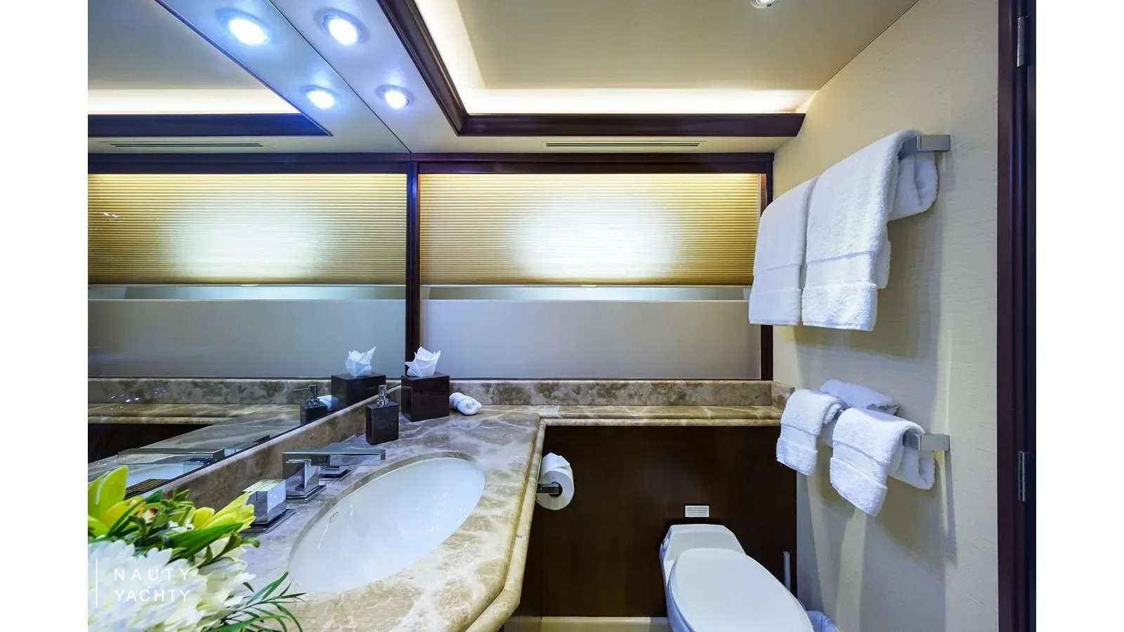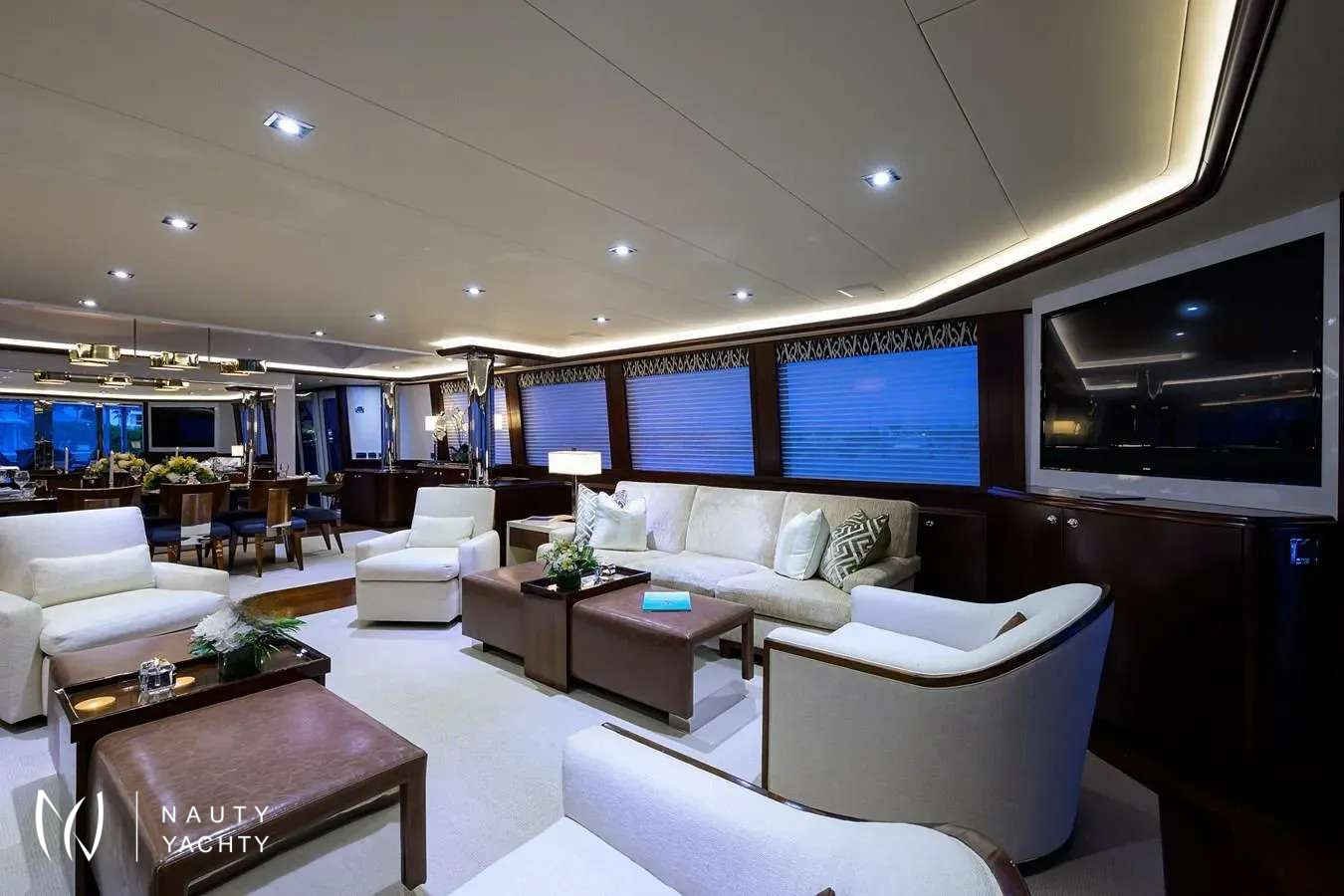 UNWINED is a classic example of Westport style and sure to please every guest. No expense has been spared in preparing her for the luxury charter market (major refit 2023). UNWINED accommodates 8 guests in 4 cabins, each en suite with cedar-lined closets and TV / with satellite receiver and surround sound. The yacht tows a 35 ft Boston Whaler Outrage outfitted for exciting offshore fishing (towed), a 17ft RIB and a selection of watersport toys. Make your great Bahamas vacation escape today and "unwined"!______CABINSVIP QUEEN CABIN: Forward of the galley / below. Walk-in closet. Settee to starboard, vanity to portBathroom with marble counter. Shower_____BELOWMASTER CABIN. Below amidship forward. Full-width with double entrance doorsCALIFORNIA KING (facing aft). Large walk-in closet to starboard at entranceFull-width his / her bathroom forward of the bed with oversize central shower / honey onyx marble throughoutDesk and sofa to port, large dresser to starboard. TV with satellite receiver (lift system concealed overhead)VIP QUEEN. Port. ShowerTWIN. Starboard (twin beds not convertible). ShowerWALK THROUGHDirecTV HD throughout the yacht / Latin America and USAPlex - central movie server available in the master cabin and main salonSurround sound in all guest cabins, main salon and flybridgeMusic via Spotify / iPads control audio and video throughout the interior and on the flybridgeMAIN DECK. Open planDouble sliding doors aft. Ample seating. Large window for expansive views and natural light.TV to portFormal dining forward for 8 guests (credenza separate the salon and the dining area)Powder room forward off foyer"COUNTRY KITCHEN" galley forwardRaised settee with casual black granite dining table, 2 stainless steel and black leather high chairs.TVWalk-around center island. Stainless steel appliances and black granite countertops.MAIN AFT DECKBuilt in settee aft with custom high-gloss high-low table (sliding base for al fresco dinning or cocktail service)6 chairs. Port forward service bar with stools. TVRoll up Eisenglass screens provide comfort in inclement weatherChild safety gates on port and starboard stair access to the swim platform with fresh water showerHydraulic passerelle; port & starboard side boardingFLYBRIDGE. Accessed via starboard main deck stairwell or through the raised pilot houseUnder hard top offers shaded al fresco dining and loungingWrap-around settee with 2 fold-out cocktail tables (convertible to a dining table seating 8)Full service bar with stools to port. BBQ grill. Concealed TV on a lift systemFront and sides of the flybridge can be enclosed with roll up Eisenglass screens to protect guests in inclement weatherSUNDECK: Jacuzzi to port (converts to large raised sunpad). L-shaped settee with table to starboardSliding hatch access to spiral staircase to main aft deckFOREDECKThe foredeck features a circular seating area--a private haven to "unwined" and take in the views of the charter destination.____________TV sizes:Main salon55" TV / DVR / DirecTV HD receiver (USA / Latin America)Main deck aft32" TV with tuner and satellite receiverFlybridge32" TV with tuner on lift system, concealed overheadMaster cabin40" TV /DVD/CD on lift system, concealed overheadTuner & satellite receiver, Apple TVVIP Queen and the Queen & Twin cabins below each with:29" TV with tuner & satellite receiver