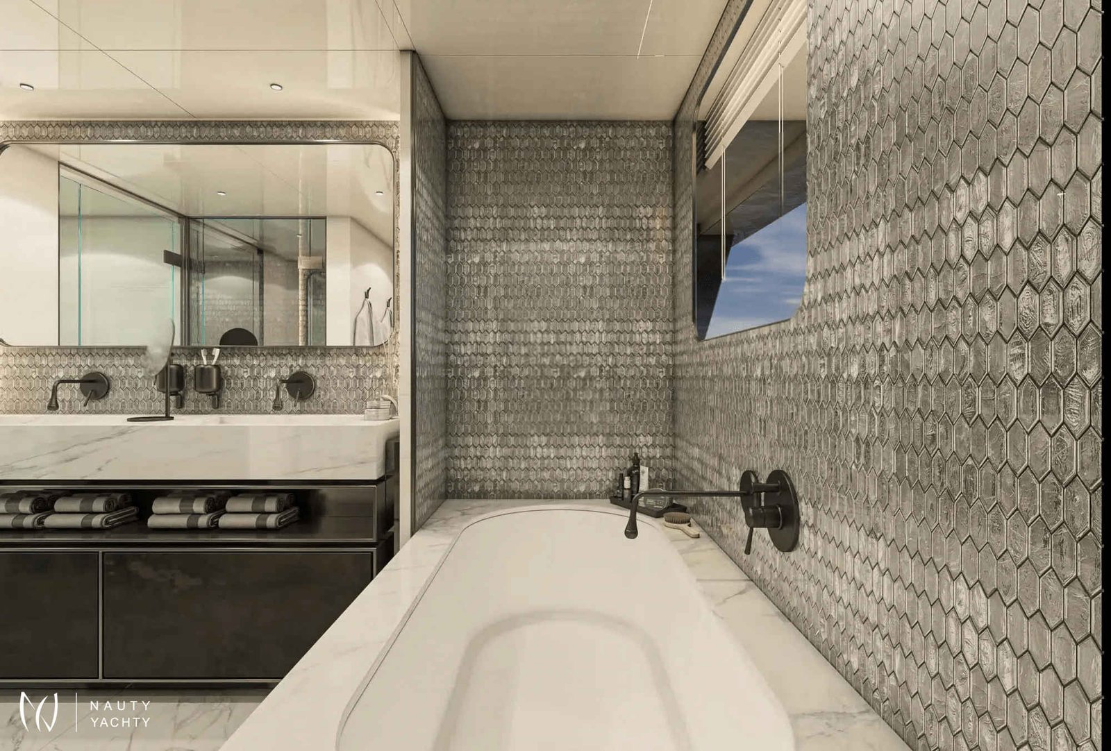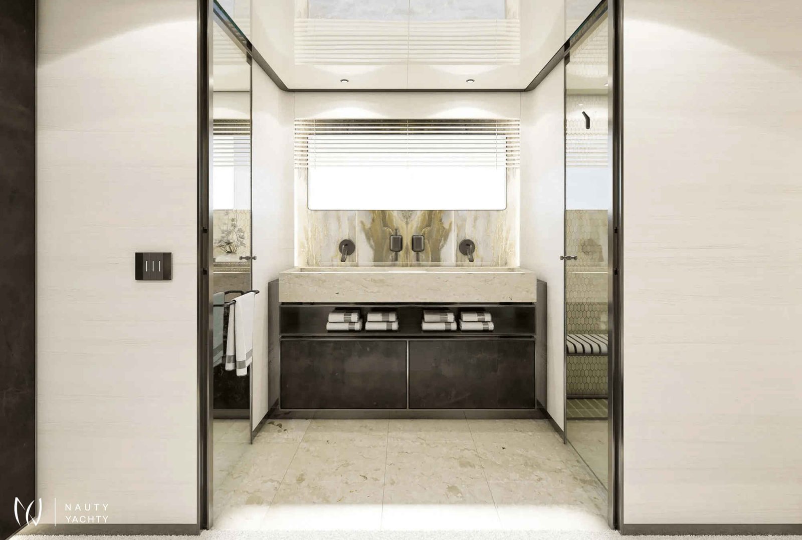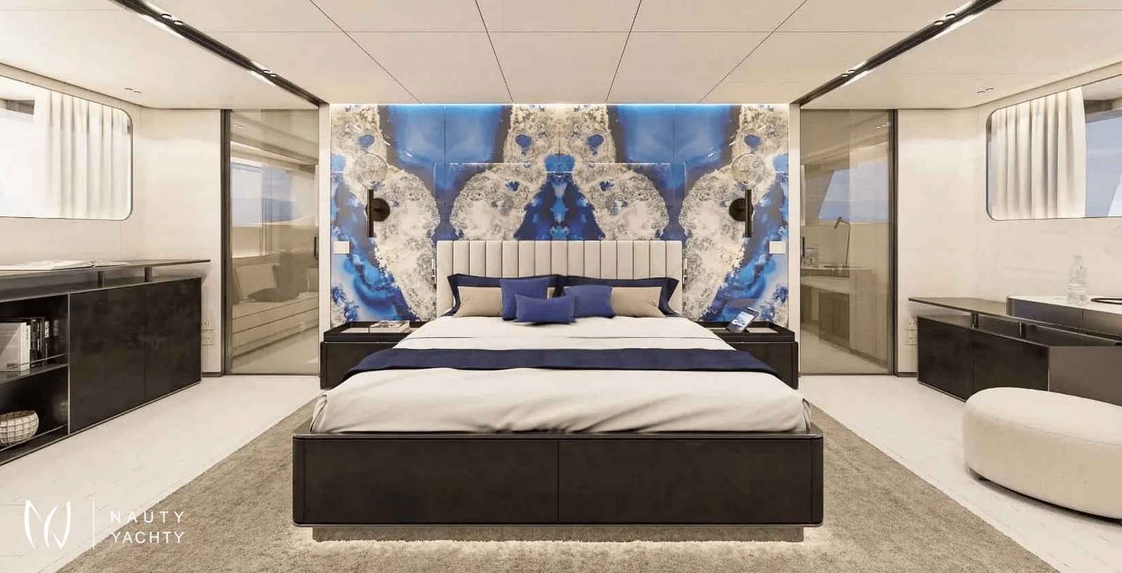 Life on ACQUA CHIARA centres around her spectacular outdoor spaces. The main aft deck captivates with a stunning glass-walled infinity pool, while the expansive sundeck offers the perfect setting for sun-drenched relaxation or sunset cocktails. Her intelligent layout graciously accommodates up to 12 guests in five beautifully appointed staterooms, including a breathtaking full-beam master suite on the main deck, offering ultimate privacy and comfort.