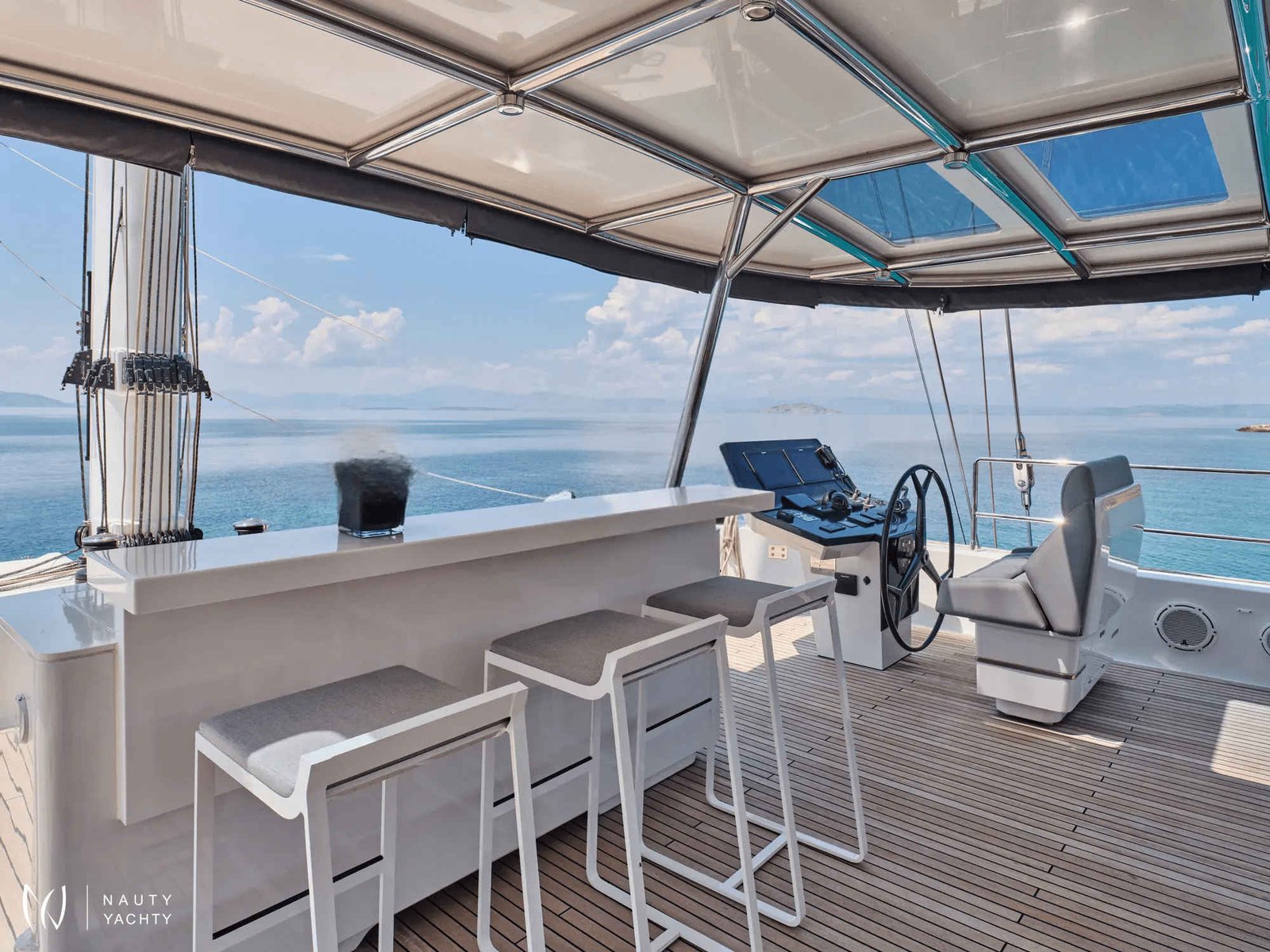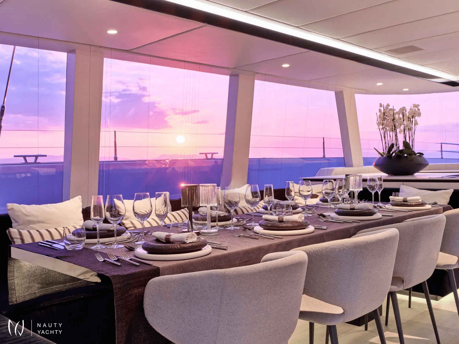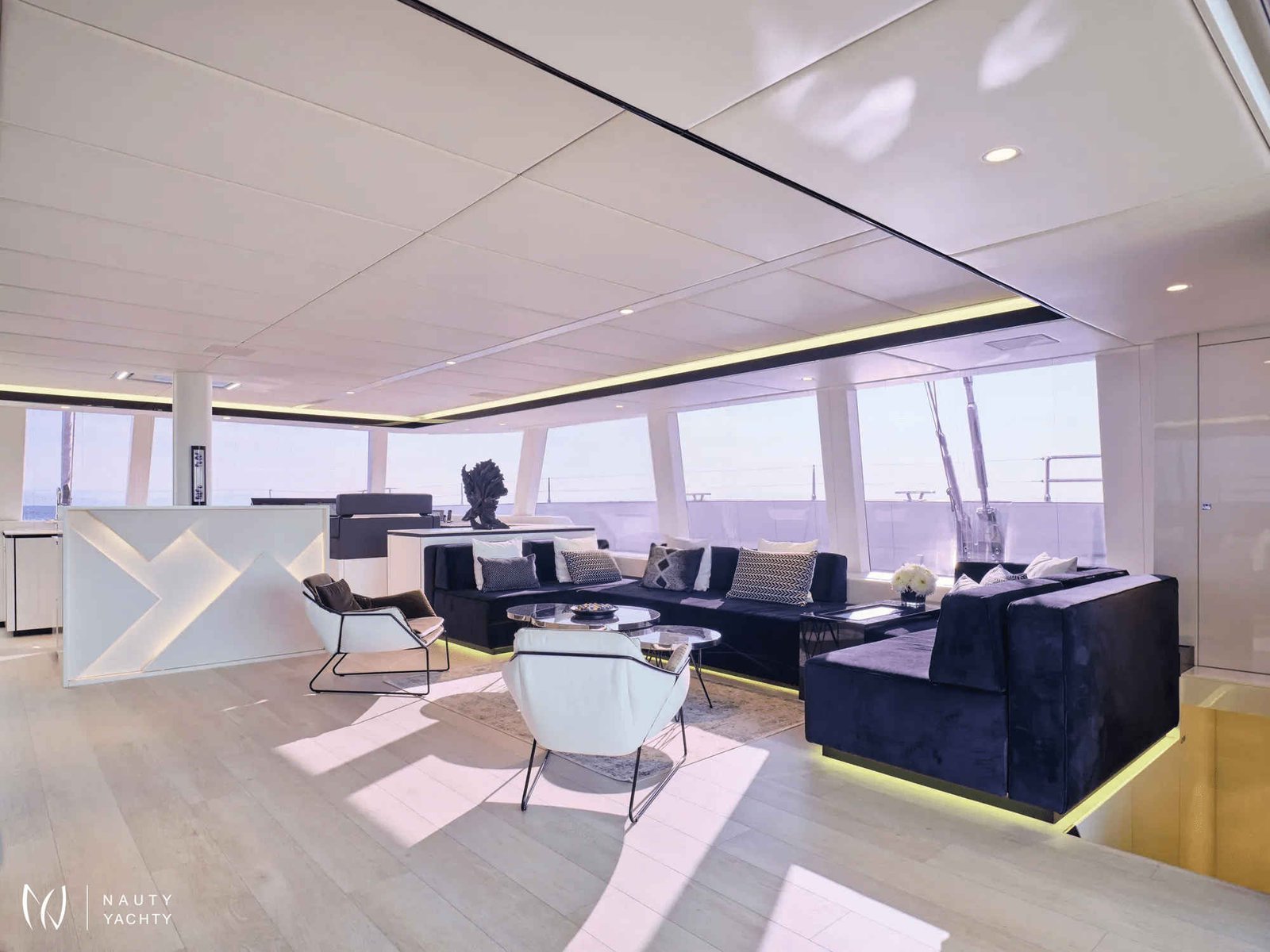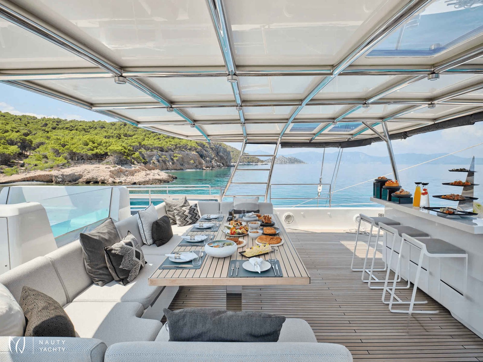 The sleek exterior of Beyond opens to reveal sophisticated interiors designed for comfort and socializing. She uniquely accommodates up to 12 guests across four cabins, making her an exceptional choice for larger groups and families.