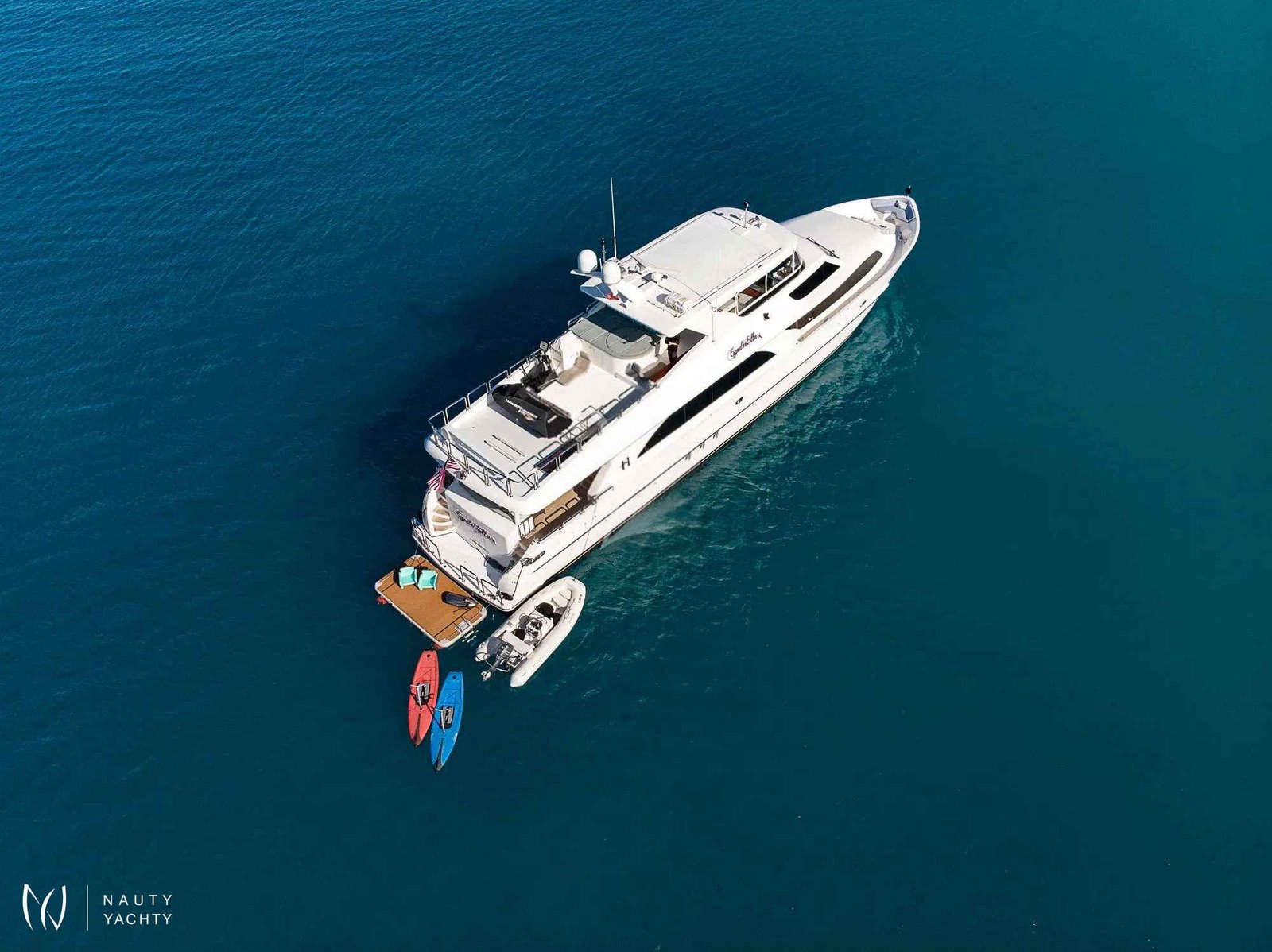 Her expansive, multi-level decks are designed for pure indulgence. Unwind in the flybridge Jacuzzi, sip cocktails at the chic wet bar, or dine al fresco under the stars. The interior is a sanctuary of sophisticated comfort, offering a seamless flow between social spaces and private retreats.