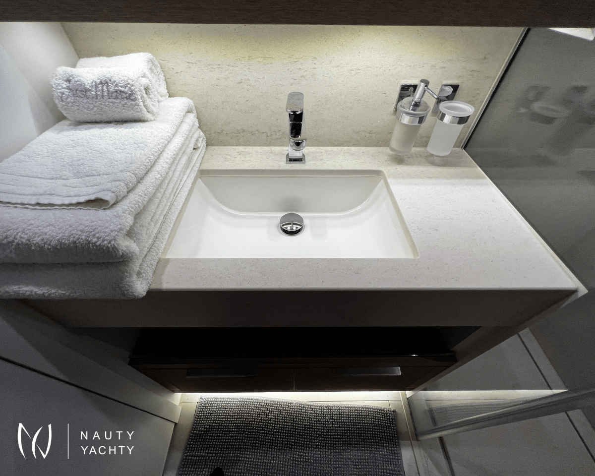Cabin configuration: Spacious master cabin featuring private sitting area, his & hers closets, and a private balcony. Two VIP cabins both feature queen berths all with private bathrooms.
