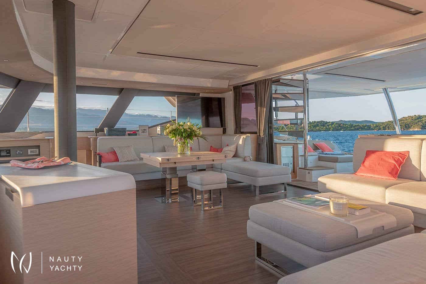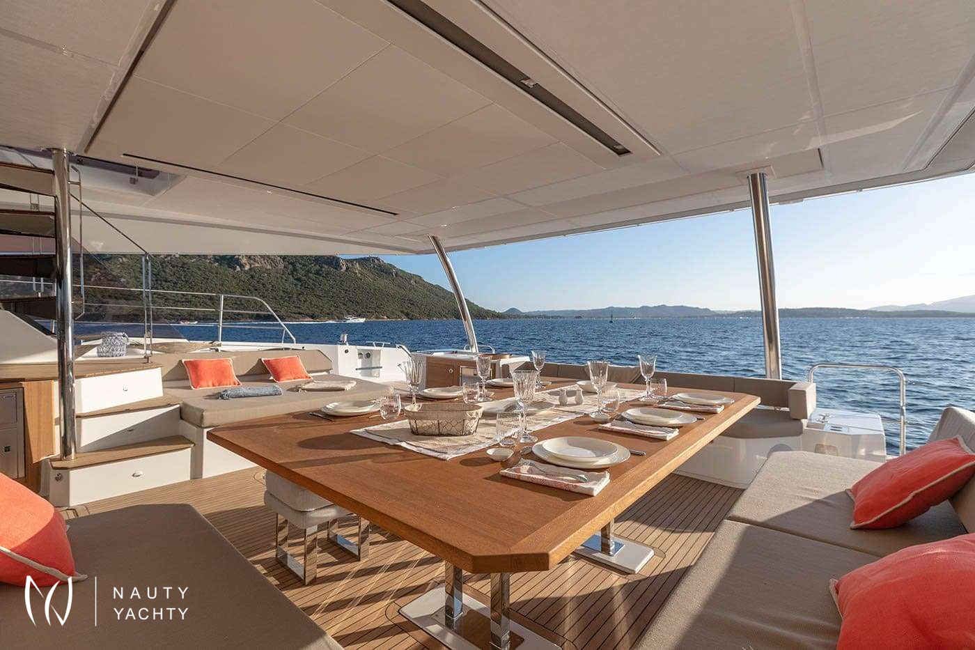 The outdoor living spaces are nothing short of spectacular. Ascend to the expansive flybridge, a true 'ocean terrace' offering panoramic Aegean views. Forward, a private cockpit beckons with a luxurious jacuzzi, the ideal spot for a sunset cocktail. Whether you're soaking up the sun on decadent loungers or enjoying an alfresco meal prepared by your private chef, KIMATA ensures every moment is one of pure bliss.