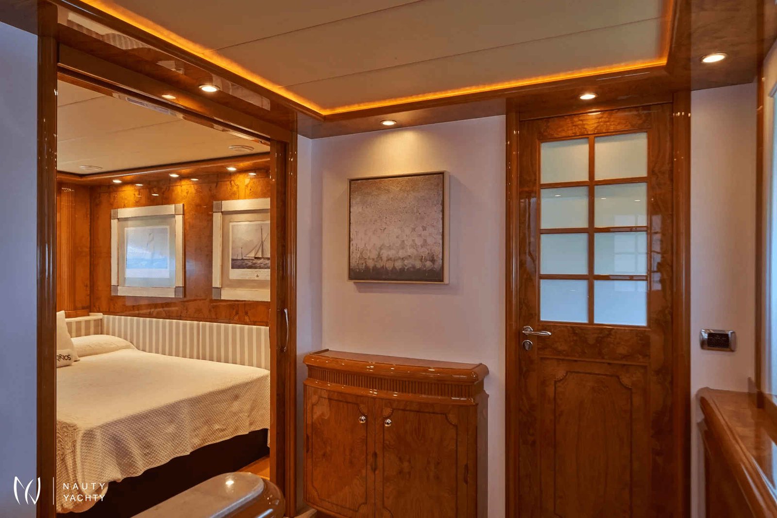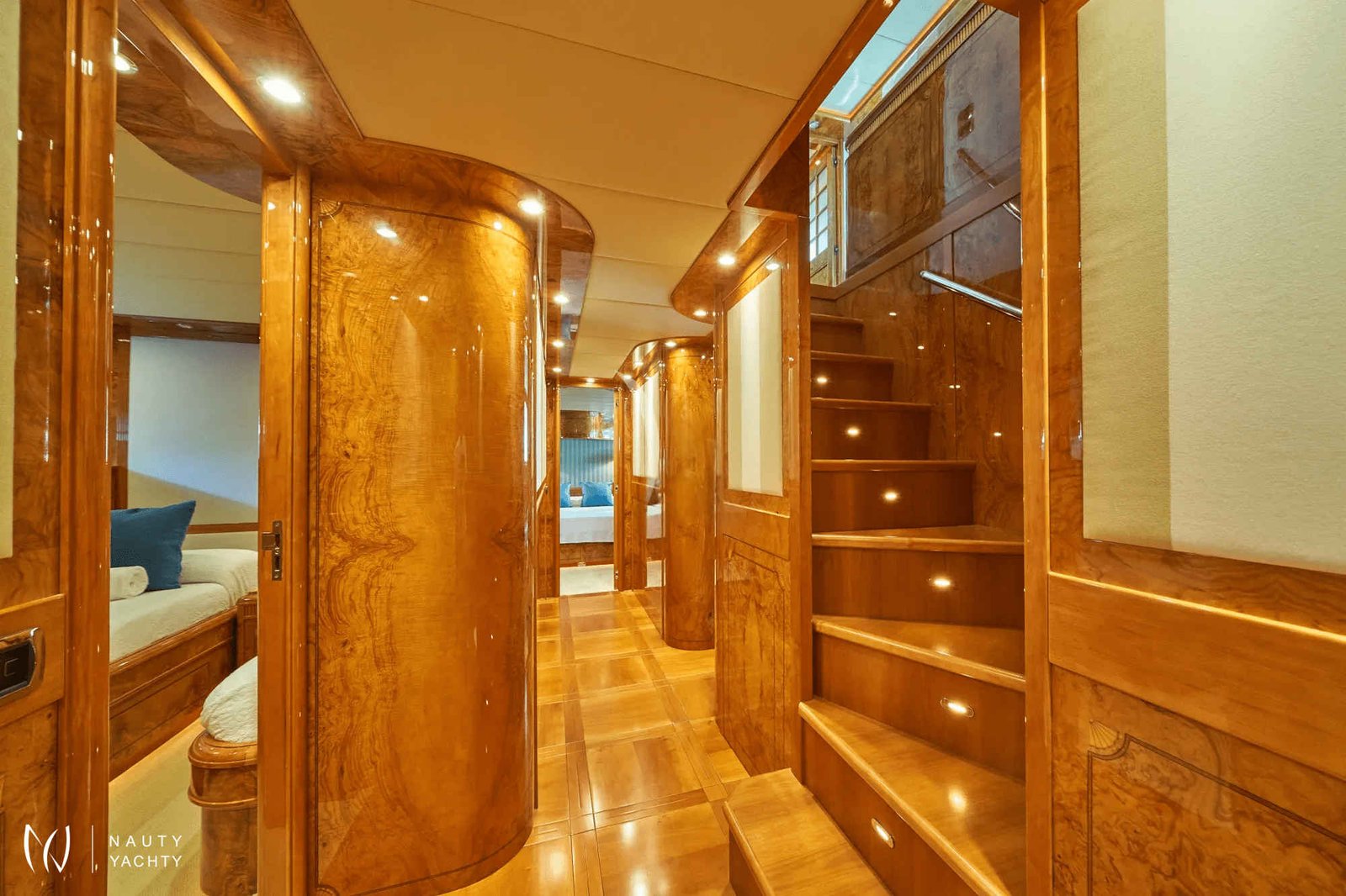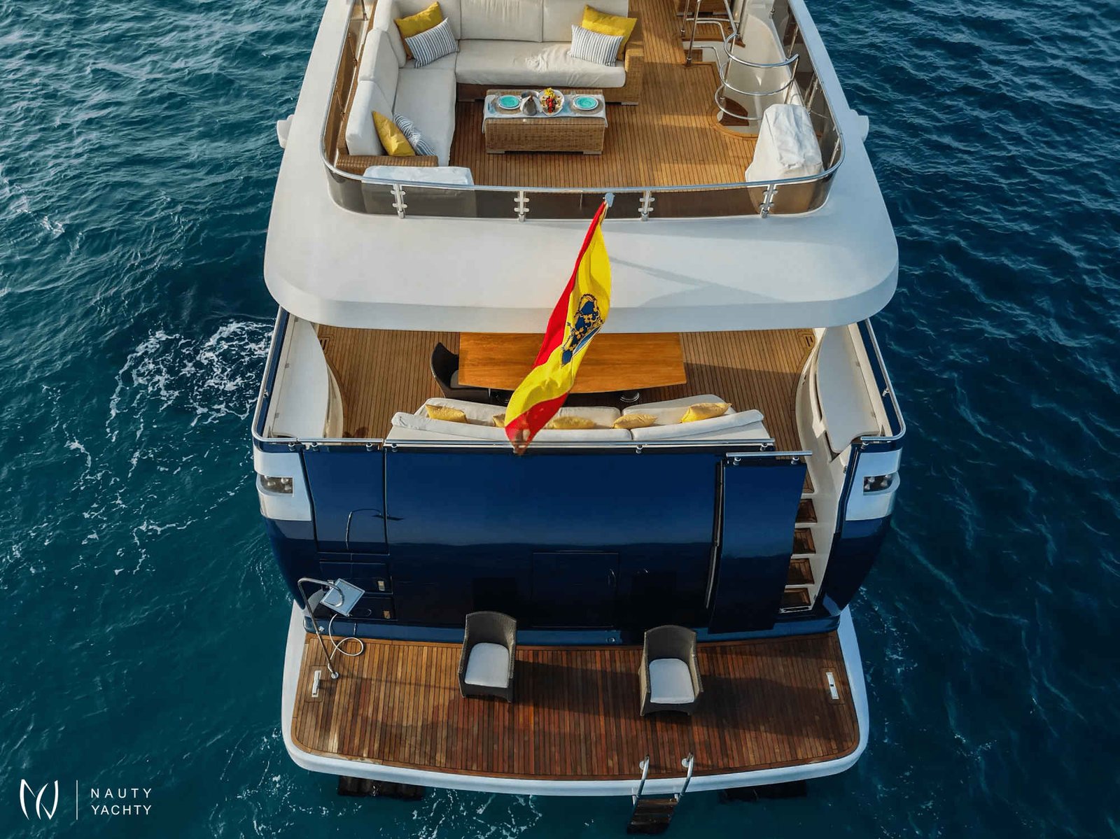 Her sophisticated interior welcomes up to 12 guests across five beautifully appointed cabins. The versatile layout features a regal master suite, a VIP cabin, and flexible twin and triple staterooms, ensuring perfect arrangements for families and groups. The main saloon is an inviting sanctuary for relaxation, complete with a state-of-the-art entertainment system and a chic bar for evening cocktails.