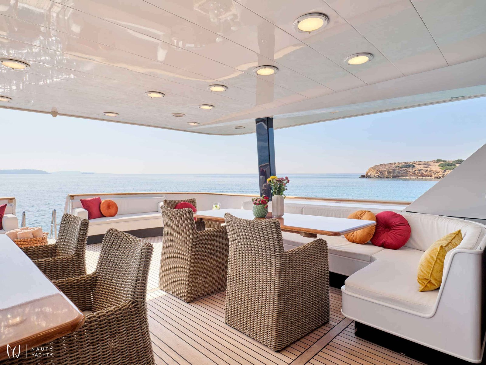 The sun-drenched decks of LADY RINA are the centerpiece of the charter experience. Unwind in the brand-new sundeck jacuzzi, toast to the Aegean sunset from the al fresco dining area, or simply relax on the plush sun loungers. With a versatile six-cabin layout, she comfortably accommodates up to 12 guests, making her the perfect choice for families and groups of friends seeking both privacy and shared moments of joy.