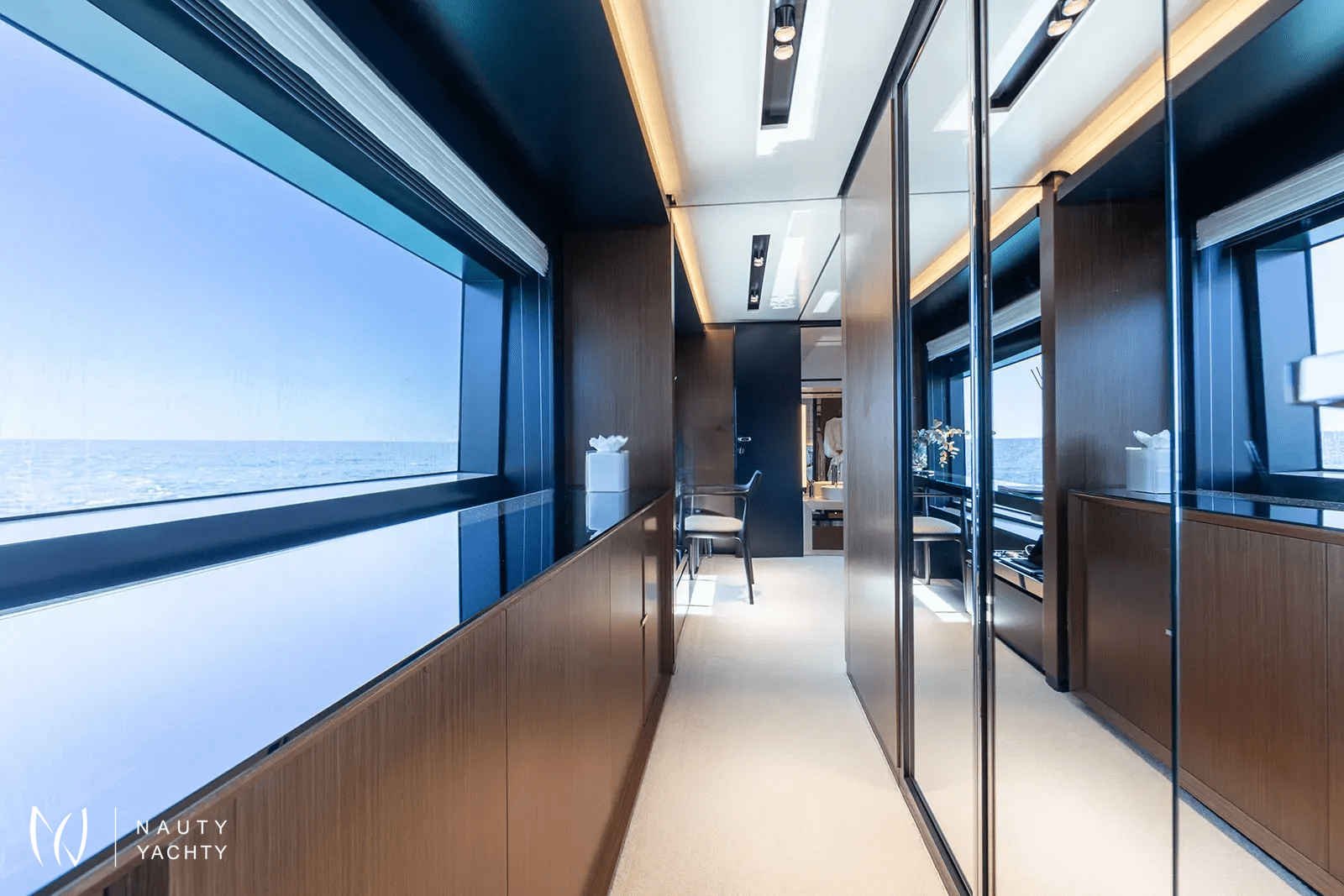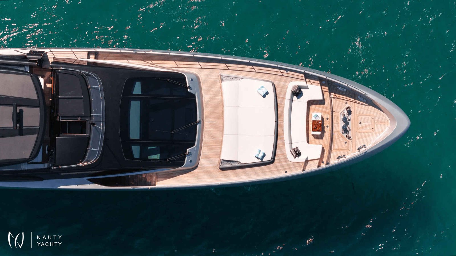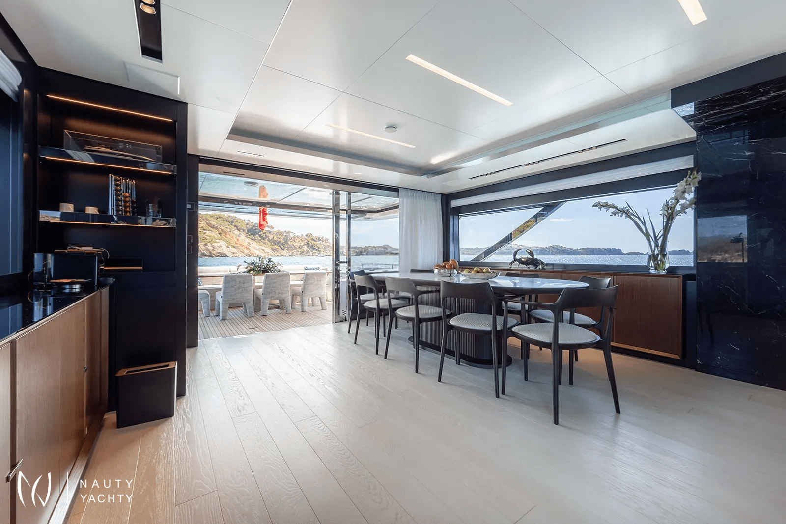 The interior of LEMON NOT LIME is a masterclass in contemporary design, offering serene and spacious living areas. A dedicated crew of five ensures every detail of your voyage is flawlessly executed, from gourmet dining to curating the perfect daily itinerary. Whether lounging on the magnificent flybridge or enjoying the privacy of your suite, this yacht is a sanctuary of refined luxury.