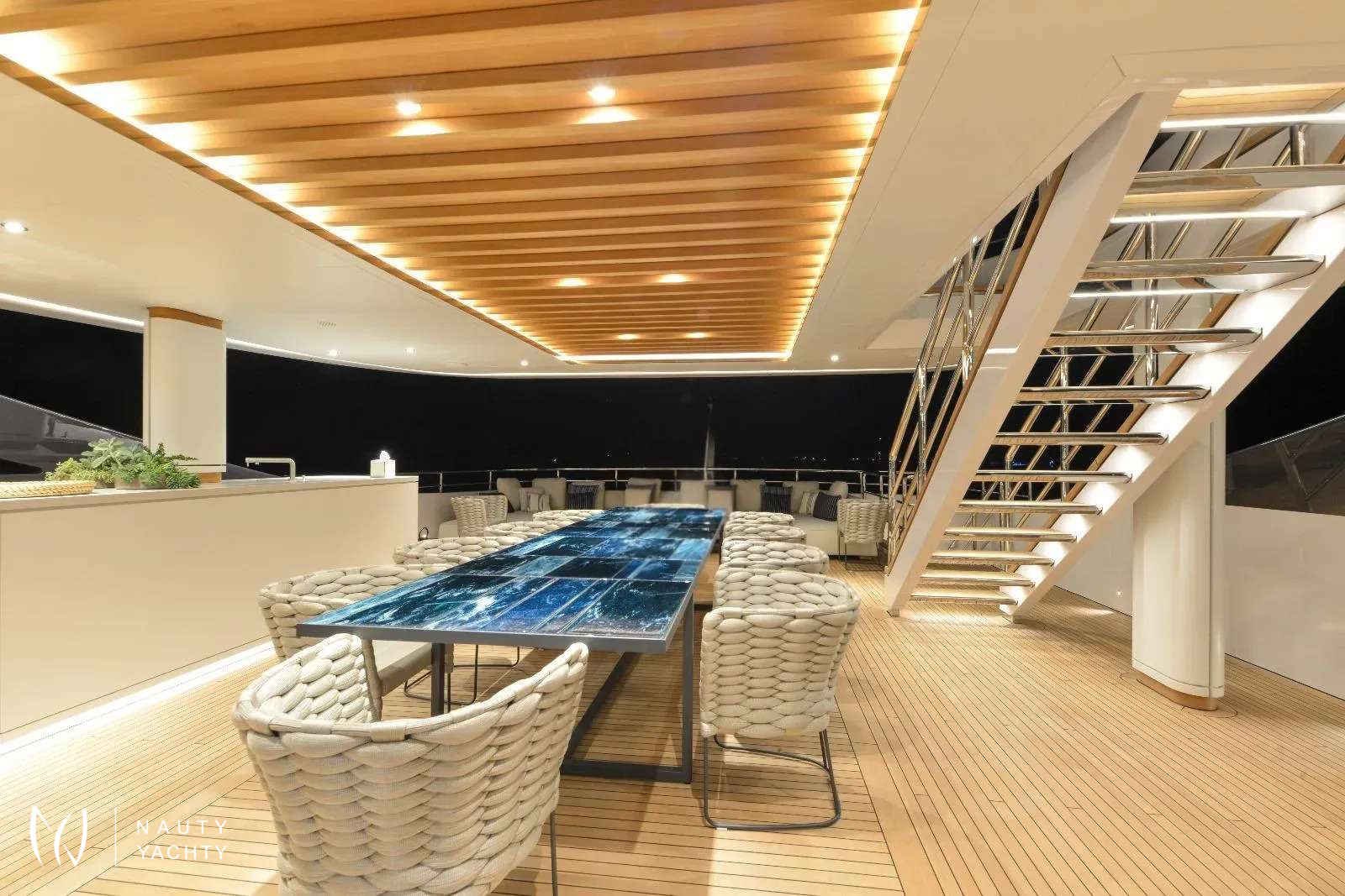 The soul of LUMIERE is her revolutionary Oasis Deck®, a sprawling beach club that unfolds over the water, creating an unparalleled private terrace on the sea. Spend your days basking in the Mediterranean sun, enjoying cocktails from the bar, or relaxing as your dedicated crew of ten caters to every desire. The journey continues across her vast decks, from the foredeck lounge to the sun deck's Jacuzzi with its panoramic views.