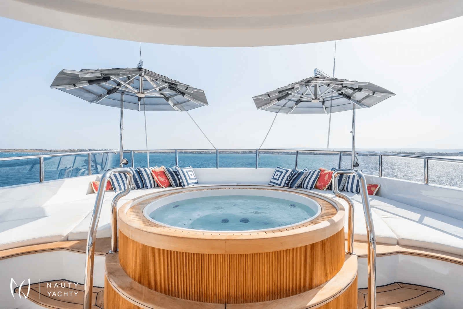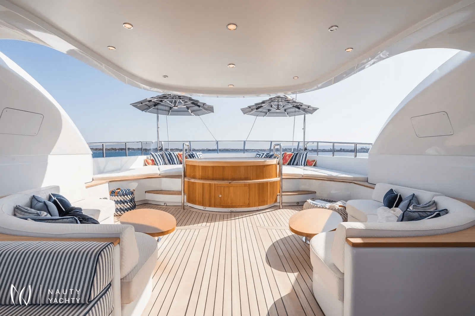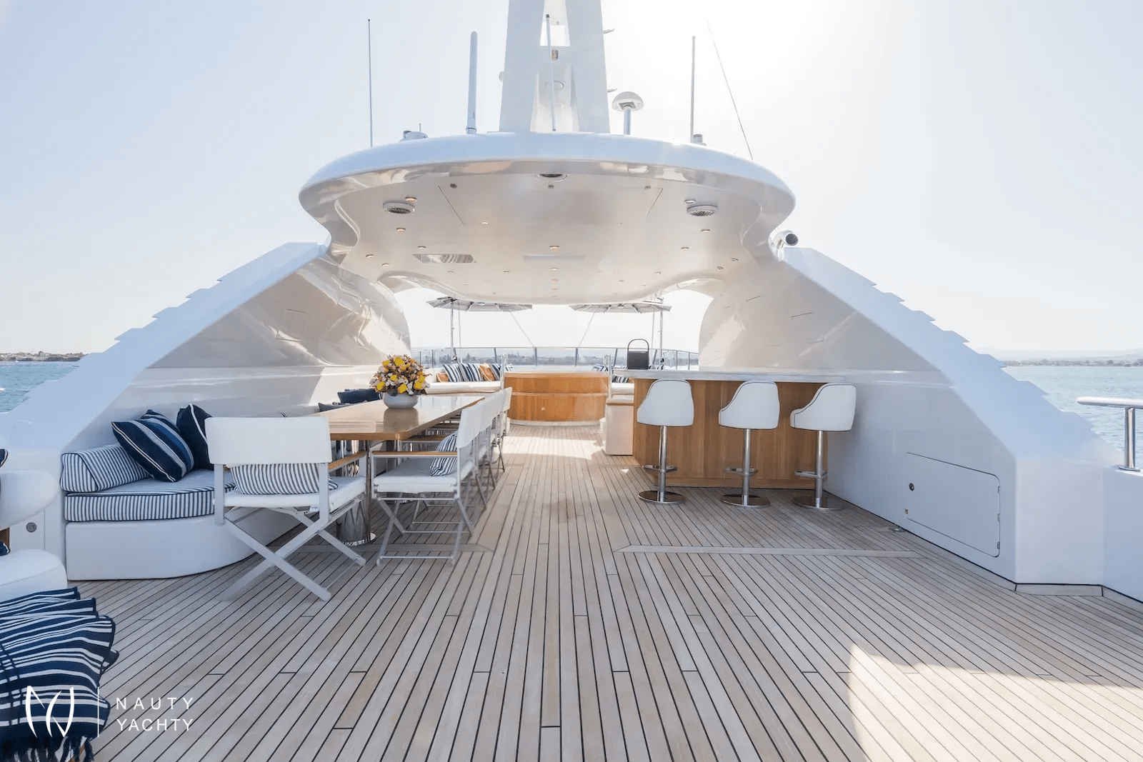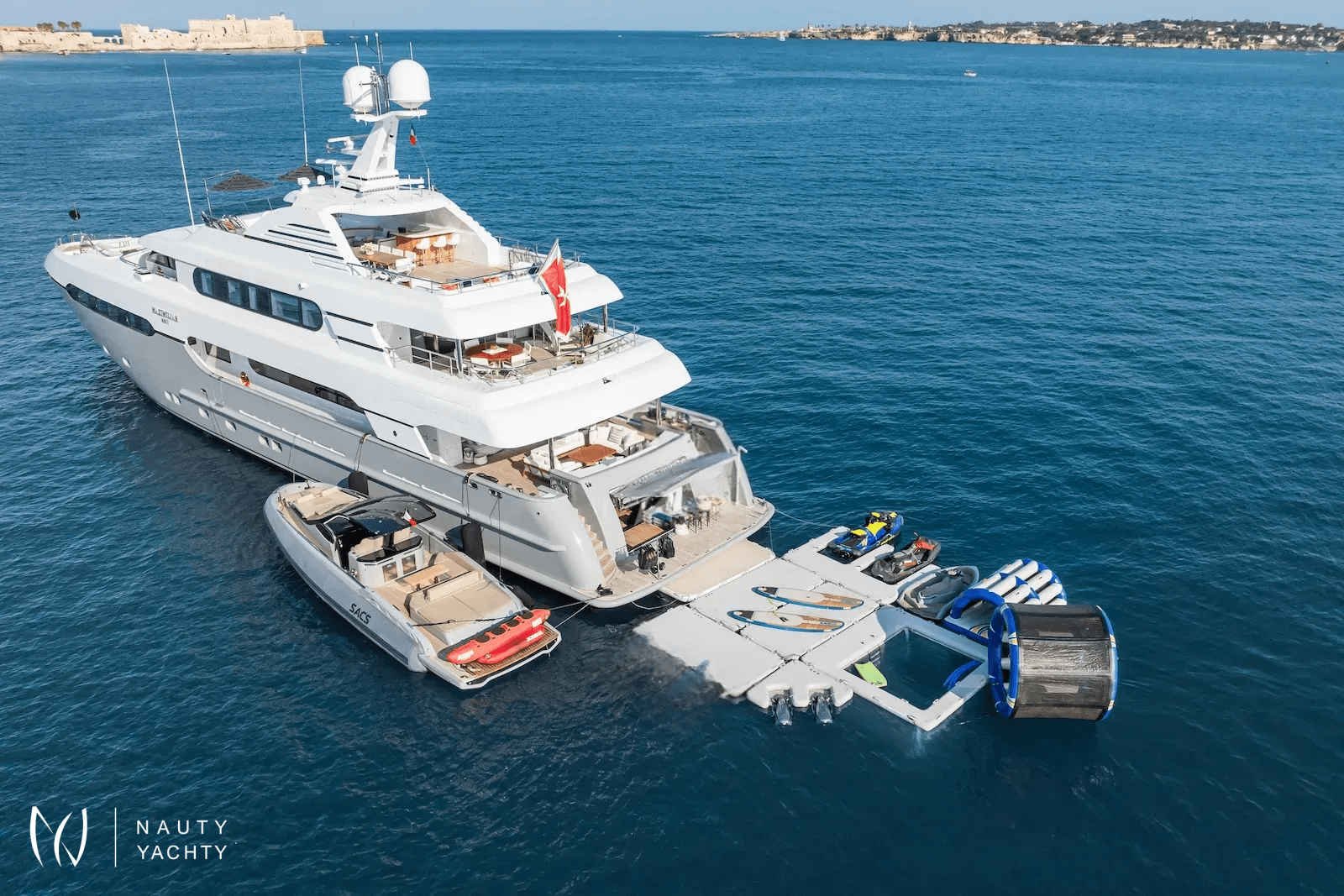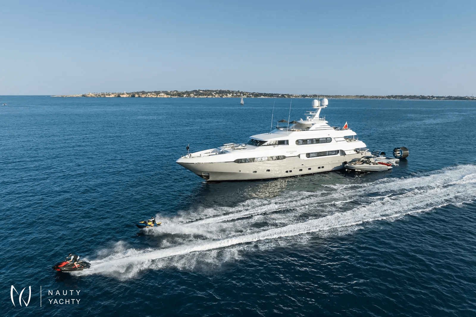Her expansive decks are an entertainer's dream, inviting you to unwind in the sundeck Jacuzzi or dive into thrilling adventures with an incredible array of water toys. The chic interior by Franck Darnet accommodates 12 guests in five lavish staterooms, highlighted by a breathtaking full-beam master suite with a private annex.