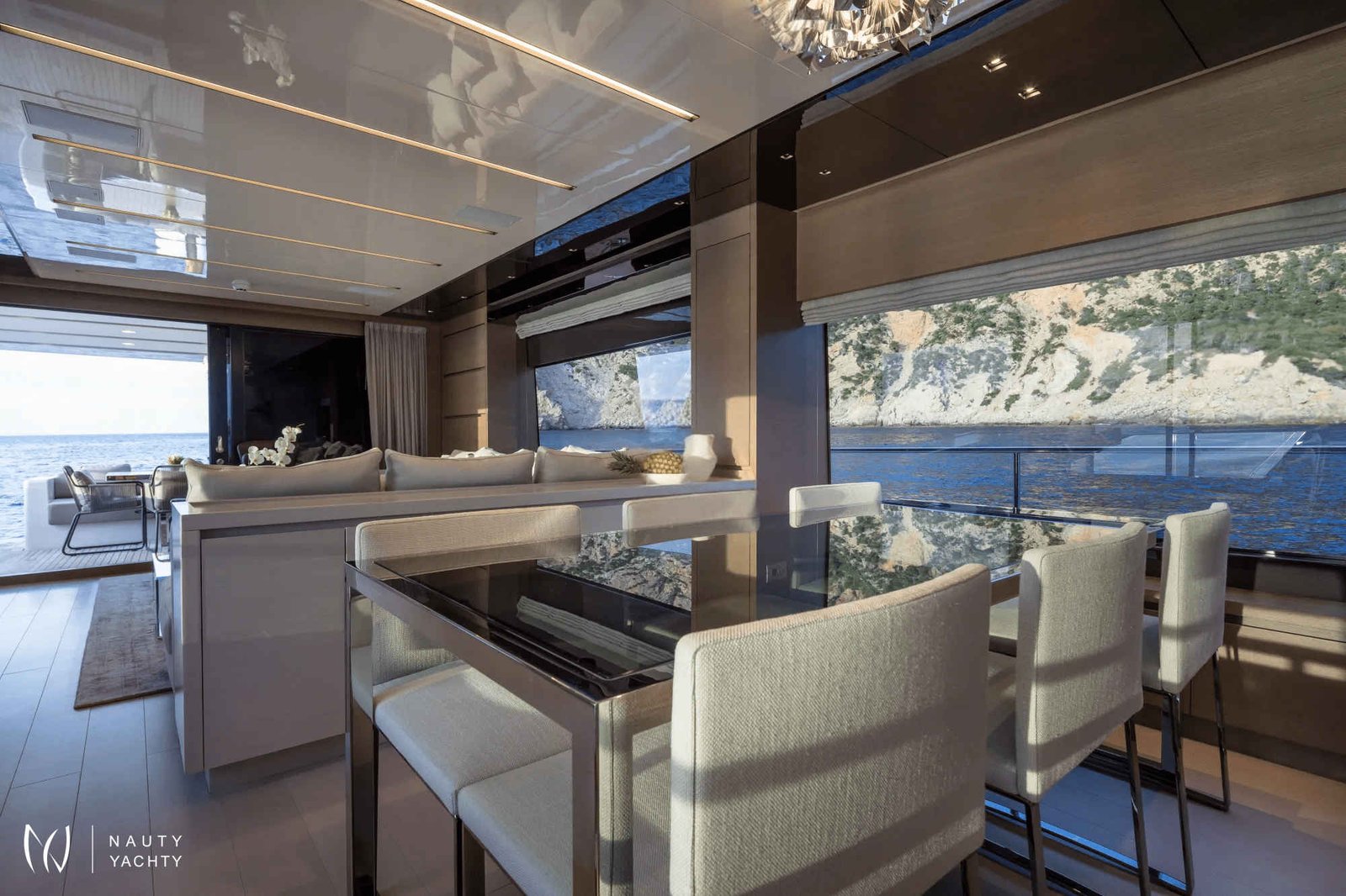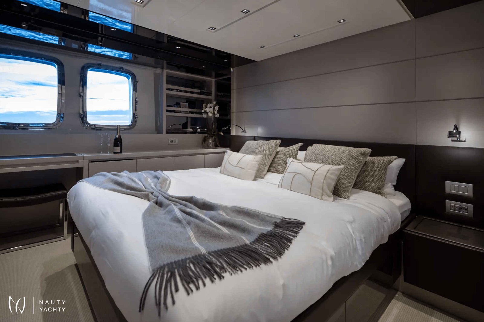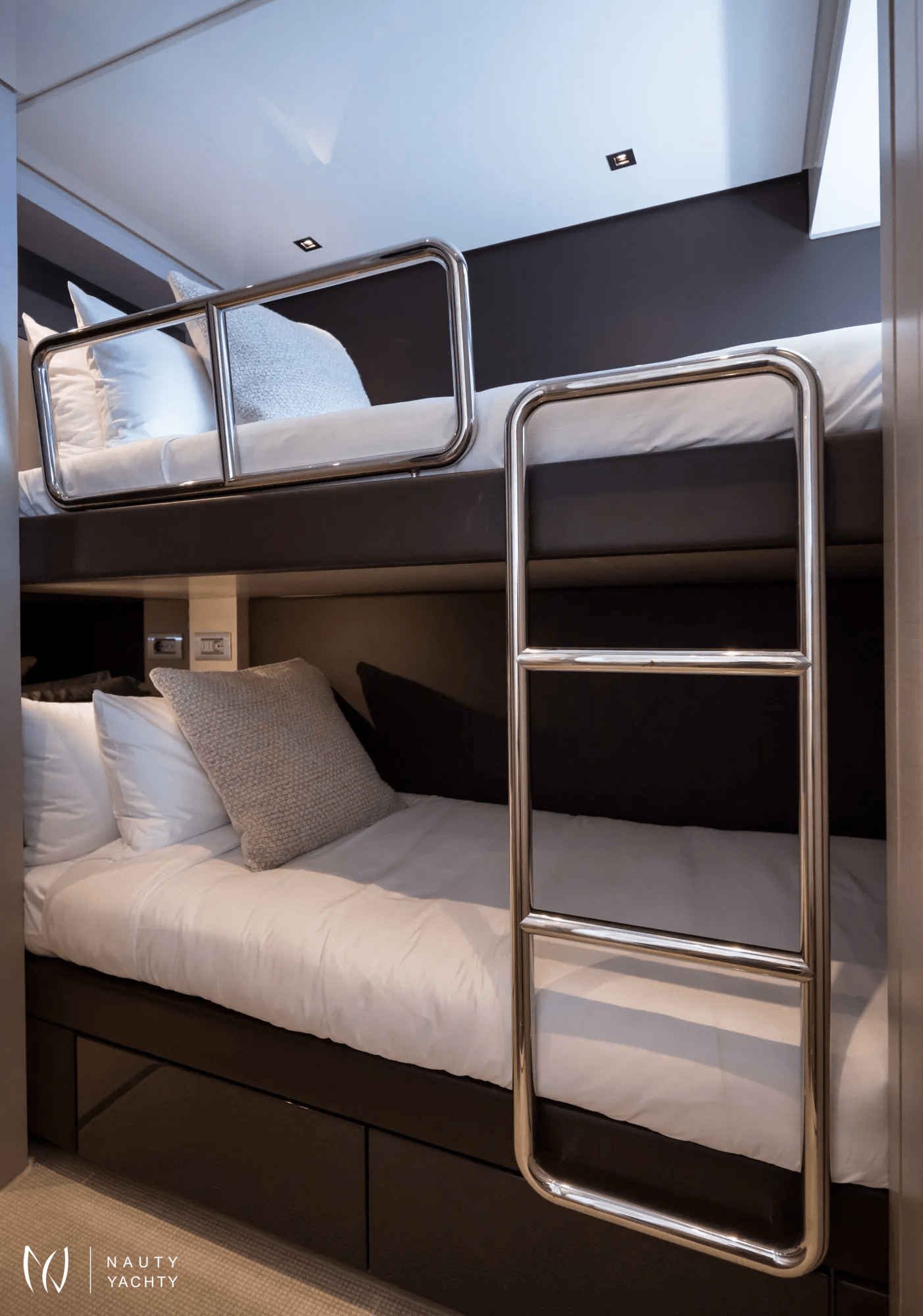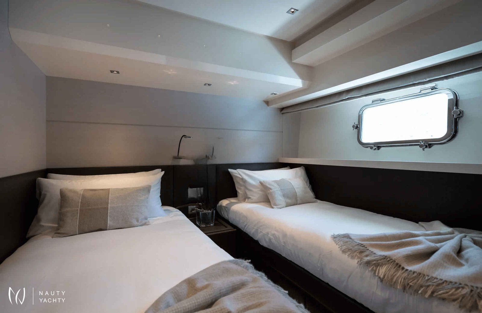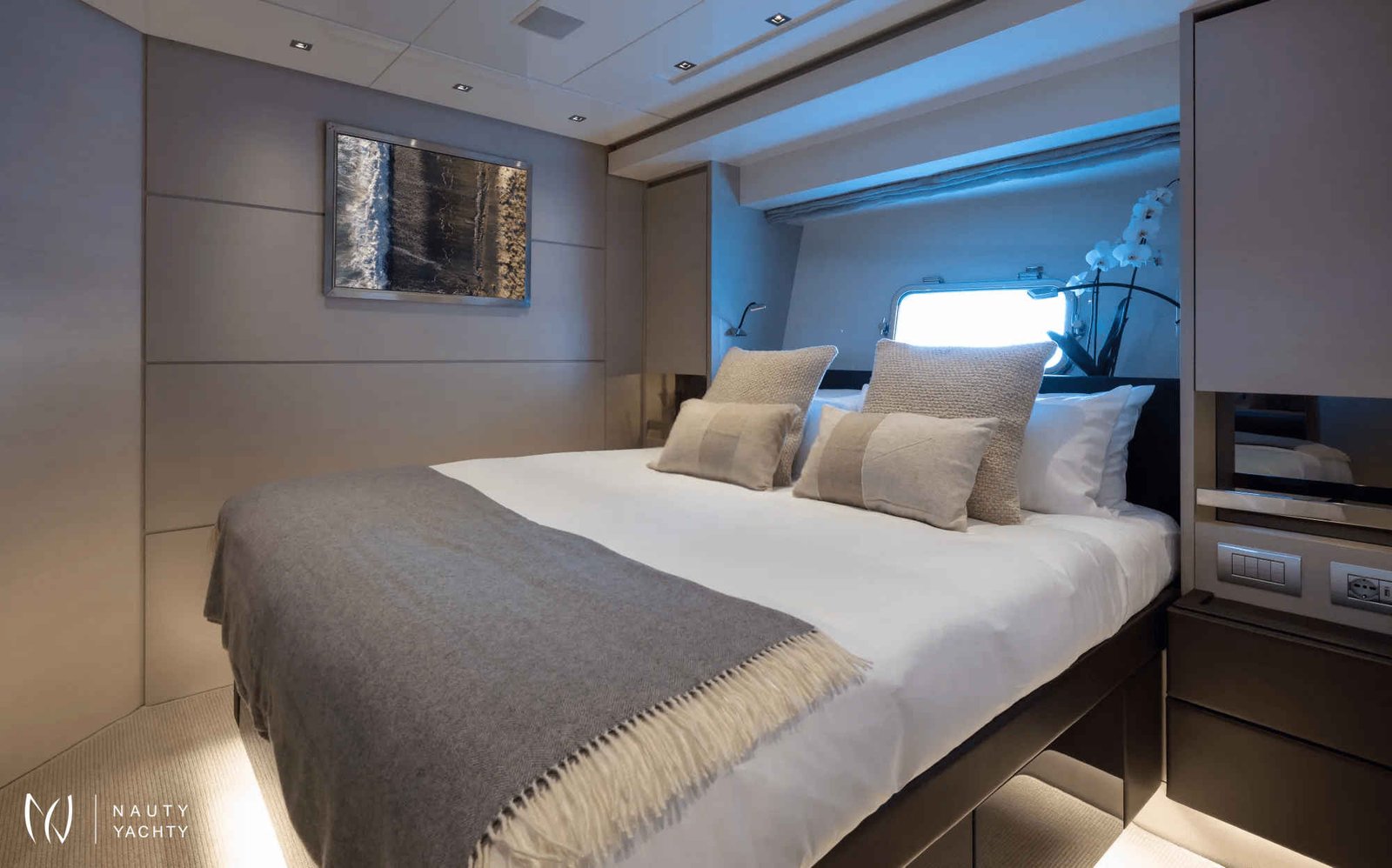 The name MOONSHOT perfectly captures the ambitious spirit of this vessel. With an exhilarating cruising speed of 25 knots, you can effortlessly glide between destinations, maximizing your time spent enjoying the azure waters. Her elegant interiors feature four exquisitely designed cabins, offering serene and flexible accommodation for up to 12 guests. Your dedicated crew of three will attend to every detail, ensuring a seamless and indulgent charter experience from start to finish.