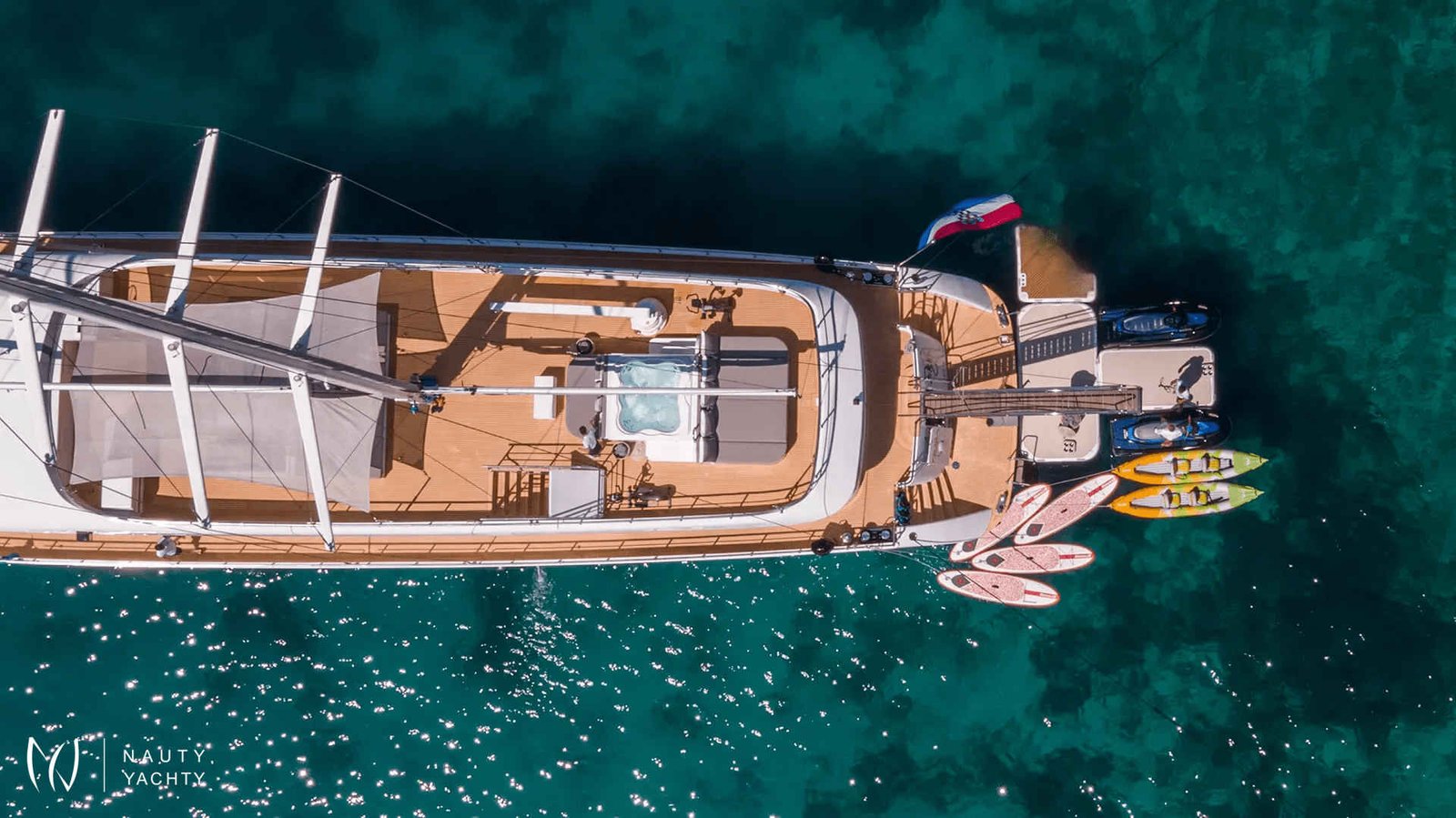 Your charter experience is elevated by an exceptional crew of eight and an incredible array of amenities. Ascend to the breathtaking 120m² flybridge, a social hub complete with a Jacuzzi, plush sunpads, and panoramic views. The journey is further enhanced by: