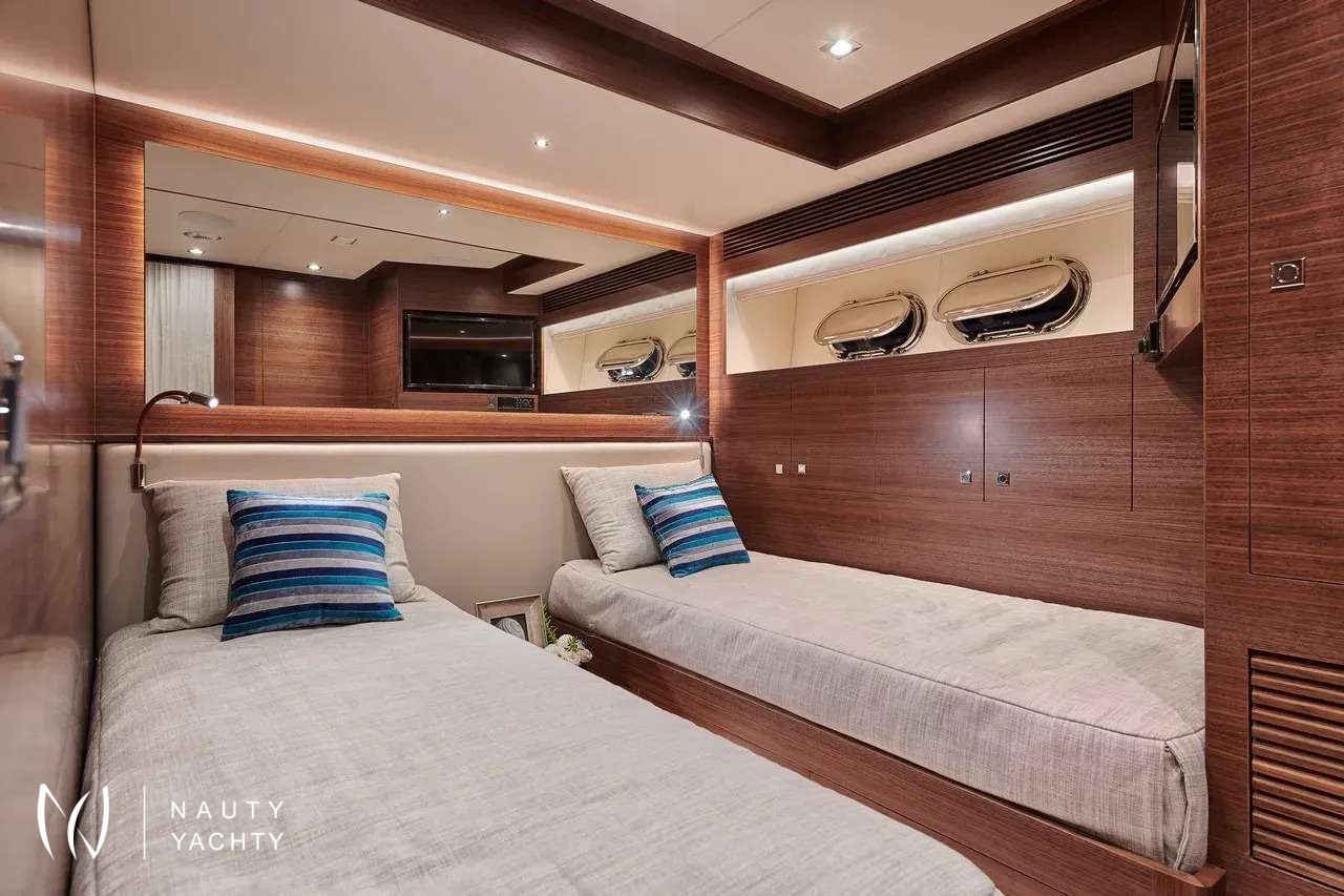 Her expansive deck spaces are an invitation to indulge in the Mediterranean lifestyle, whether you are soaking up the sun on the sundeck or enjoying a gourmet meal prepared by your private chef. Inside, the atmosphere is one of refined luxury. Her intelligent layout provides a seamless flow between the salon and outdoor areas, while a dedicated crew of four ensures every detail of your charter is flawlessly executed.