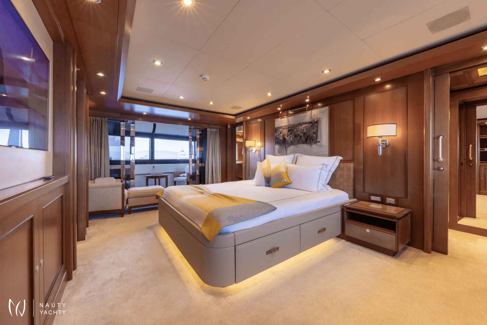 Her opulent interior features rich Canaletto walnut, Loro Piana fabrics, and bespoke details that create an atmosphere of quiet sophistication. Accommodating up to 12 guests, O'LION offers versatile spaces for relaxation, from the formal dining area to the panoramic sky lounge with its unique fireplace.