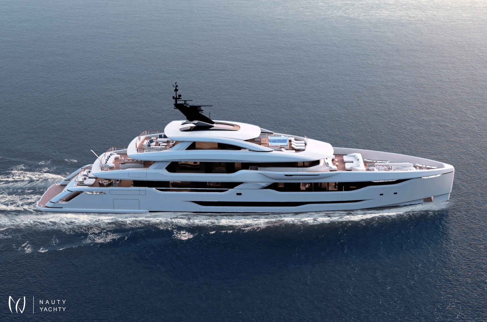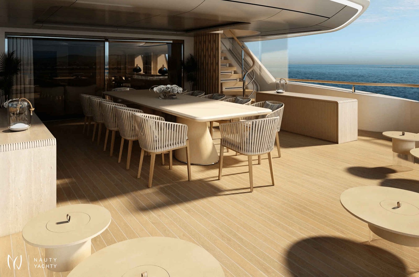 With 7 opulent staterooms, the interiors blend Nordic and Mediterranean influences, incorporating light oak, bright tones, and soft, sculptural custom furniture that maintain a relaxing, domestic feel