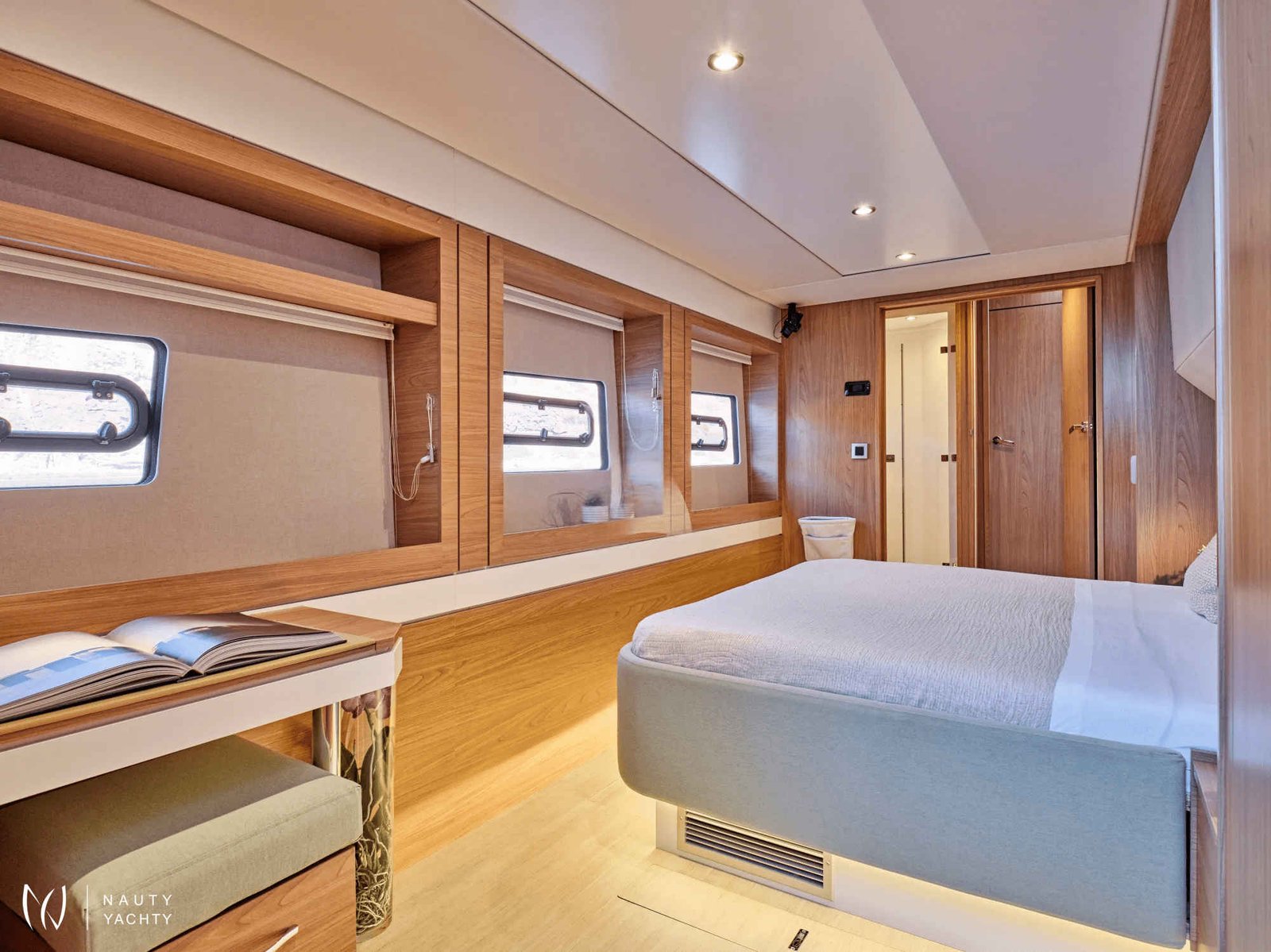 Your bespoke journey is curated by a professional crew of three, dedicated to providing intuitive, five-star service. Onboard, eight guests are accommodated in supreme comfort across four beautifully appointed cabins, featuring three serene queen staterooms and one versatile twin cabin. Whether dining al fresco under the stars or lounging on the spacious flybridge, every moment aboard the charter yacht SAHANA is crafted for unforgettable memories.