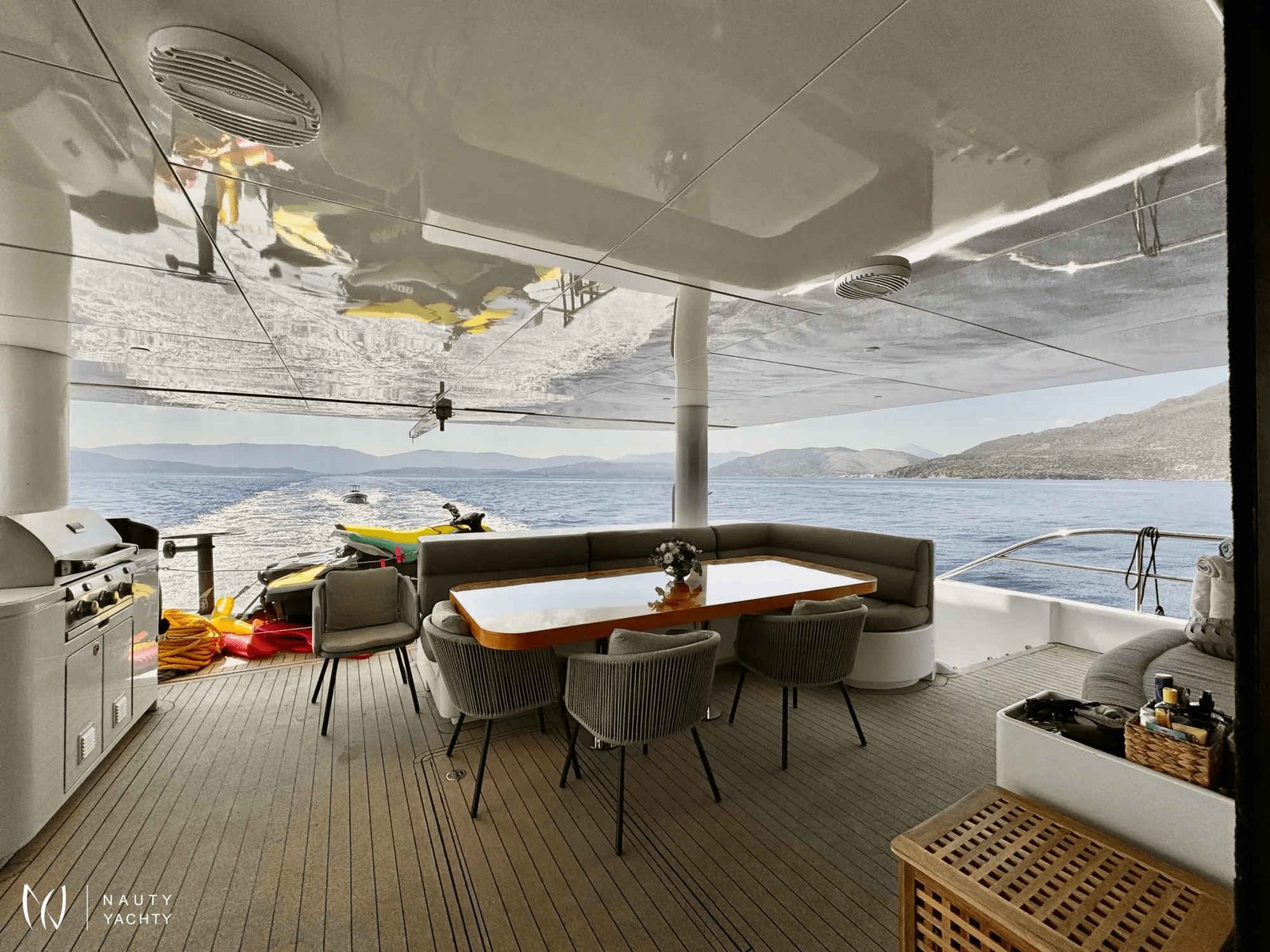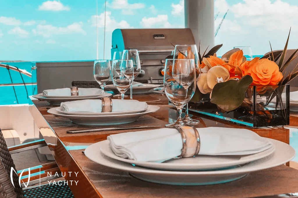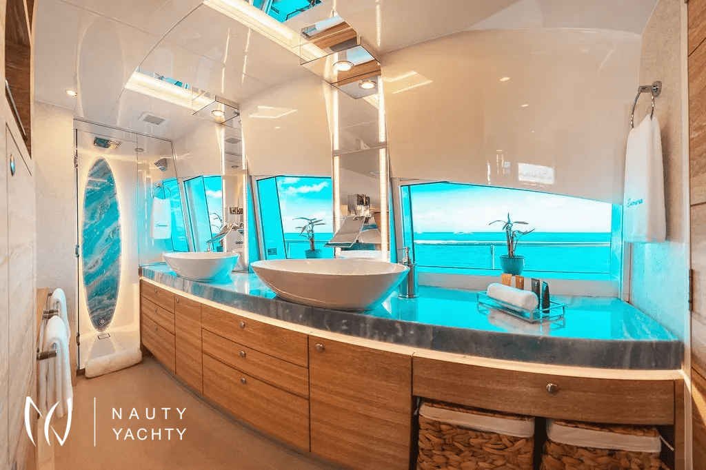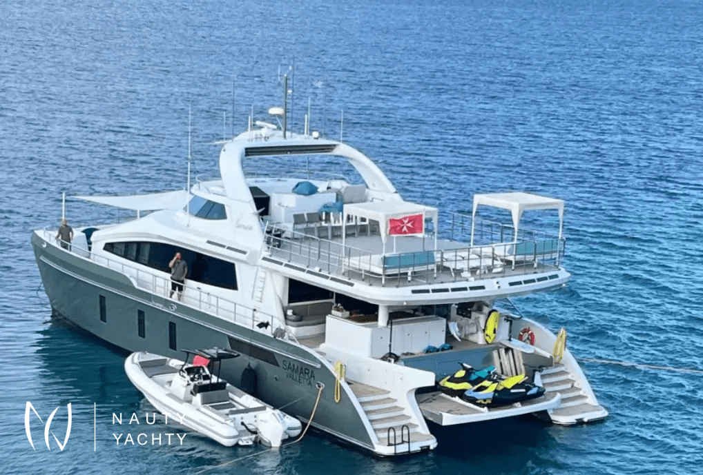 A rare find of luxury yacht combined with sporty/ adventurous qualities which stands out head and shoulders above other monohull and catamaran hull yachts of this size. From bow to stern, guests cannot truly imagine the comfort, quality and spaciousness of SAMARA until stepping aboard. Named after the "winged seed of the Sycamore tree", this yacht was built to glide effortlessly, efficiently and steadily over long distances, in shallow waters thanks to a minimum draft. Packed with innovative features such as solar power technology and cork decks while also catering to the most adventurous or laid back cruisers, every type of guest will appreciate what this yacht has to offer. The volume is remarkable with 4000 square feet aboard – beyond that of larger monohulls and attributed to her 31’ beam versus the typical 20’.Stepping aboard the AFT DECK, there is an extra large al fresco dining area, well sheltered (plus eisinglass enclosure optional) alongside a full barbeque grill to starboard. Enjoy a cocktail or coffee at the full bar to starboard side or just appreciate the view. Entering the MAIN SALON brings everything to life with open plan galley and bar stools to starboard and the welcoming lounge area to port. Concealed overhead is the 55" TV transforming this area for movie night or morning news while at the galley bar. There is easy access to a bayhead on this level just forward of the lounge as well. Make your way amidship forward into a cozy sunken, second lounge situated a few steps down from the main salon. A romantic fire place feature here on a blustery evening makes this lounge very inviting.A true sanctuary on the main deck is the forward facing MASTER suite with open plan from port to starboard bringing in the gorgeous views and natural light of outdoors, inside as well. To port is the ensuite Master bathroom with double sinks featuring designer waterfall taps, private toilet and stall shower. To starboard is a walk-in wardrobe with drawers and hanging closet. Storage is ample throughout. A private glass door leads forward onto the Jacuzzi deck serving as a full Owner's deck and offers privacy with the subtle wrap around of superstructure design on both sides. Large petal-shaped loungers invited guests to relax in the sun or curl up and read a book in privacy.Forward below deck in the port and starboard hulls guests will find the comfort of two Queen staterooms, each en suite with spacious showers, toilet and ample storage in two closets and cabinetry. Aft in the starboard hull 2-3 more guests can find accommodation in a double bed with pullman bunk, also with en suite facilities.Moving up to the SUN DECK during the day is akin to stepping into a private garden in an exclusive villa. Two custom cabanas easily offer comfort to 3 adults each with shade as desired overhead and around. If more sun is preferred, two chaise and two comfortable bean bags can be positioned where guests wish. A ‘jump seat’ sunpad situated in front of the helm on this level also provides the best view from above. The grassy texture covering this deck is soothing and non-slip underfoot while also giving an ‘island’ feel. As the moon rises, this deck transforms to a whole new experience of its own. Whether experiencing movie night with the oversized cinema in position or an elegant dinner under the stars, this is the most favored space aboard by most.Not to forget the area where the most action occurs, the SWIM PLATFORM. A hydraulic center stage secures the wave runners when under way and once lowered, this level is the easy access deck for a variety of water activities, water toys, boarding the tender, and swim entry. Transform this area with chairs and inflatable cushions for the perfect BEACH CLUB. Each hull also offers a set of steps and a swim ladder for water access.