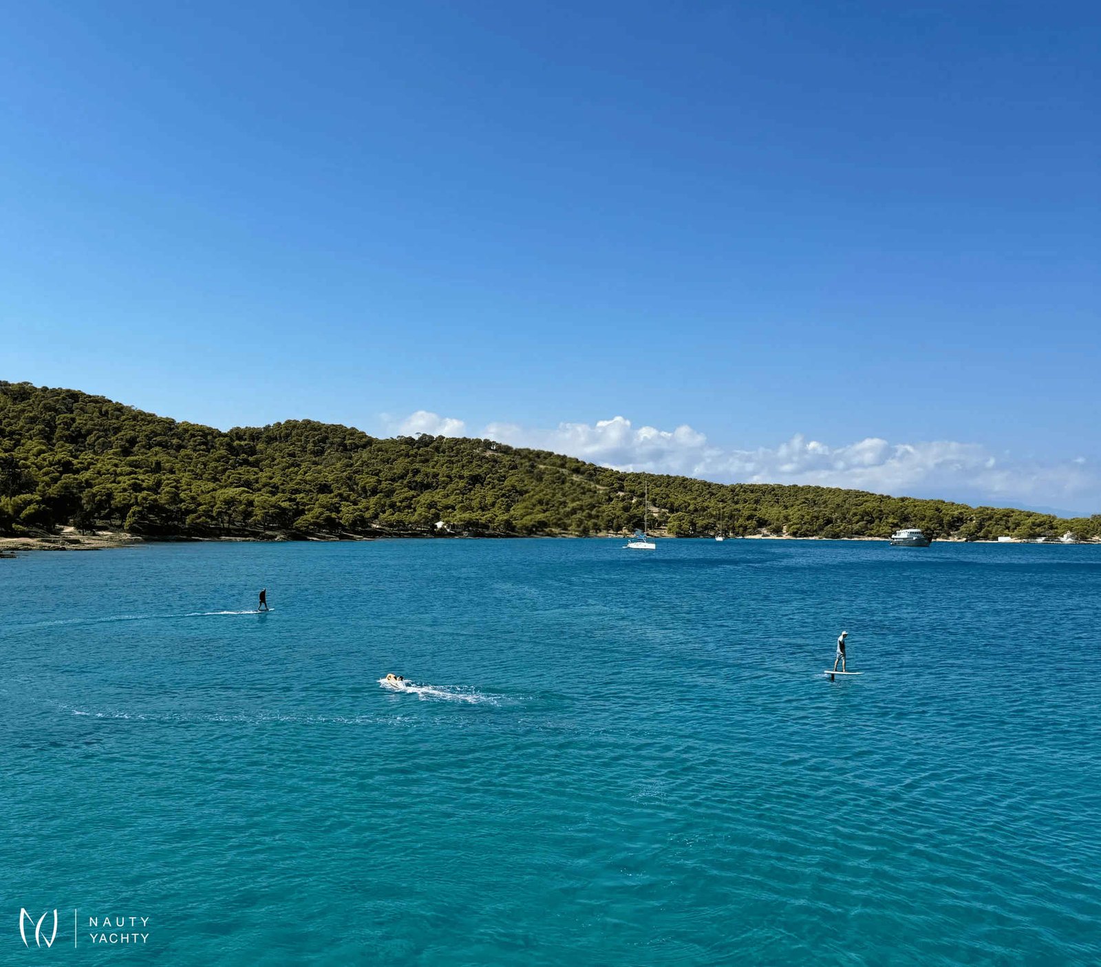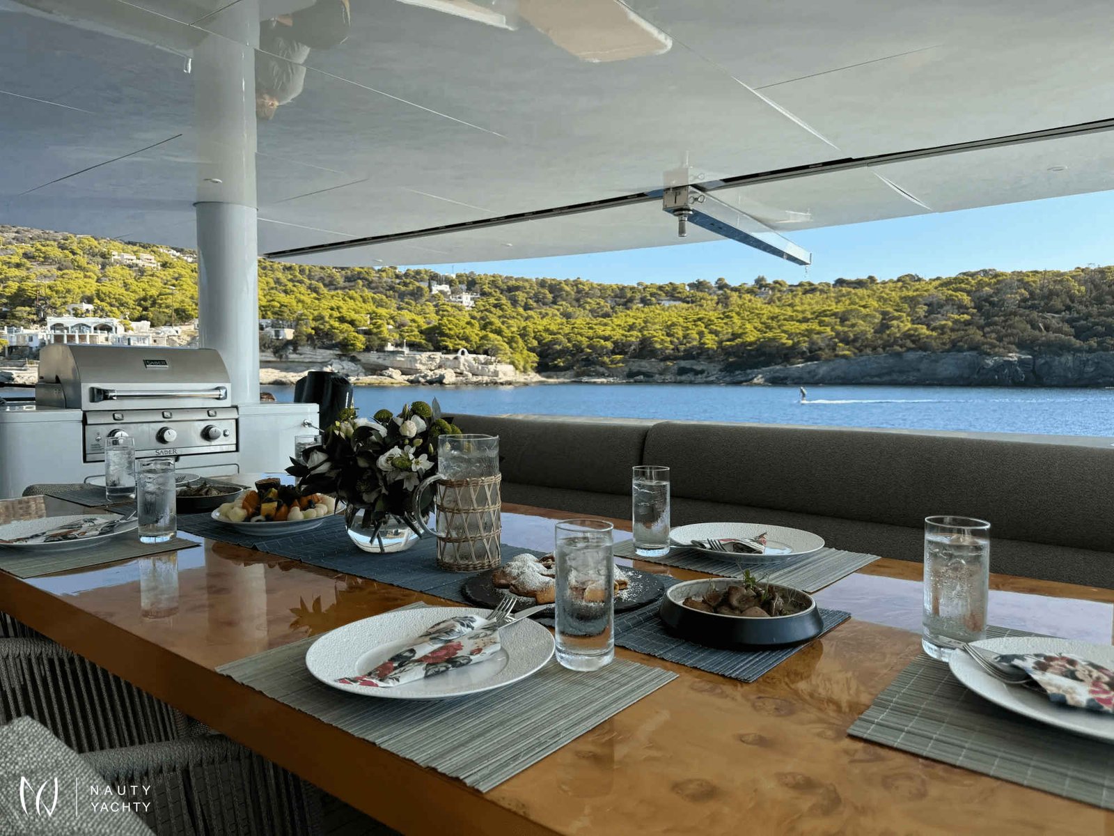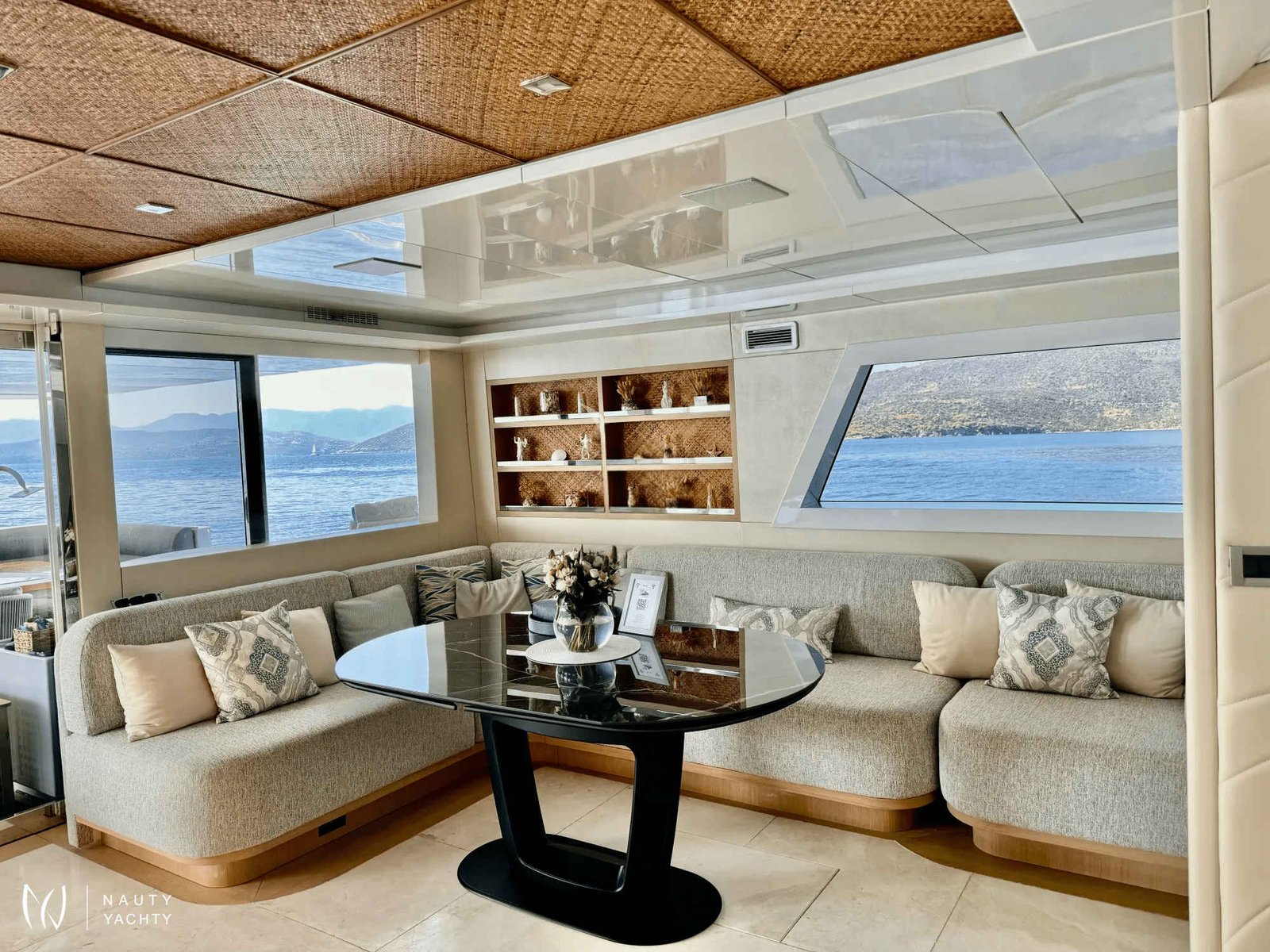 A rare find of luxury yacht combined with sporty/ adventurous qualities which stands out head and shoulders above other monohull and catamaran hull yachts of this size. From bow to stern, guests cannot truly imagine the comfort, quality and spaciousness of SAMARA until stepping aboard. Named after the "winged seed of the Sycamore tree", this yacht was built to glide effortlessly, efficiently and steadily over long distances, in shallow waters thanks to a minimum draft. Packed with innovative features such as solar power technology and cork decks while also catering to the most adventurous or laid back cruisers, every type of guest will appreciate what this yacht has to offer. The volume is remarkable with 4000 square feet aboard – beyond that of larger monohulls and attributed to her 31’ beam versus the typical 20’.Stepping aboard the AFT DECK, there is an extra large al fresco dining area, well sheltered (plus eisinglass enclosure optional) alongside a full barbeque grill to starboard. Enjoy a cocktail or coffee at the full bar to starboard side or just appreciate the view. Entering the MAIN SALON brings everything to life with open plan galley and bar stools to starboard and the welcoming lounge area to port. Concealed overhead is the 55" TV transforming this area for movie night or morning news while at the galley bar. There is easy access to a bayhead on this level just forward of the lounge as well. Make your way amidship forward into a cozy sunken, second lounge situated a few steps down from the main salon. A romantic fire place feature here on a blustery evening makes this lounge very inviting.A true sanctuary on the main deck is the forward facing MASTER suite with open plan from port to starboard bringing in the gorgeous views and natural light of outdoors, inside as well. To port is the ensuite Master bathroom with double sinks featuring designer waterfall taps, private toilet and stall shower. To starboard is a walk-in wardrobe with drawers and hanging closet. Storage is ample throughout. A private glass door leads forward onto the Jacuzzi deck serving as a full Owner's deck and offers privacy with the subtle wrap around of superstructure design on both sides. Large petal-shaped loungers invited guests to relax in the sun or curl up and read a book in privacy.Forward below deck in the port and starboard hulls guests will find the comfort of two Queen staterooms, each en suite with spacious showers, toilet and ample storage in two closets and cabinetry. Aft in the starboard hull 2-3 more guests can find accommodation in a double bed with pullman bunk, also with en suite facilities.Moving up to the SUN DECK during the day is akin to stepping into a private garden in an exclusive villa. Two custom cabanas easily offer comfort to 3 adults each with shade as desired overhead and around. If more sun is preferred, two chaise and two comfortable bean bags can be positioned where guests wish. A ‘jump seat’ sunpad situated in front of the helm on this level also provides the best view from above. The grassy texture covering this deck is soothing and non-slip underfoot while also giving an ‘island’ feel. As the moon rises, this deck transforms to a whole new experience of its own. Whether experiencing movie night with the oversized cinema in position or an elegant dinner under the stars, this is the most favored space aboard by most.Not to forget the area where the most action occurs, the SWIM PLATFORM. A hydraulic center stage secures the wave runners when under way and once lowered, this level is the easy access deck for a variety of water activities, water toys, boarding the tender, and swim entry. Transform this area with chairs and inflatable cushions for the perfect BEACH CLUB. Each hull also offers a set of steps and a swim ladder for water access.