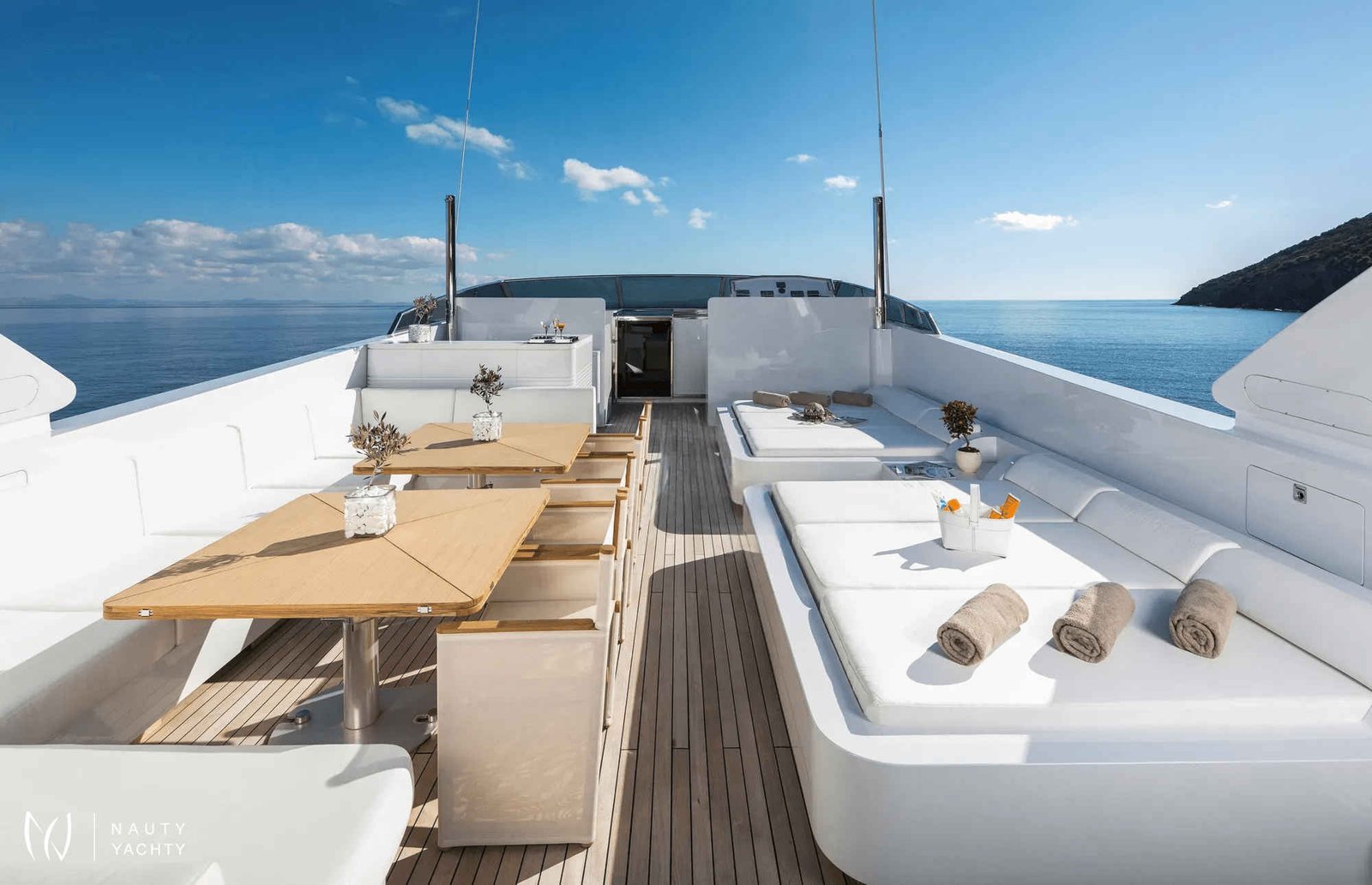 Her sophisticated interior and expansive deck spaces are designed for relaxation and elegant entertaining. Accommodating up to 12 guests across six beautifully appointed staterooms, she provides a private and indulgent retreat. With a dedicated crew of seven ensuring flawless service, every moment of your charter is curated to perfection.