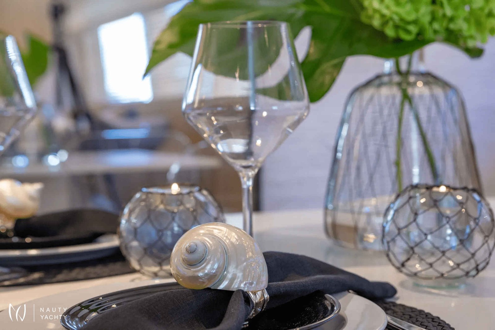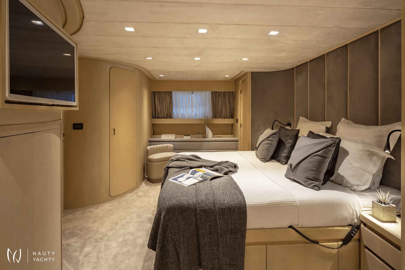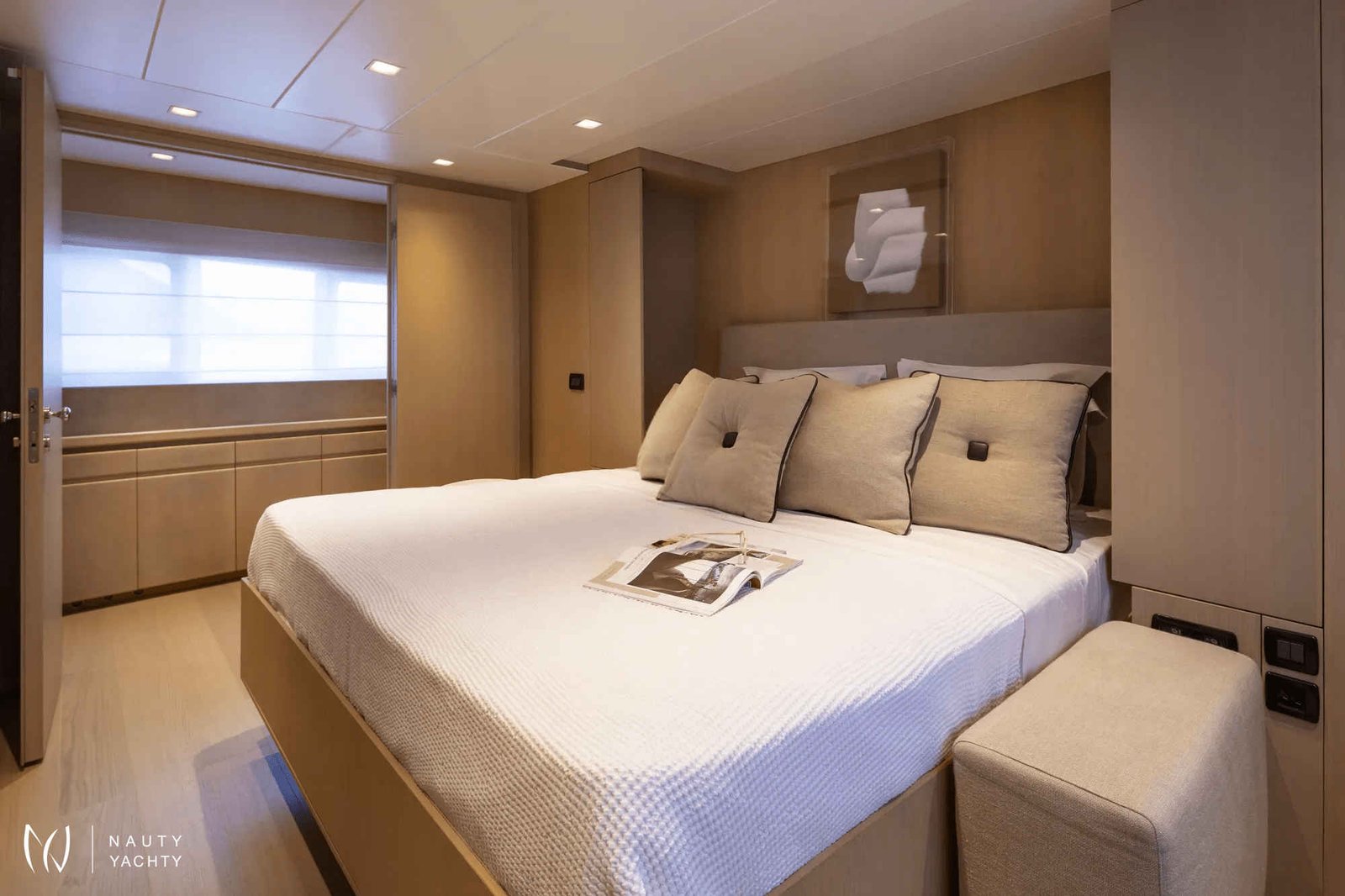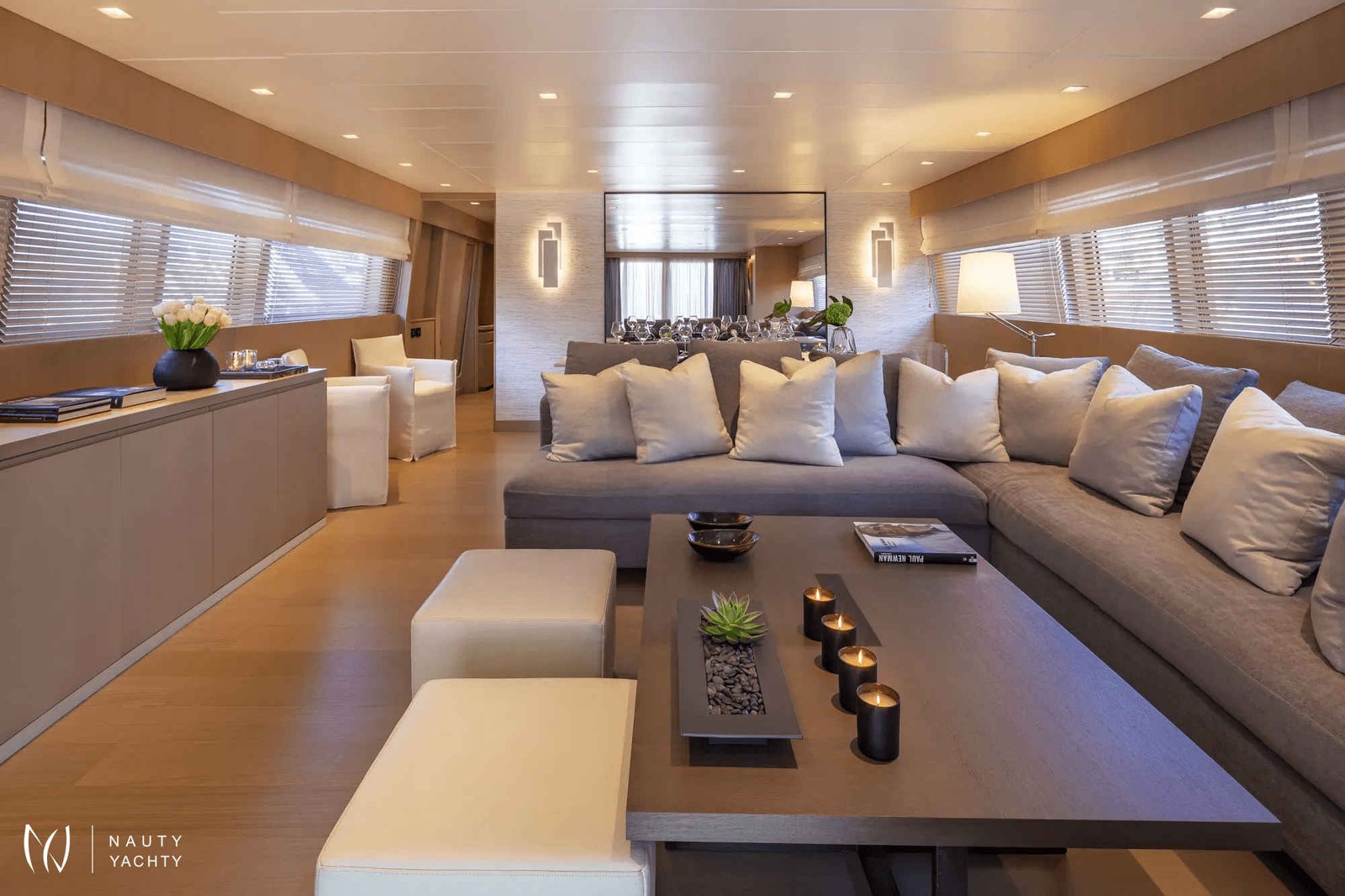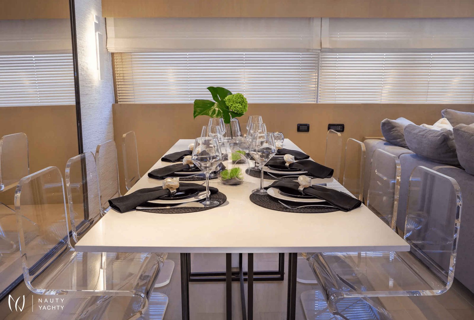 Her elegant interiors create a serene backdrop for your island-hopping journey, while her impressive cruising speed of 23 knots ensures you can effortlessly glide between iconic destinations and secluded coves. The dedicated crew of seven is committed to crafting a bespoke and unforgettable charter experience.