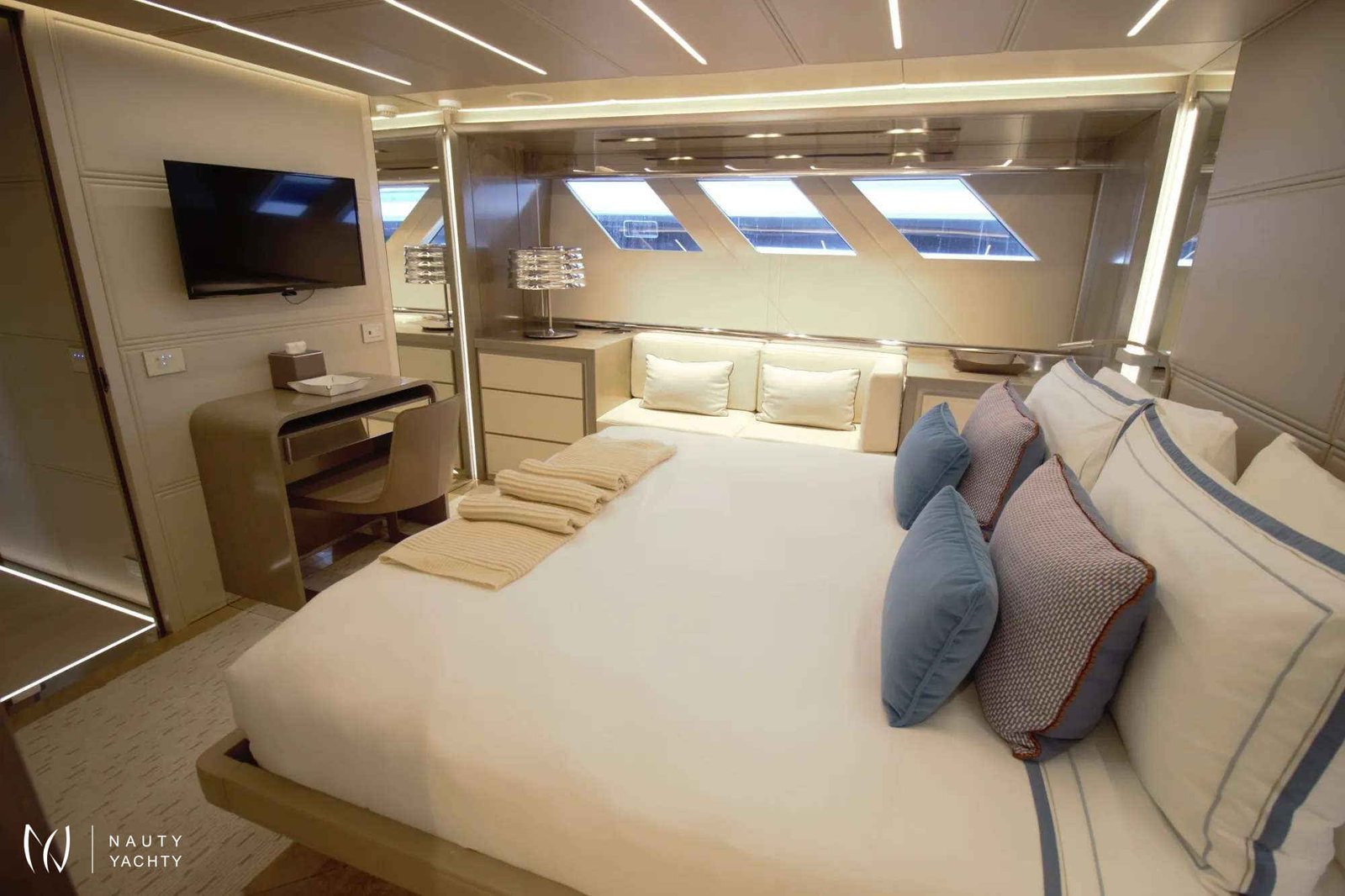 The interior of The Peddler is a sanctuary of comfort and elegance, designed to host up to 12 guests in absolute serenity. Her intelligent four-cabin layout includes three sophisticated double cabins and one versatile convertible cabin, making her the ideal choice for families and groups of friends. Every moment on board is an invitation to relax, from sunbathing on her spacious decks to enjoying bespoke alfresco meals with breathtaking backdrops.