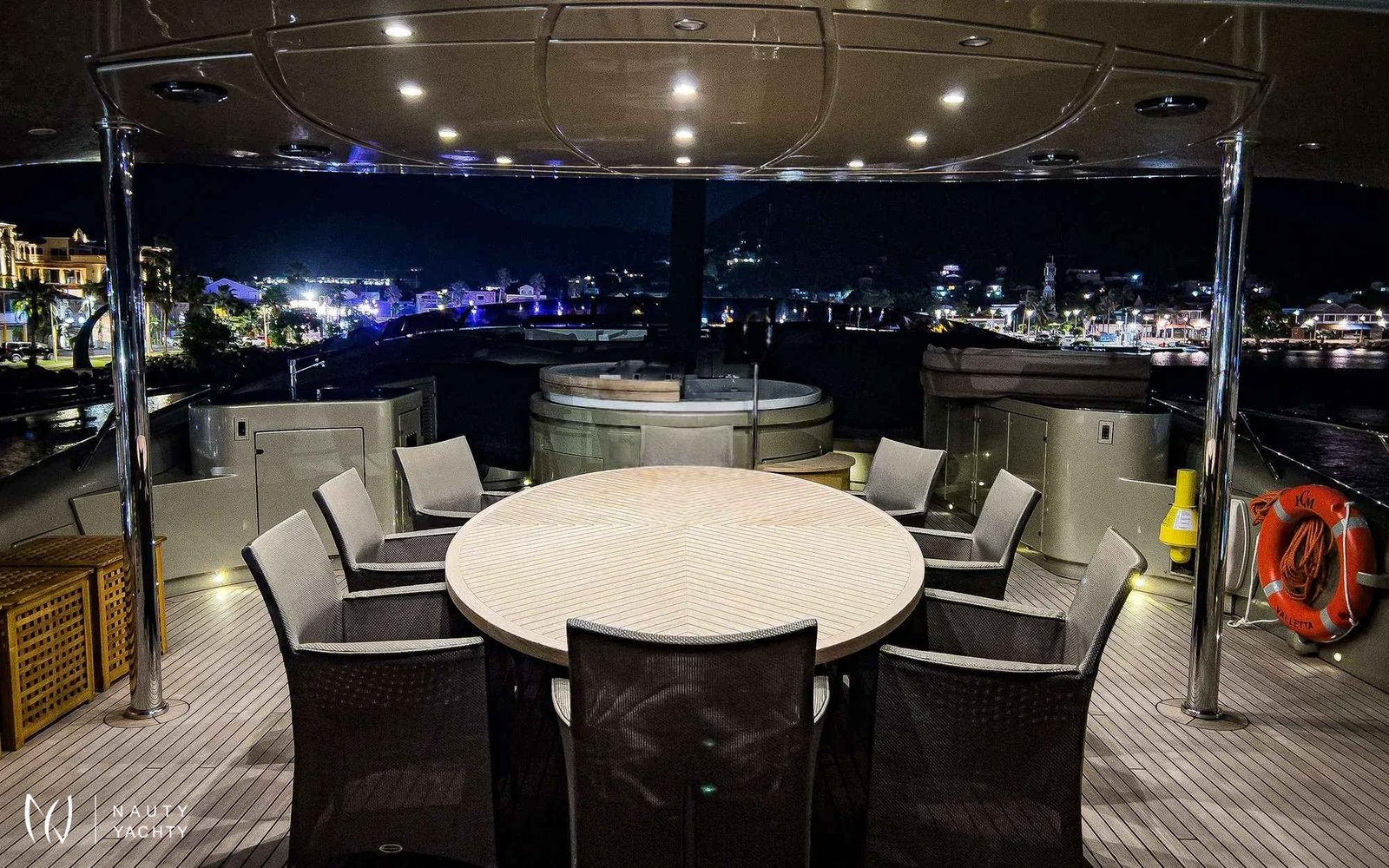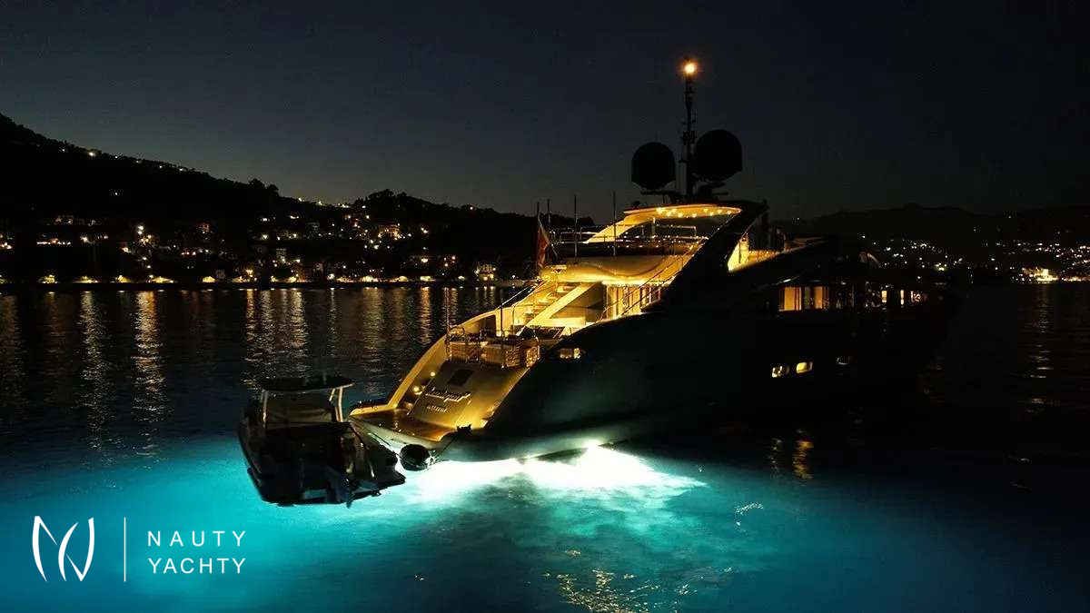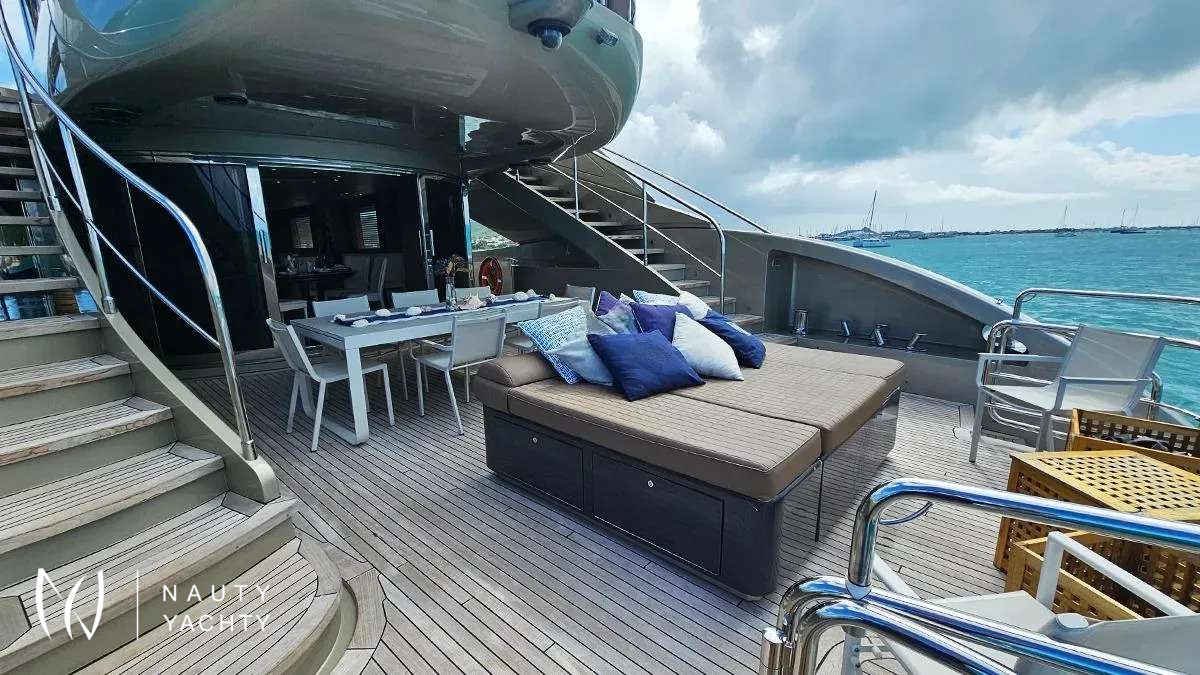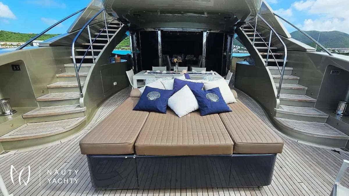 Her expansive deck spaces are an entertainer's dream, featuring a bubbling Jacuzzi with panoramic views and multiple areas for sunbathing or alfresco dining. Inside, a serene sanctuary awaits. The sophisticated interior, adorned in rich creams and calming blues, offers sumptuous accommodation for up to 12 guests. Her well-conceived layout includes: